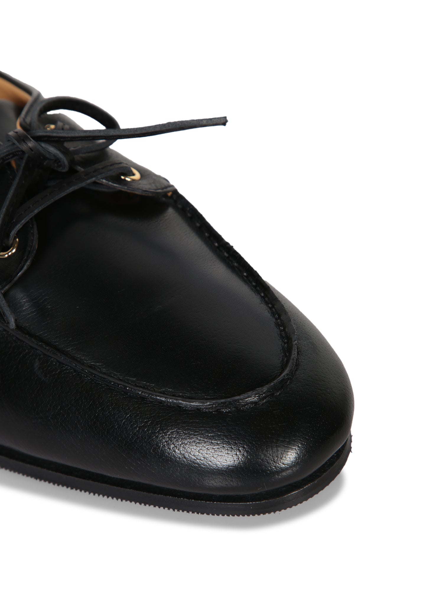 Black leather moccasin. Front lace-up design. Gold-tone metal details.