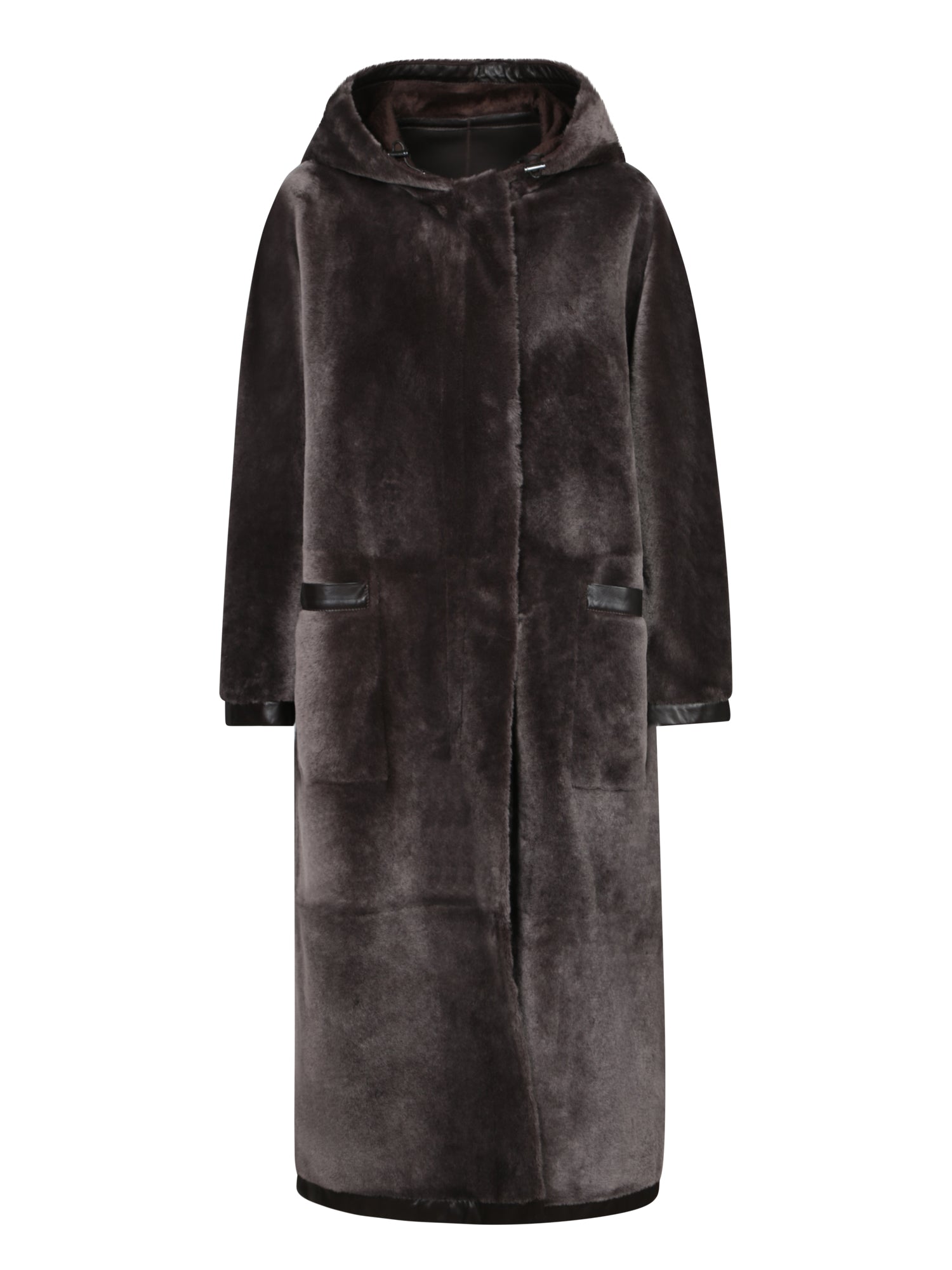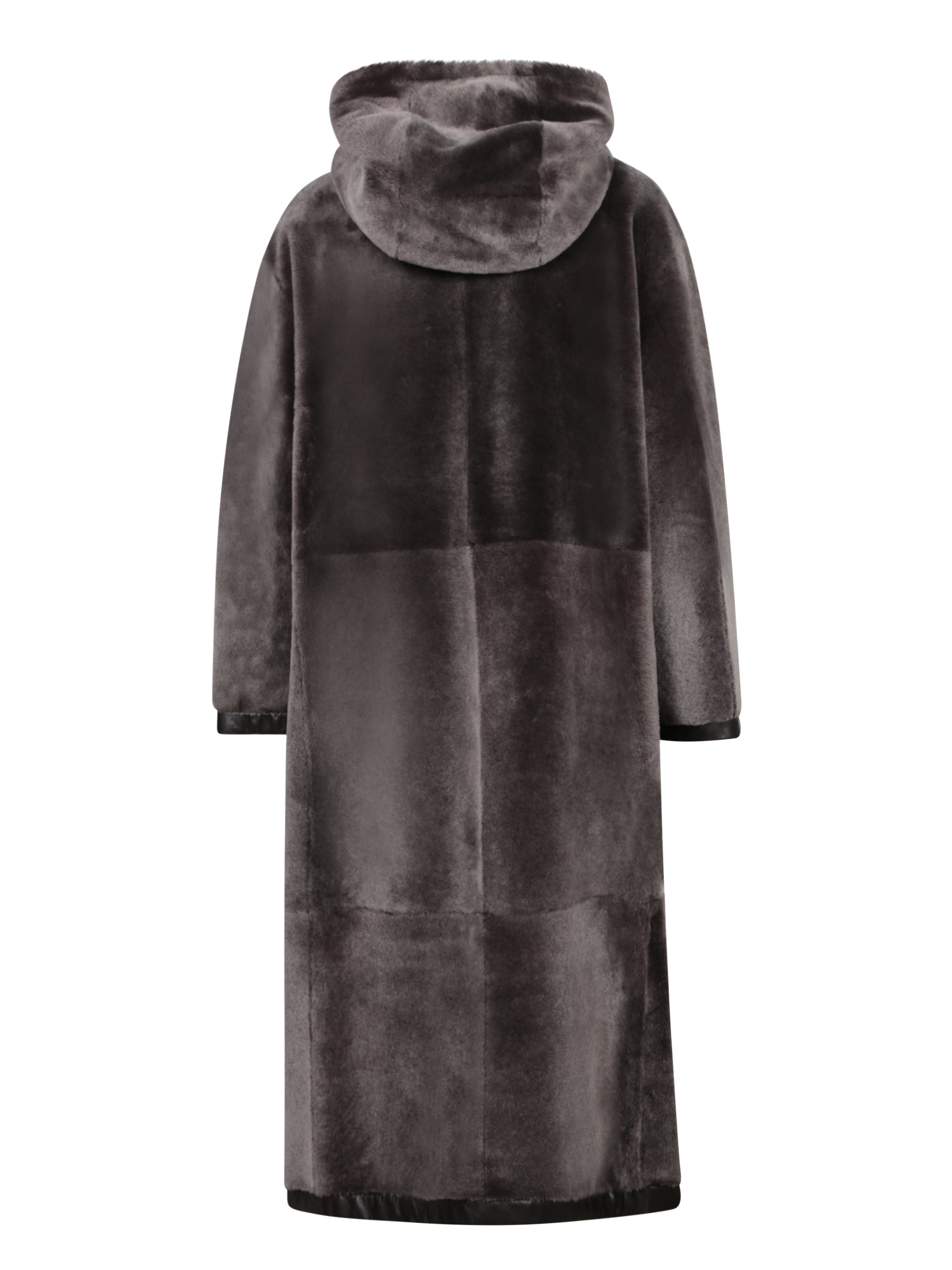 Wool coat with hood, patch pockets, and leather details. Front closure with hidden buttons.