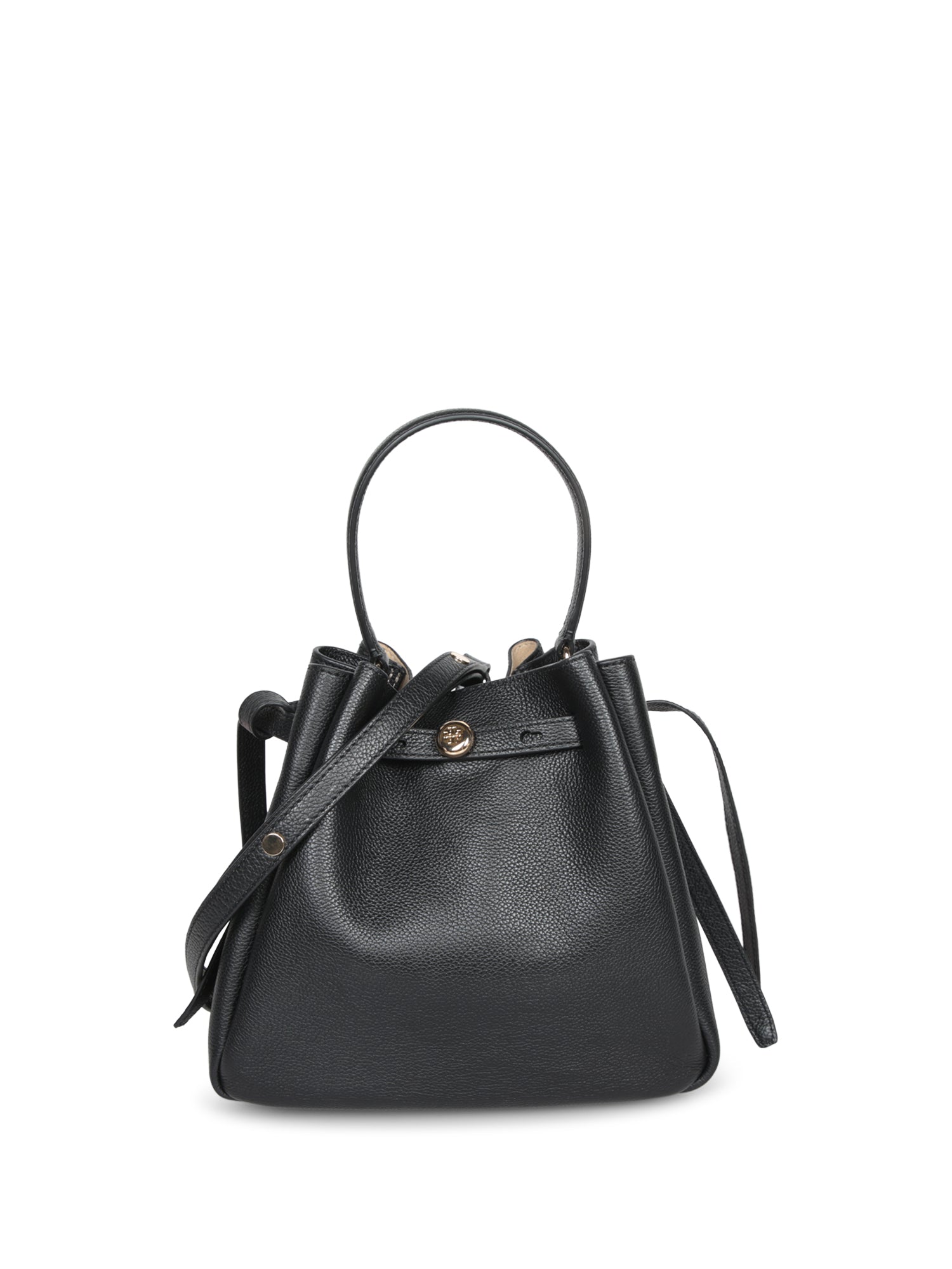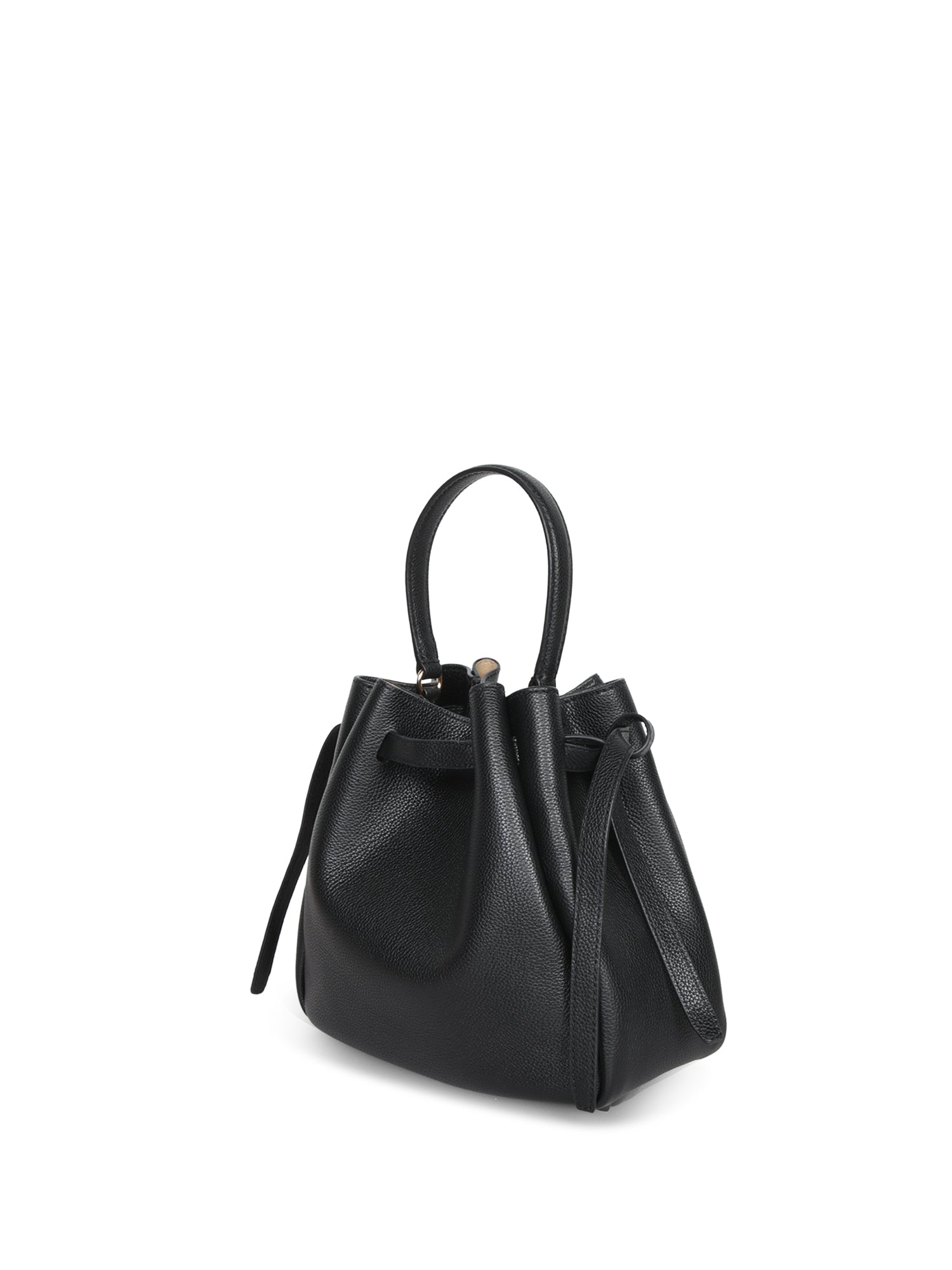 Black leather bag. Adjustable and removable shoulder strap. Drawstring closure.