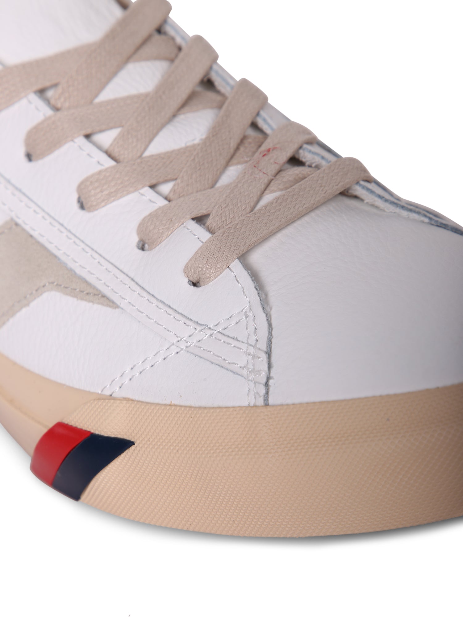 High-quality white leather. Silver details. Tone-on-tone side stripes. Beige rubber sole with colorful accents.