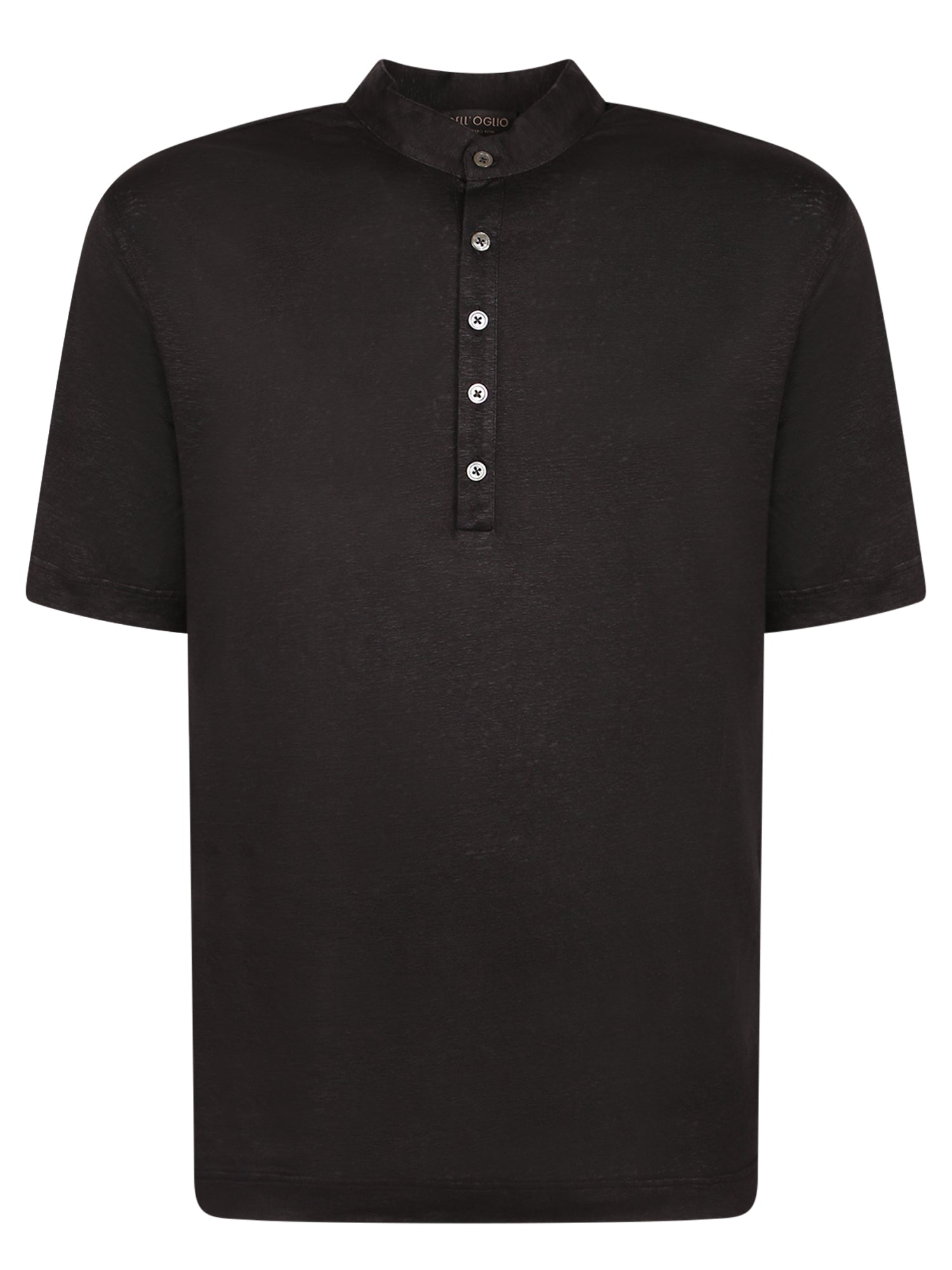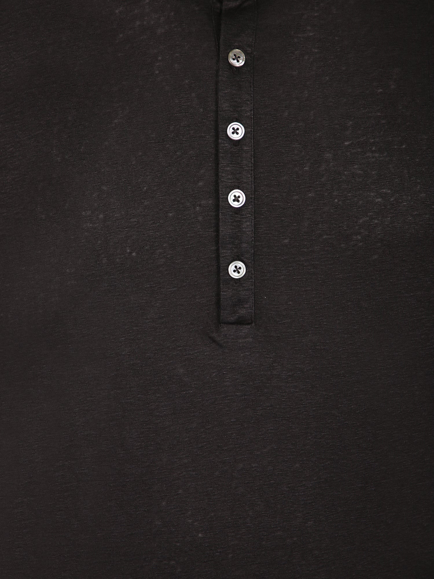 Linen jersey. Mandarin collar. Front button closure. Short sleeves.