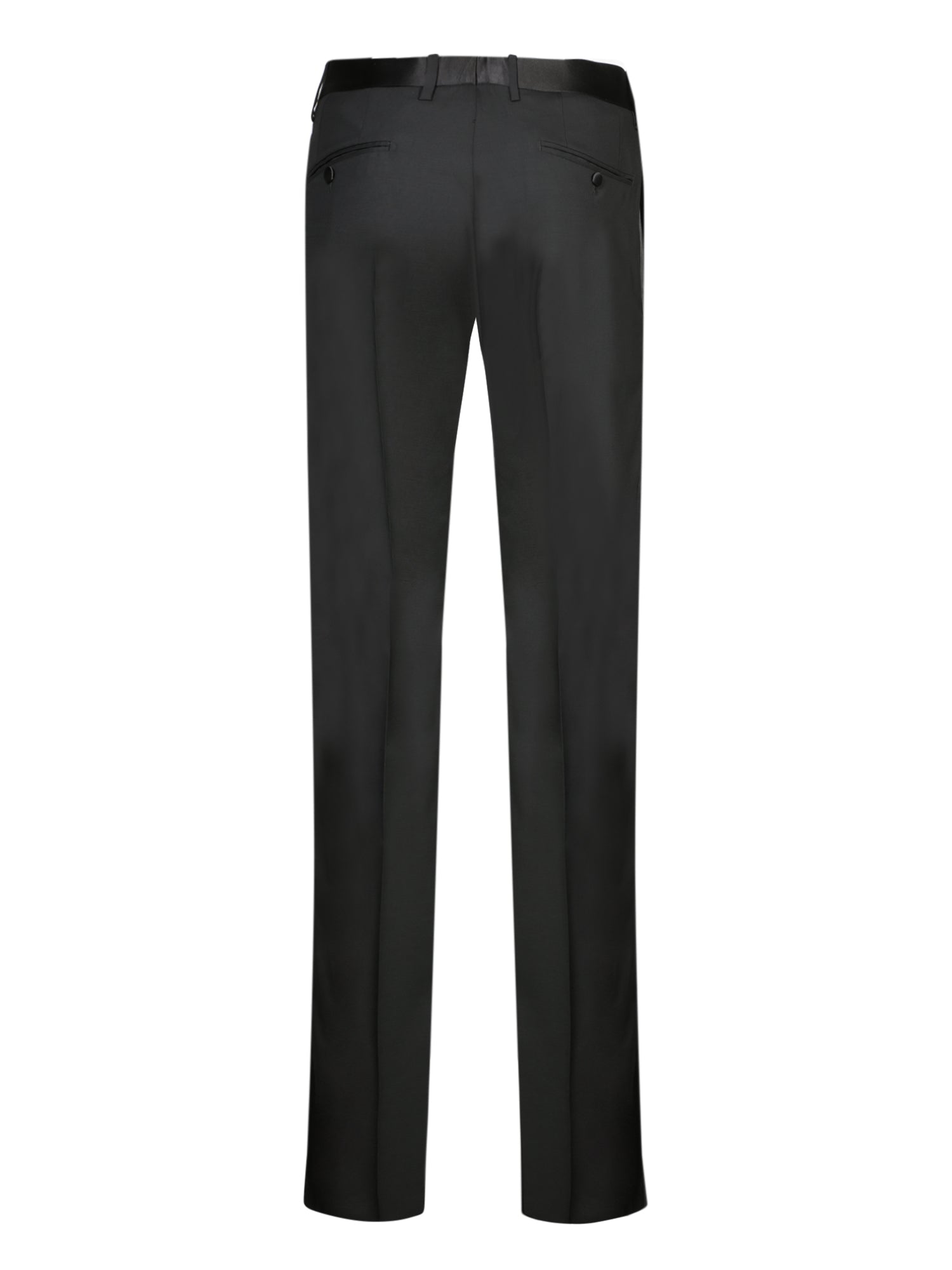 Elegant straight-cut trousers. Two side pockets and two back welt pockets. Thin belt loops.