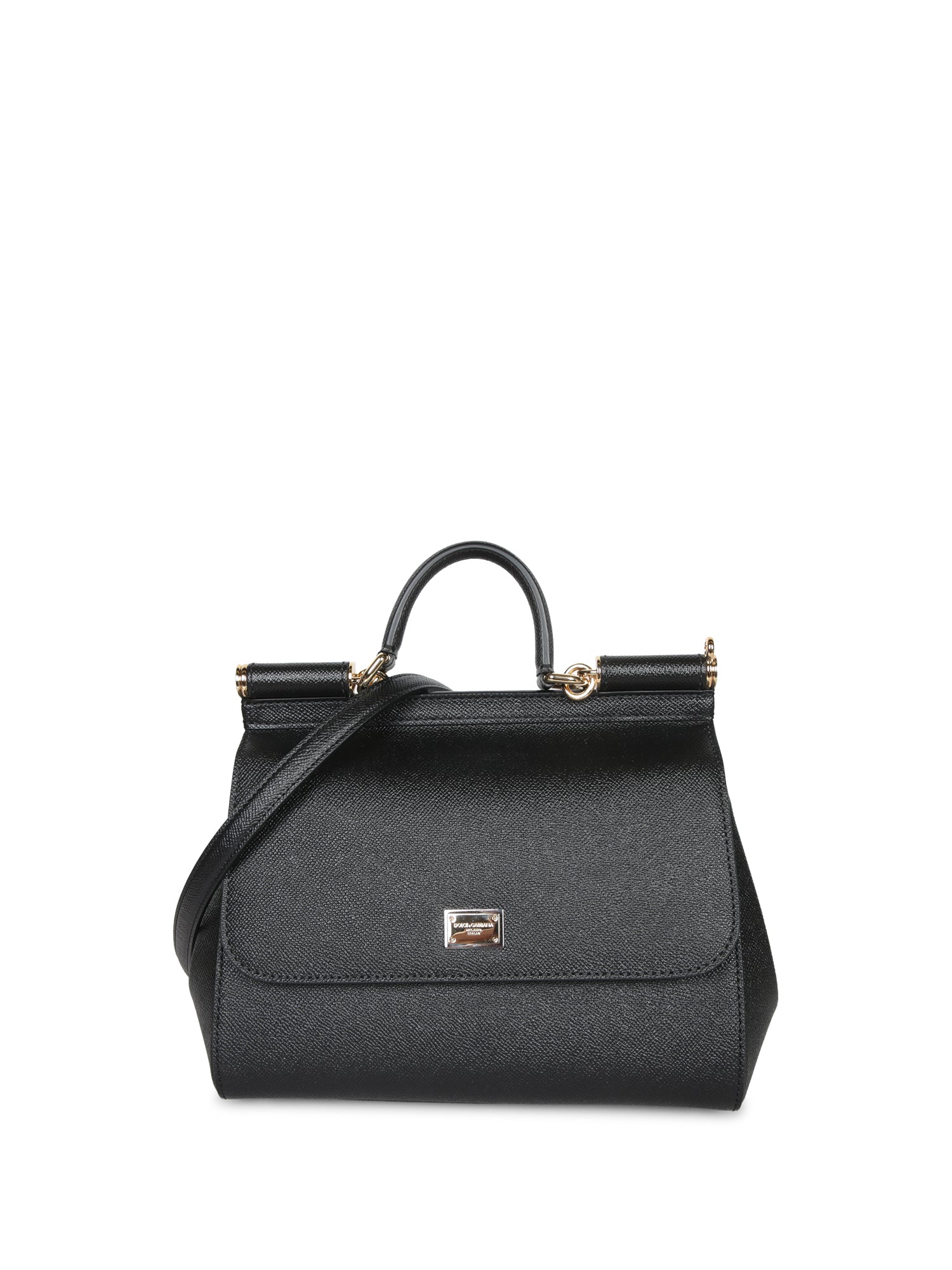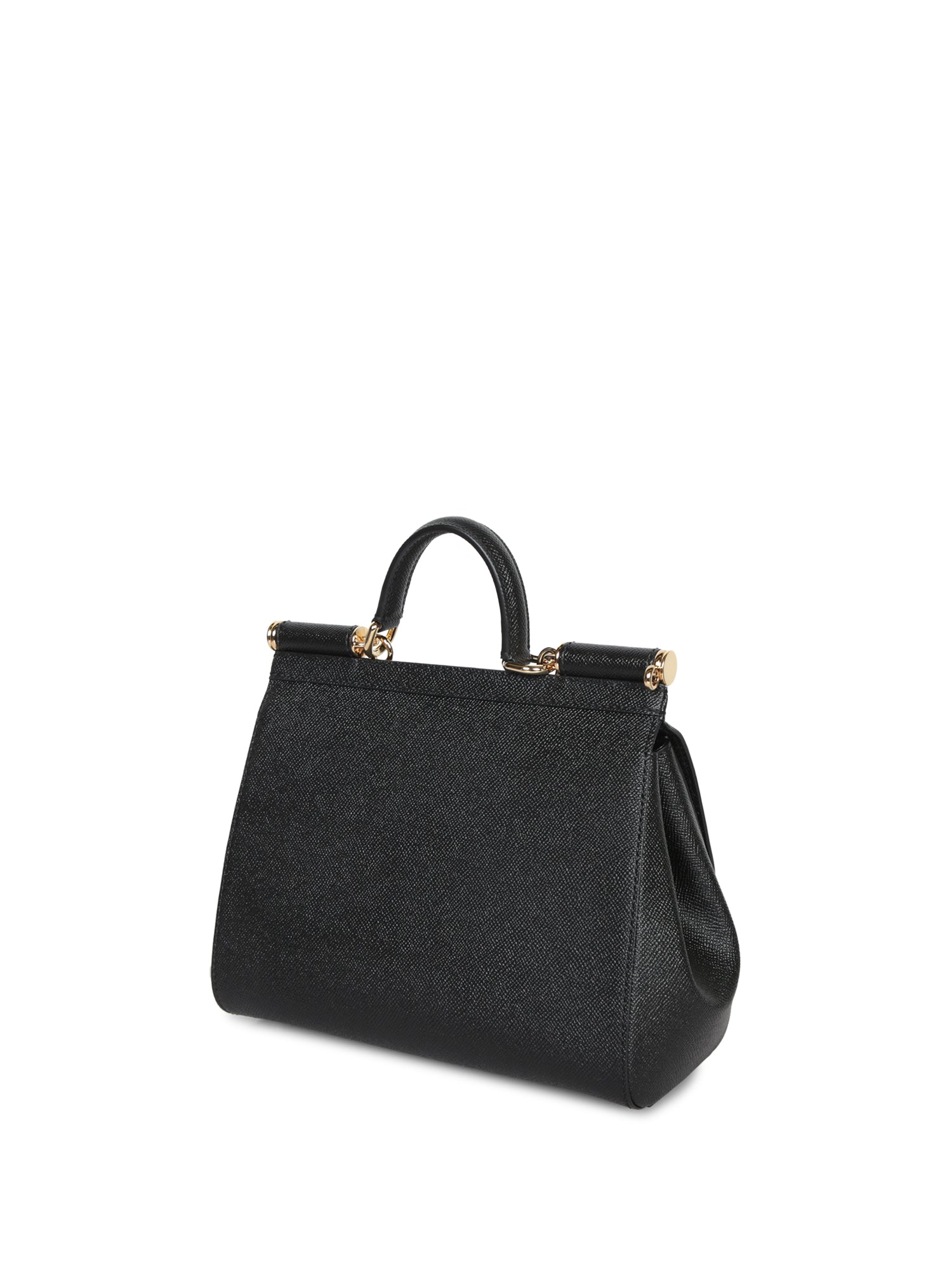 Elegant Dolce & Gabbana Sicily bag in black leather, accented with gold-tone hardware for an undeniable touch of class. Designed with a practical removable shoulder strap and a unique snap closure that ensures both security and style.