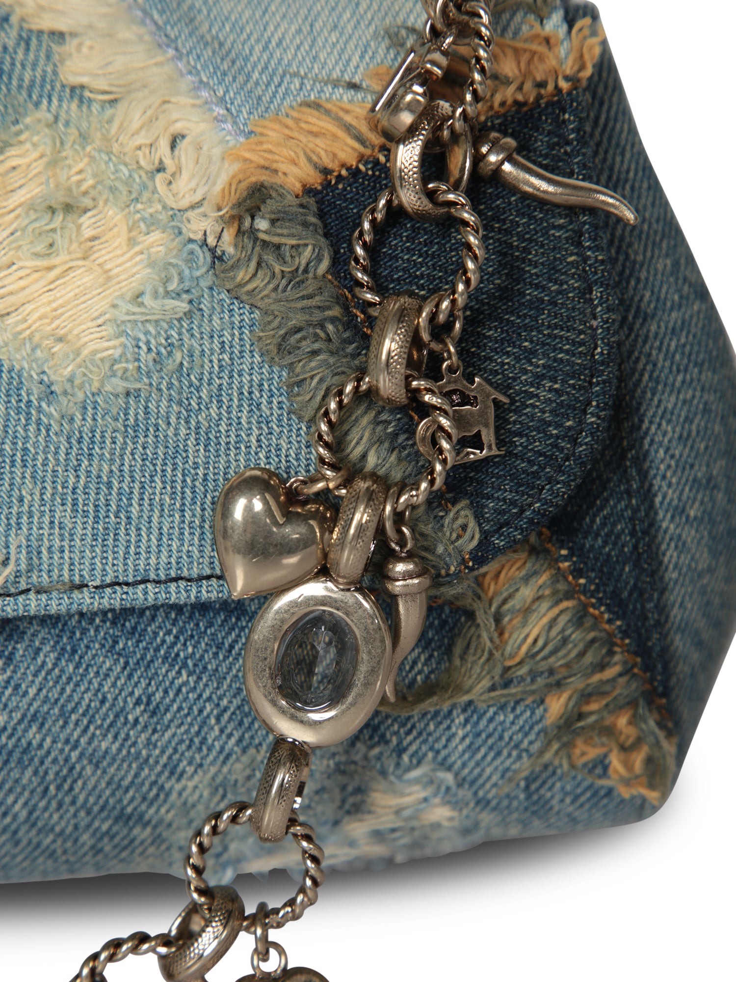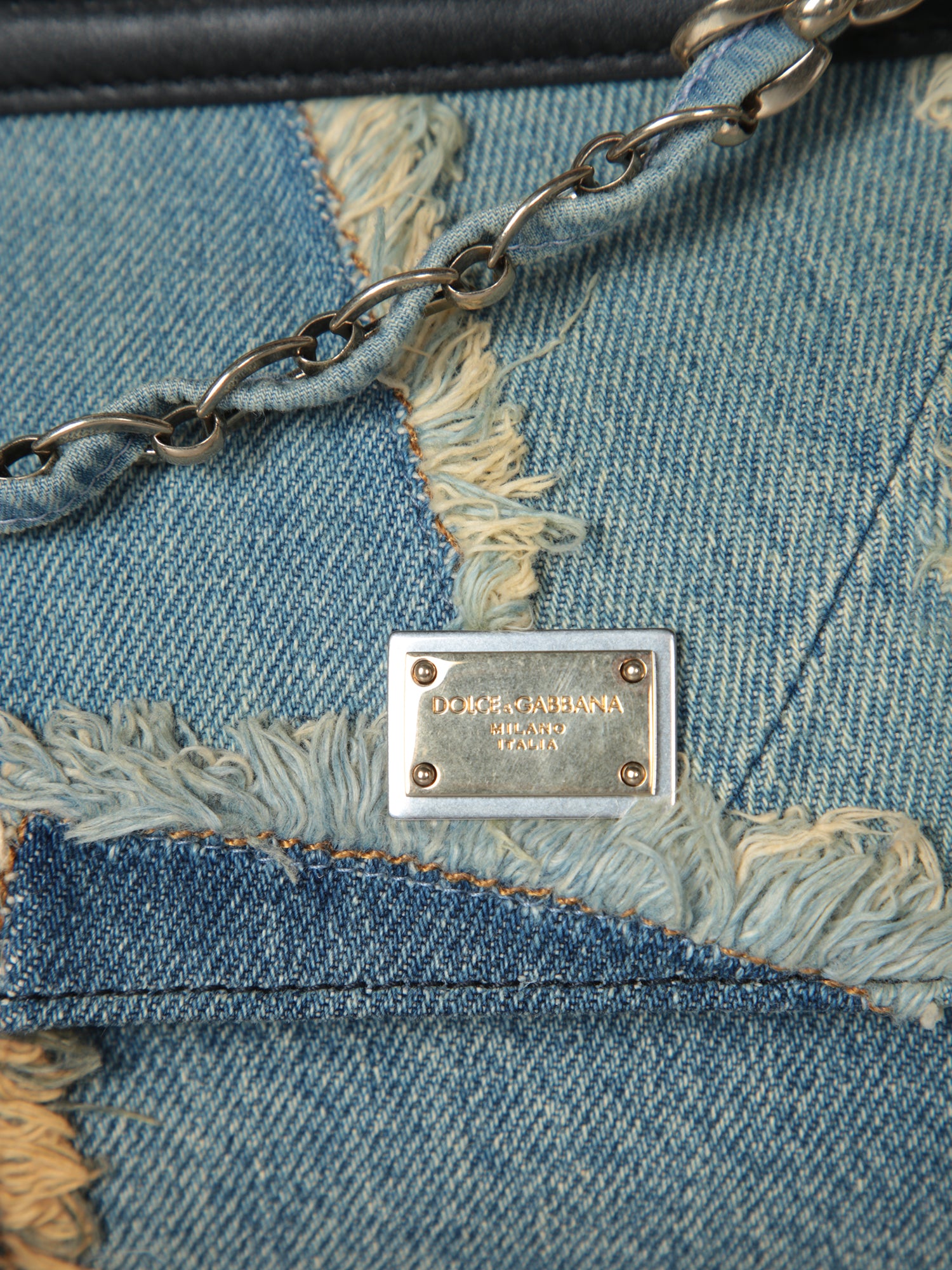 This Dolce & Gabbana's Sicily bag reimagines denim in a luxurious way with patchwork inserts and leather trim. Complete with a decorative chain strap and charms, it features opulent details that capture the essence of the brand.