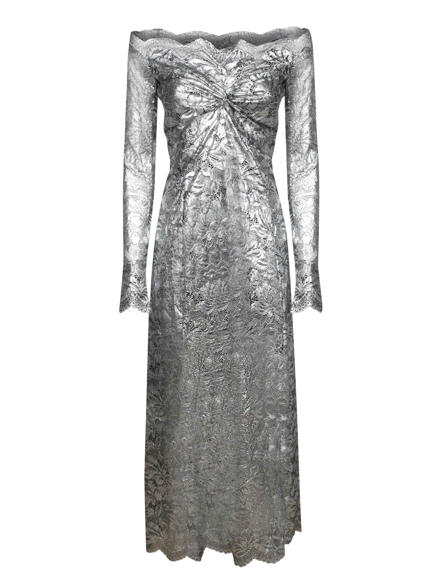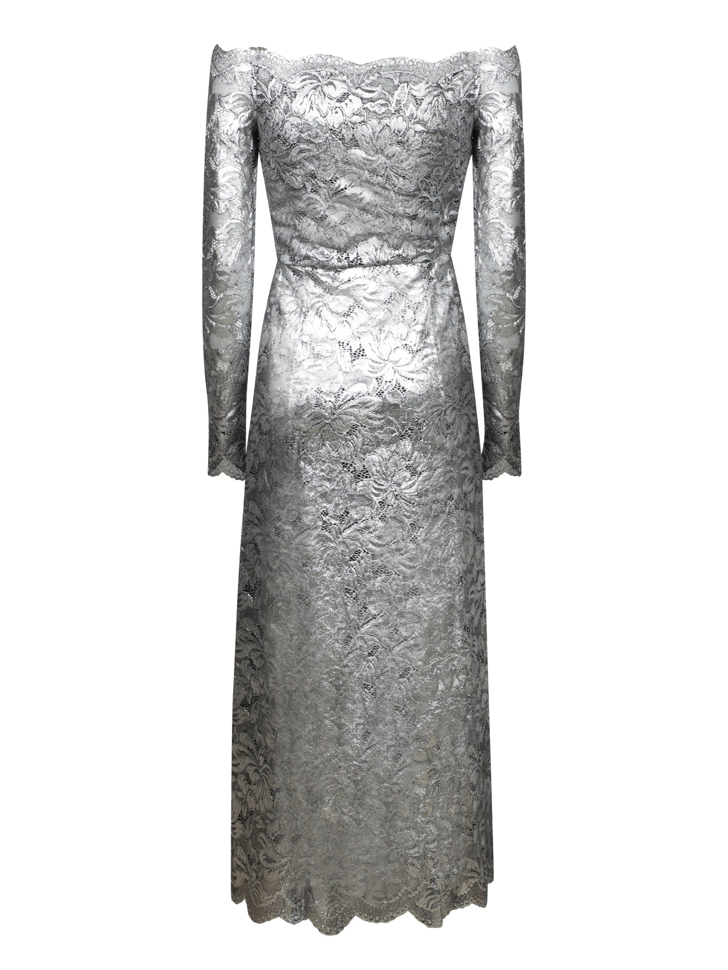 Long dress with long sleeves, sweetheart neckline, and coated lace fabric. Shiny silver finish.