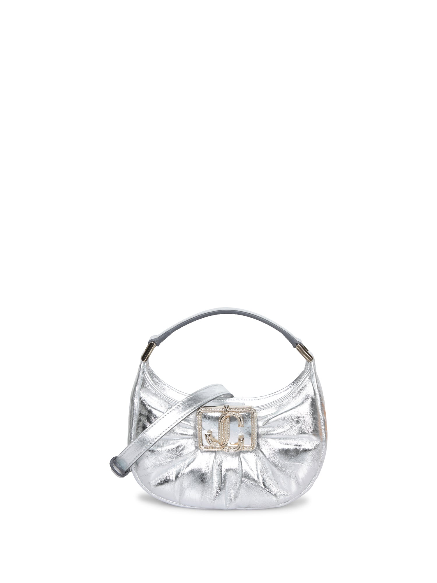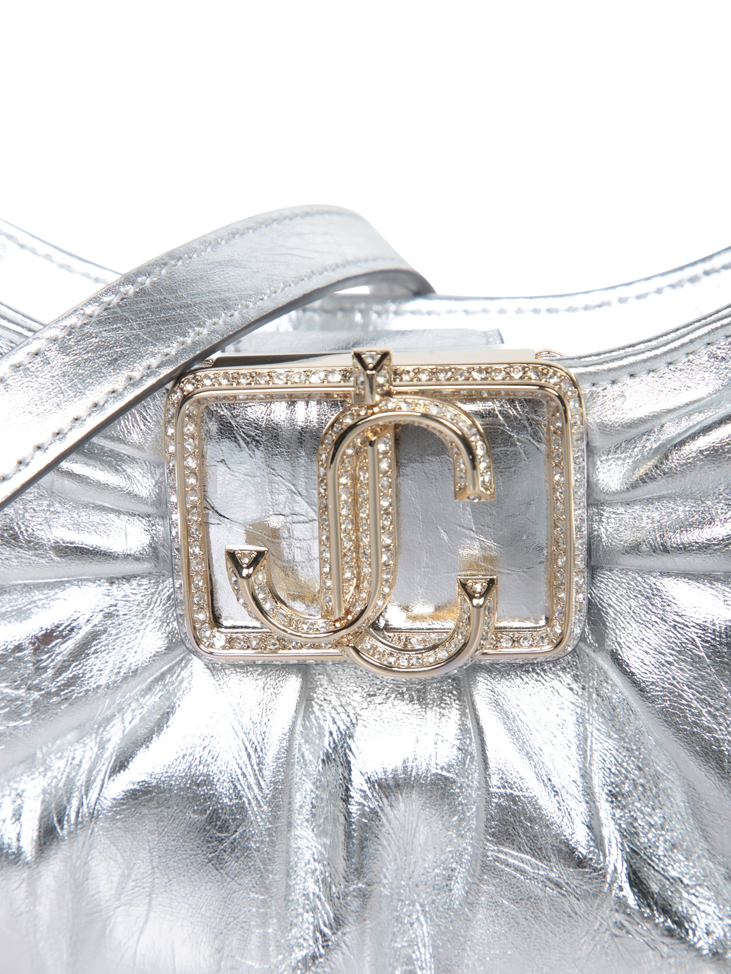 Elegant Jimmy Choo silver leather bag with a shiny metallic finish. A practical accessory equipped with an adjustable shoulder strap for personalized comfort and a golden closure detail that enhances the design.