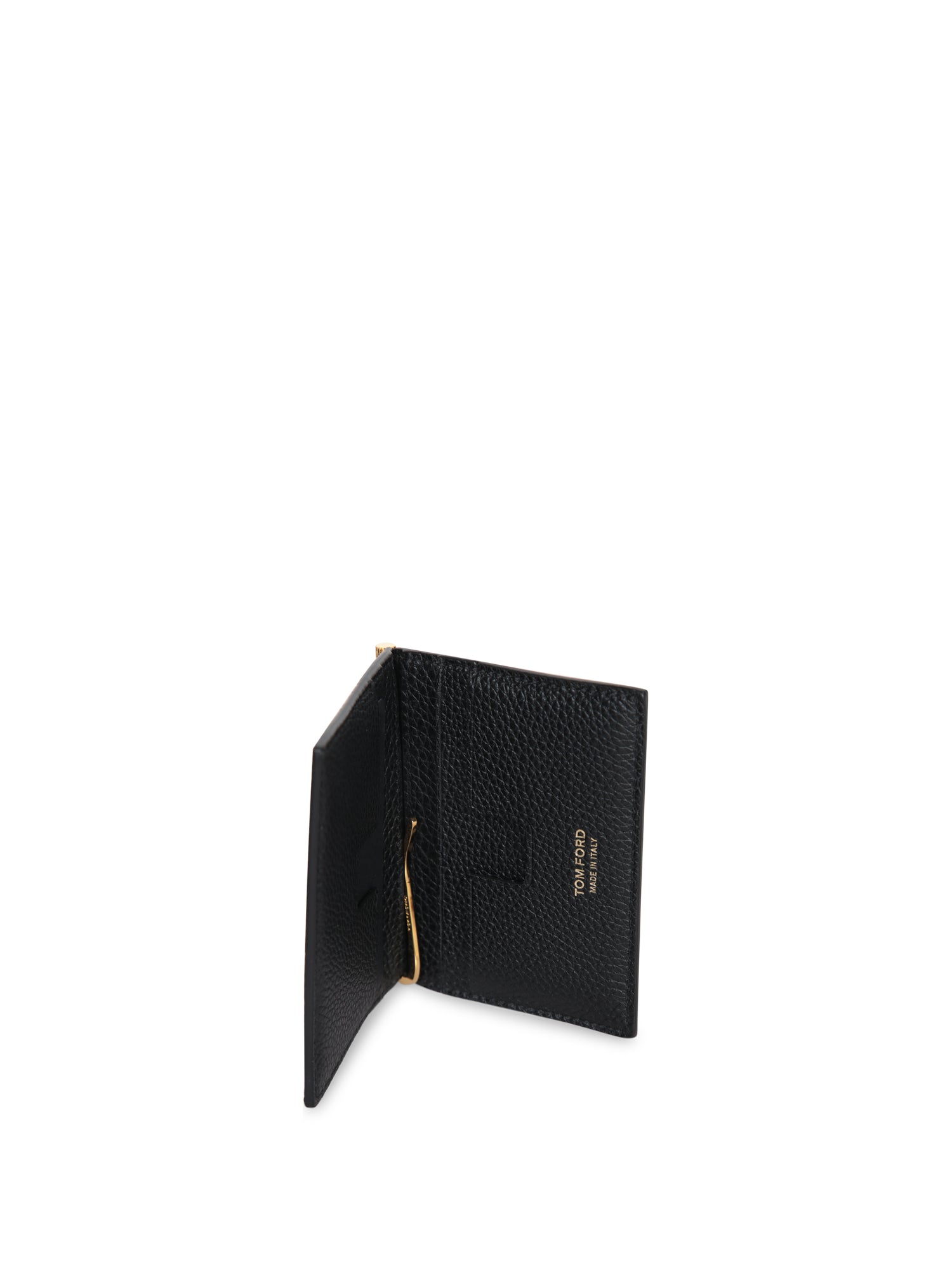 Black leather card holder with money clip. Golden frontal logo, metallic details.