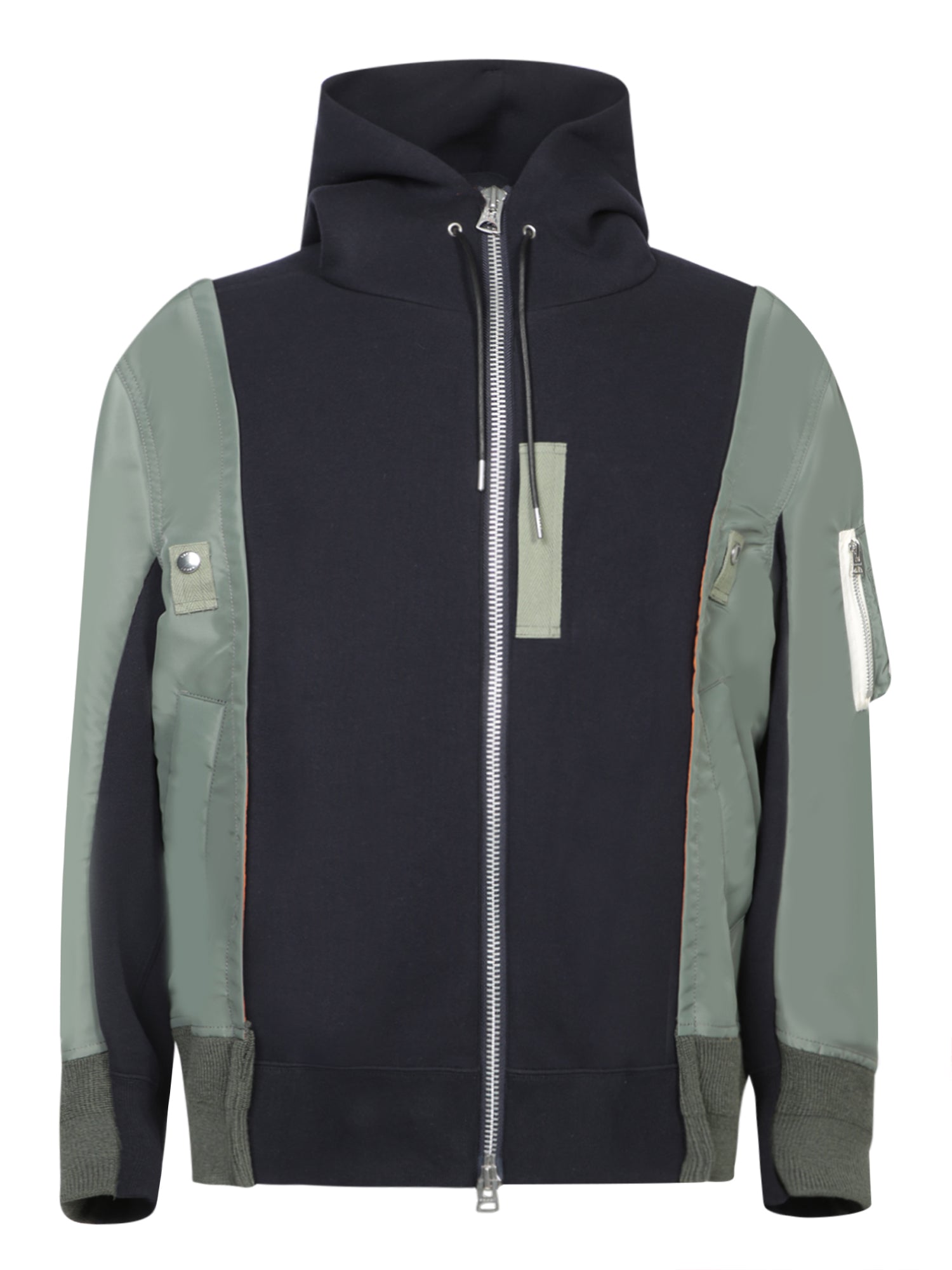 Hooded jacket in sponge fabric. Long sleeves with tone-on-tone nylon inserts and ribbed cuffs. Front zip closure.