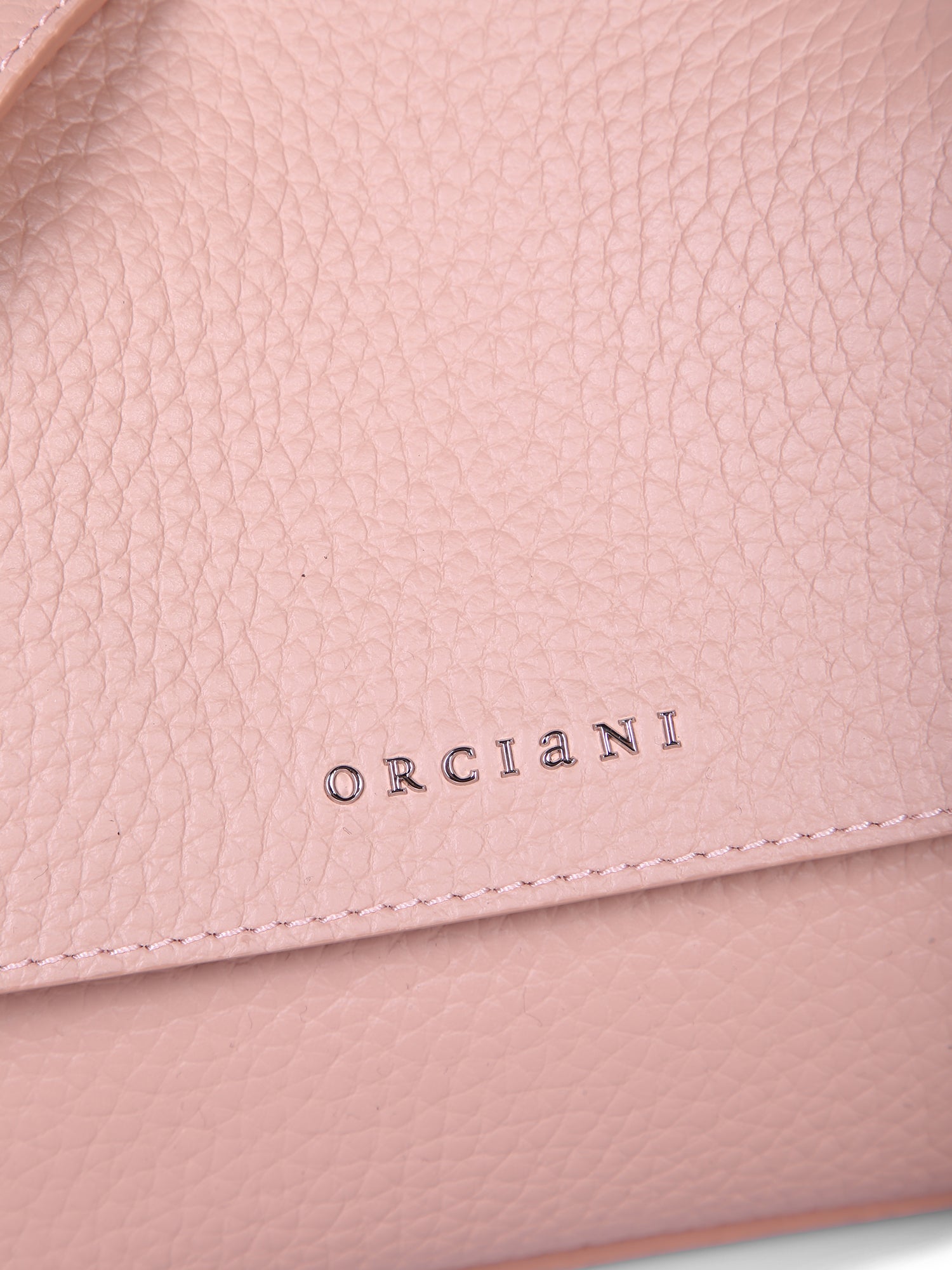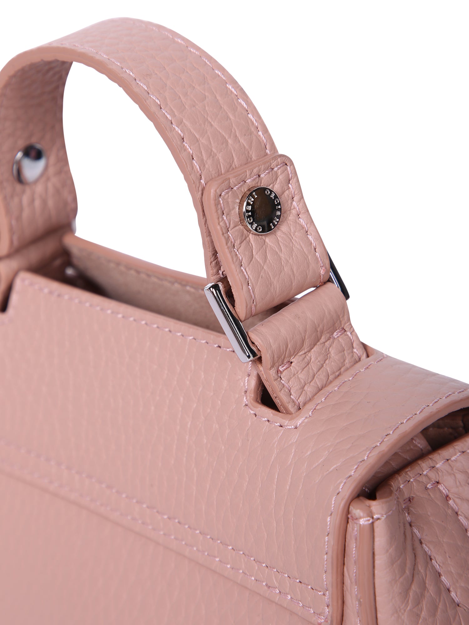 Fine textured leather bag. Single handle and adjustable, detachable strap. Magnetic snap closure.