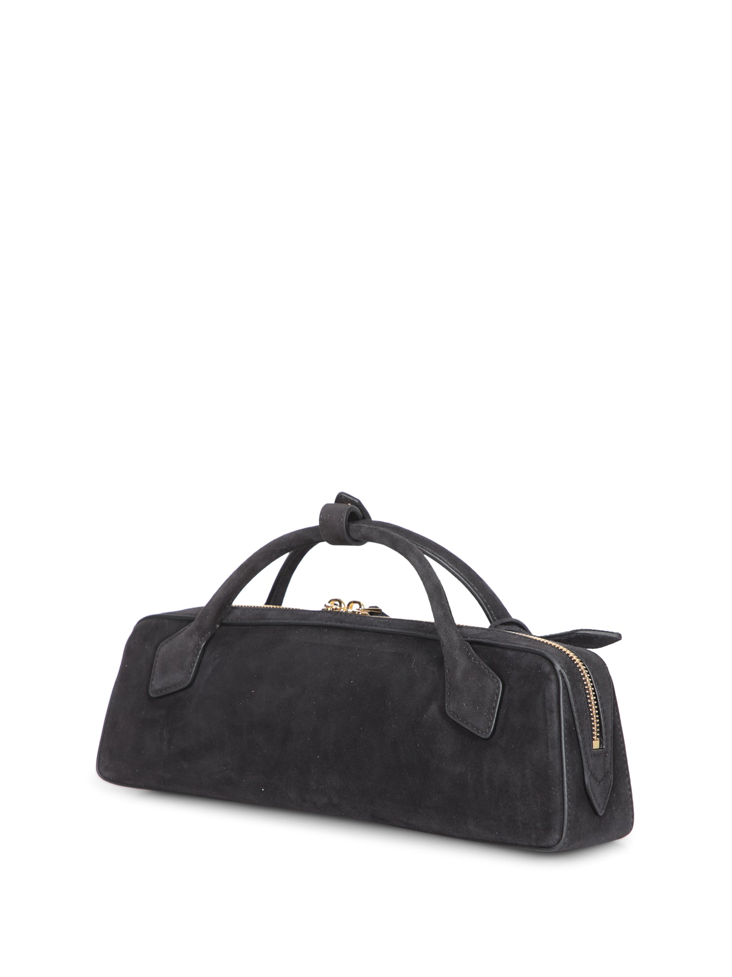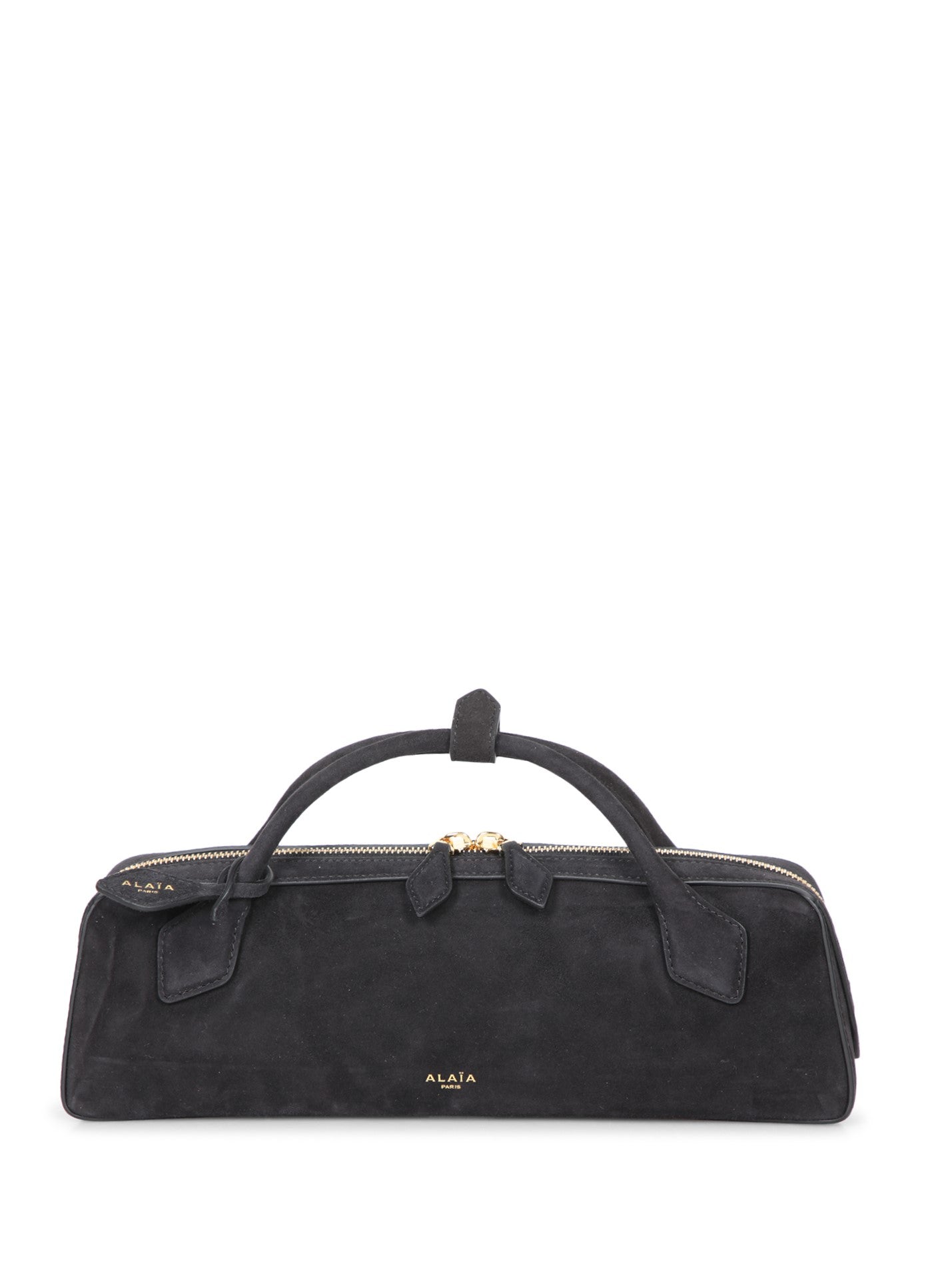 Luxurious suede clutch with gold metal details. Features a top zip closure and front engraved ALAIA logo.