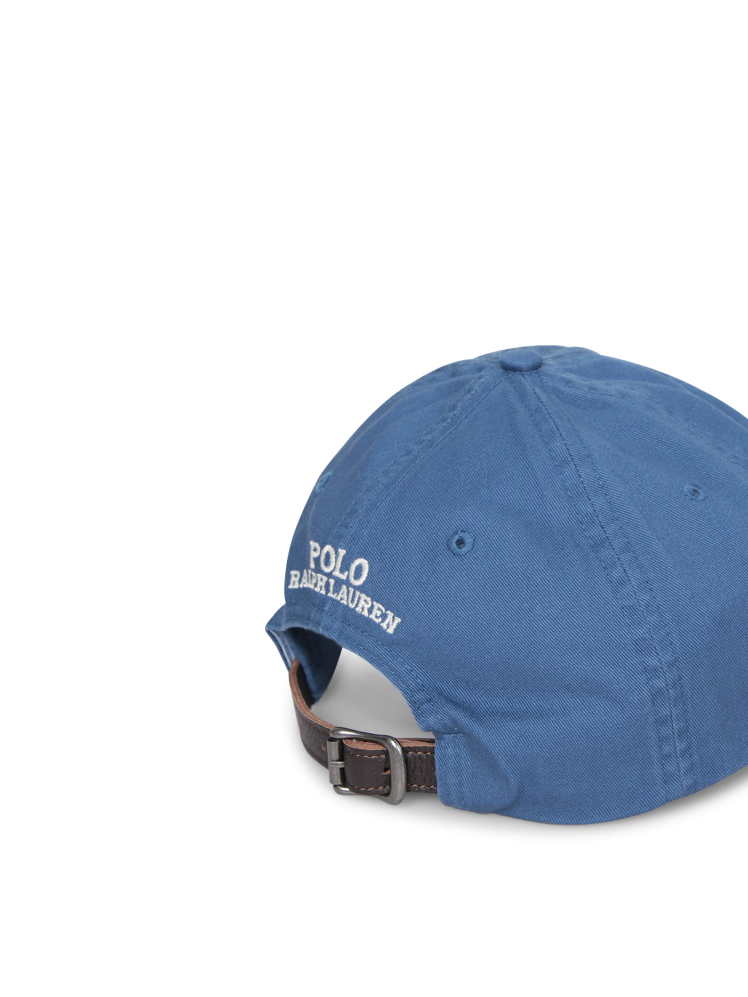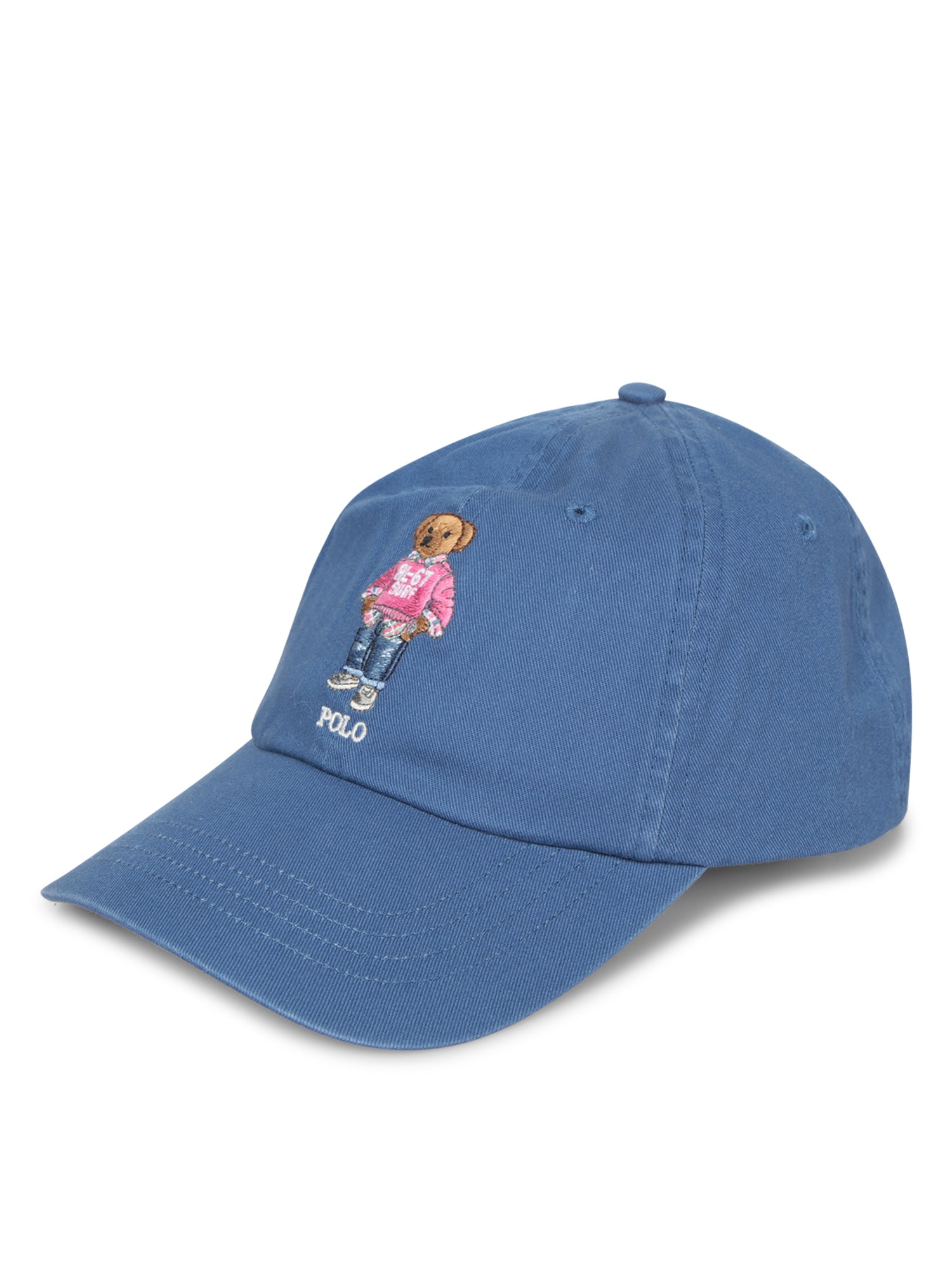 Iconic Polo Ralph Lauren baseball cap in vibrant blue, embellished with the unmistakable embroidered teddy in sporty attire. Perfect for adding a cheerful touch to your casual wear.
