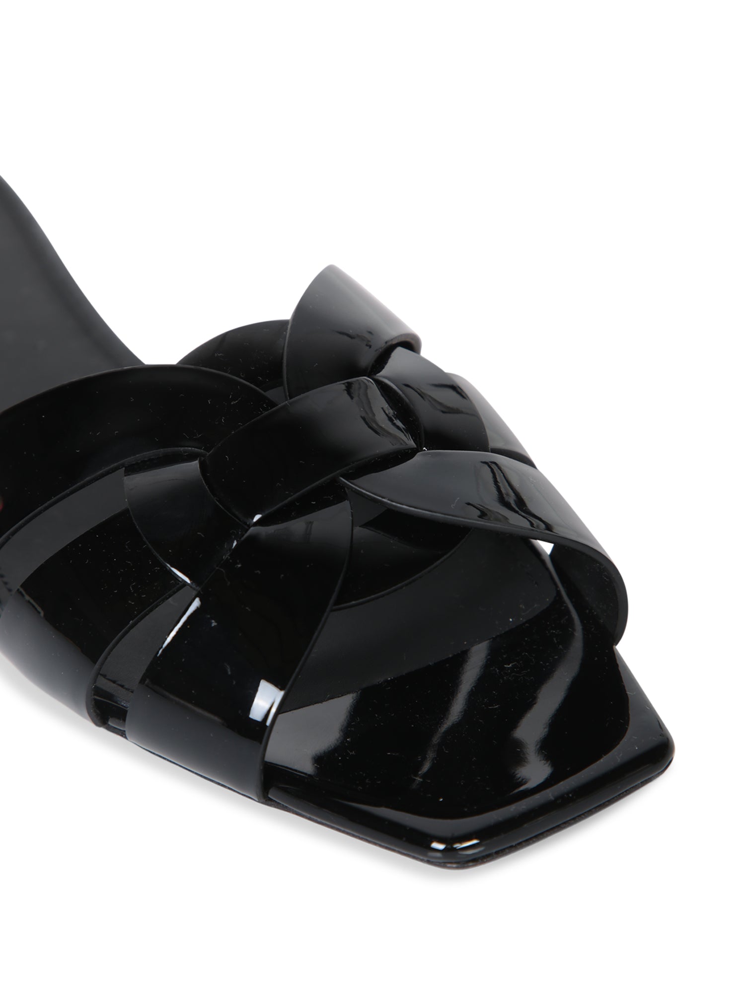 These elegant black sandals by Saint Laurent feature a minimalist design with glossy patent criss-cross straps, perfect for a sophisticated look on any occasion.
