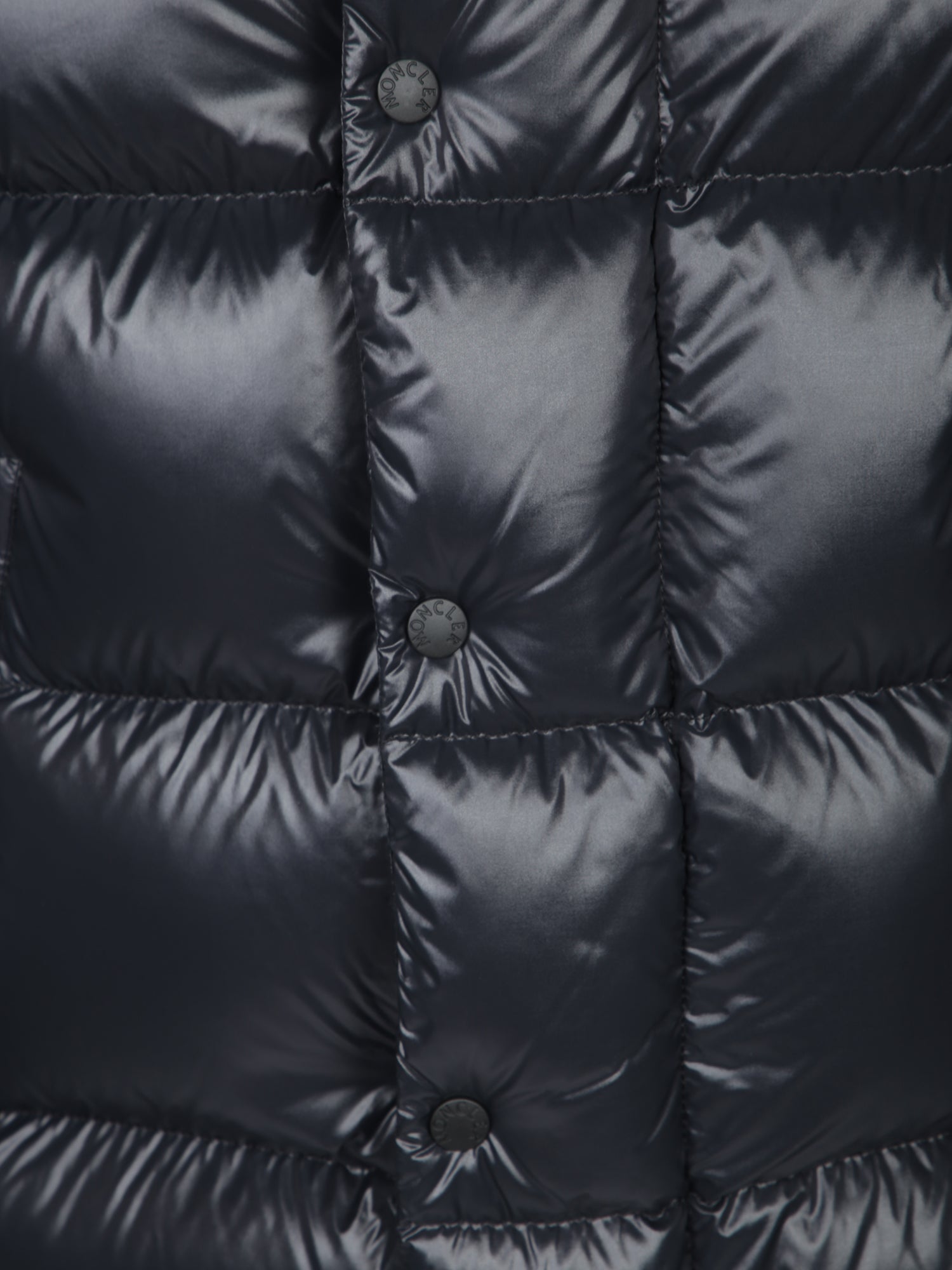 Padded down jacket, front button closure, high collar, long sleeves with elasticated cuffs.