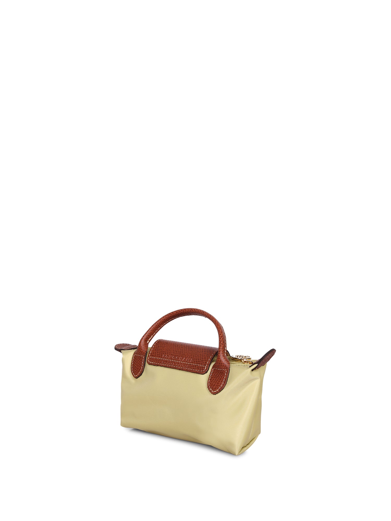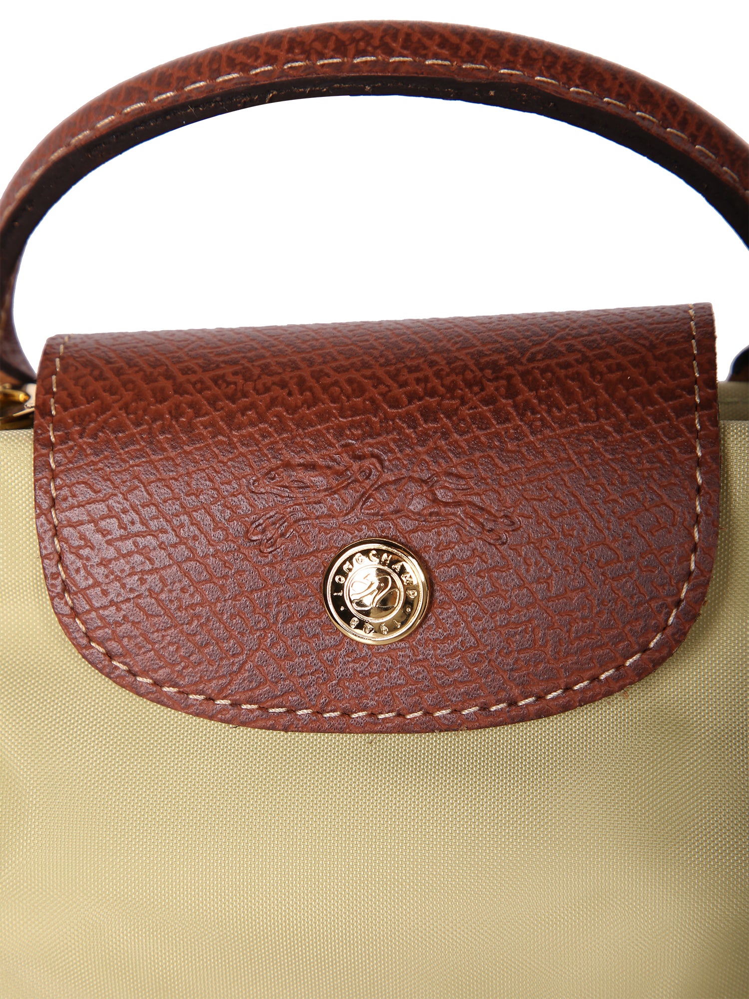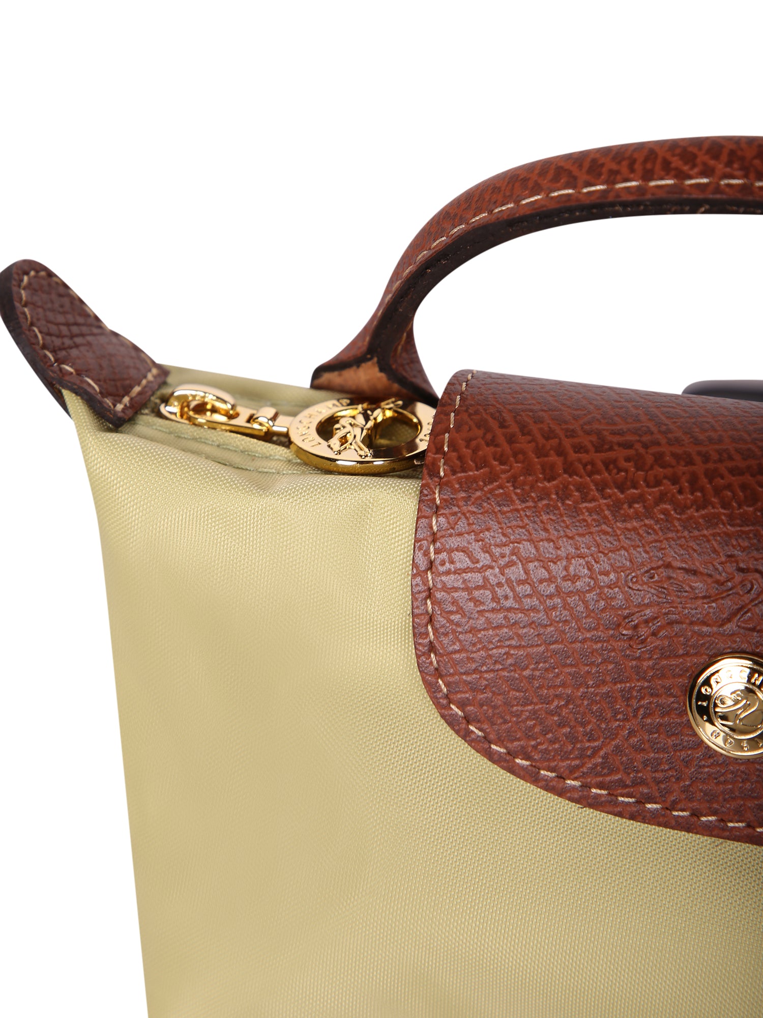 Nylon fabric. Brown leather details. Zip and snap closure.