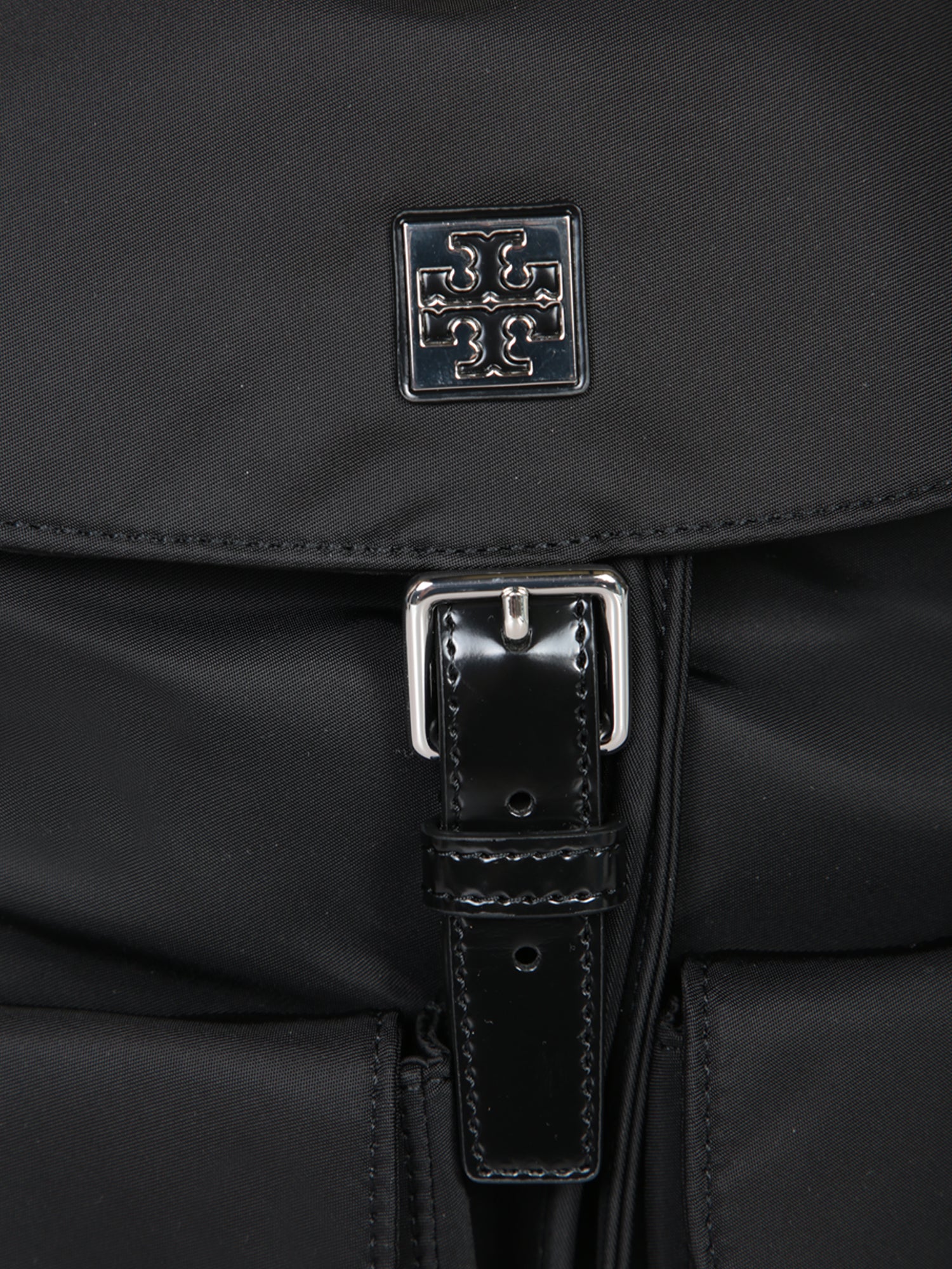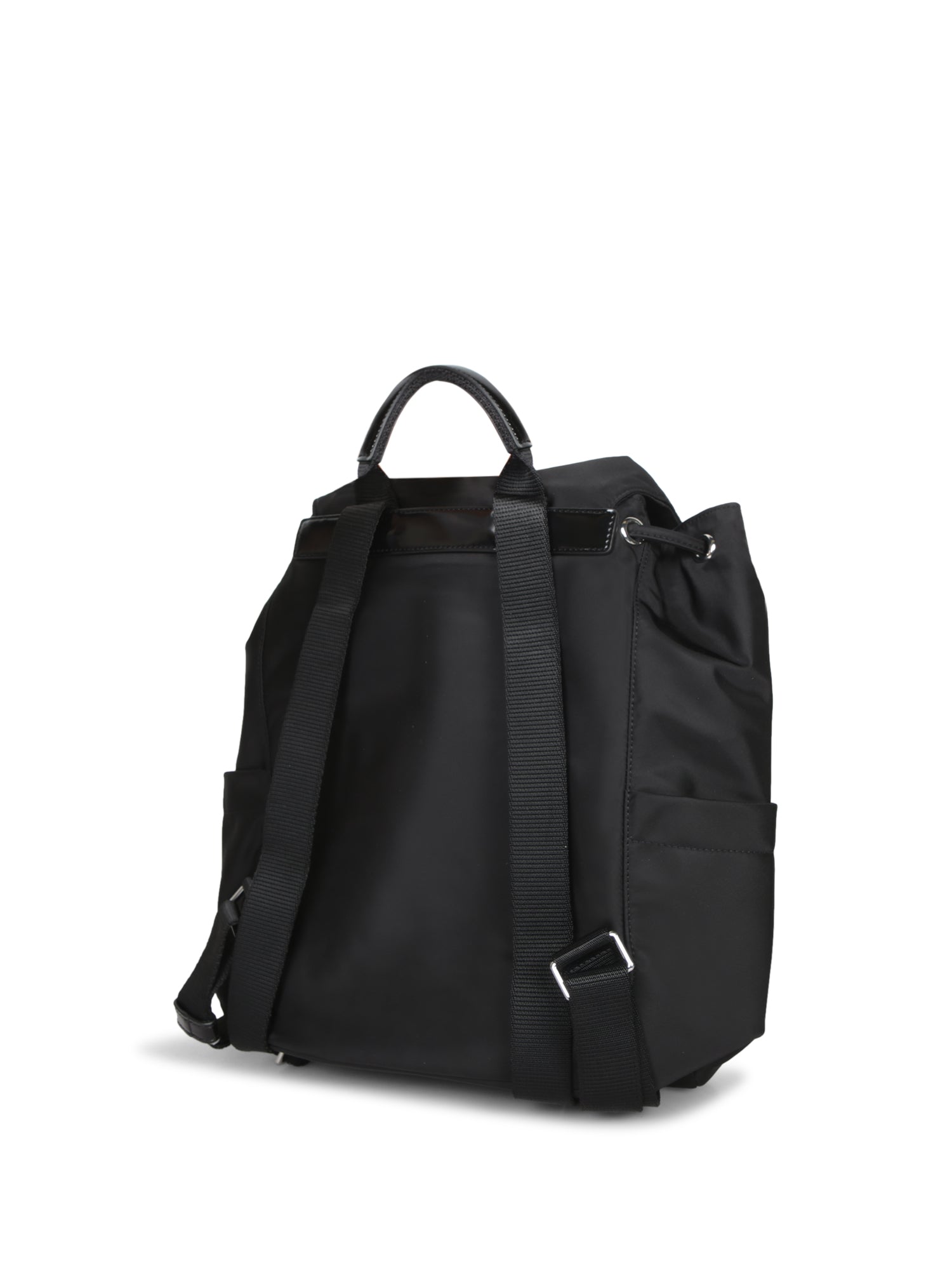 Black technical fabric backpack with leather details. Features front pockets with buckles and a drawstring top closure.
