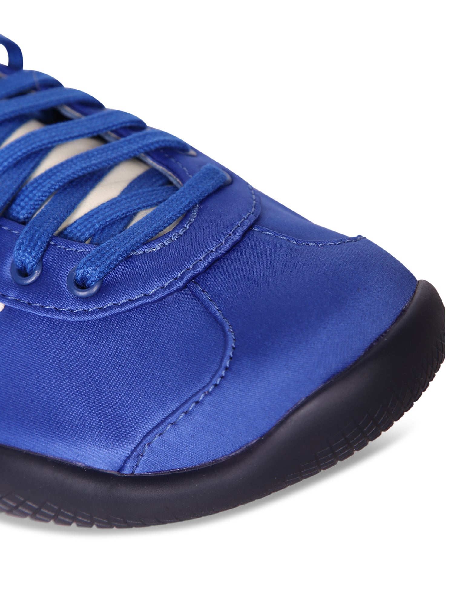 Vibrant blue satin upper. Leather details. Non-slip rubber sole.