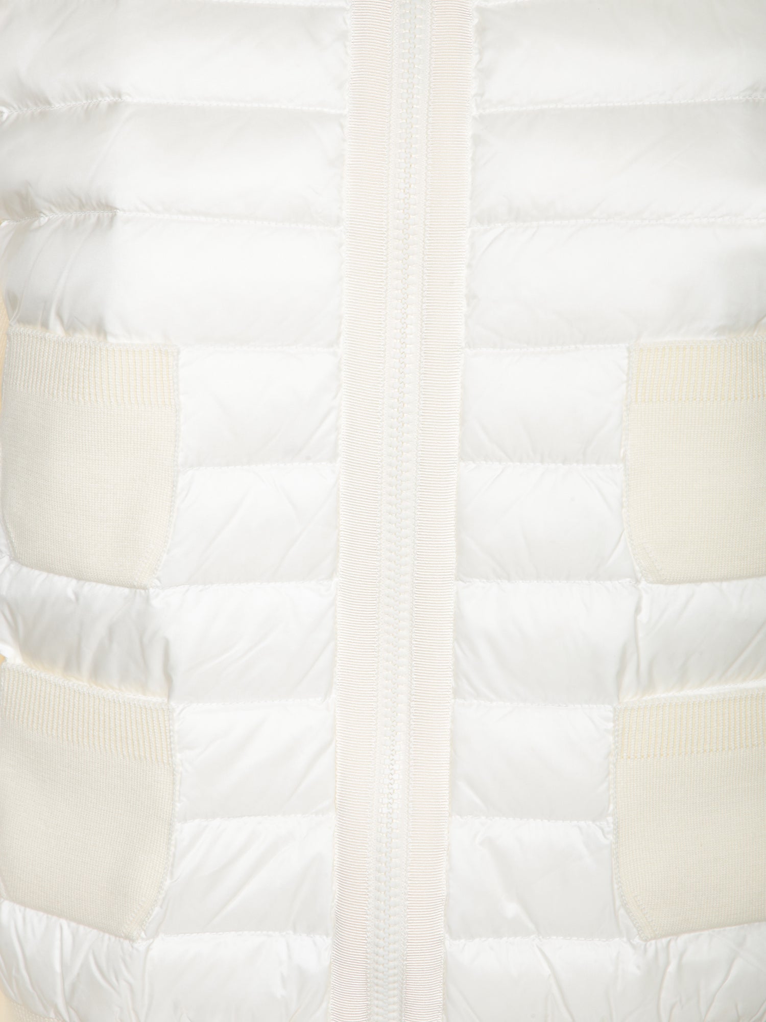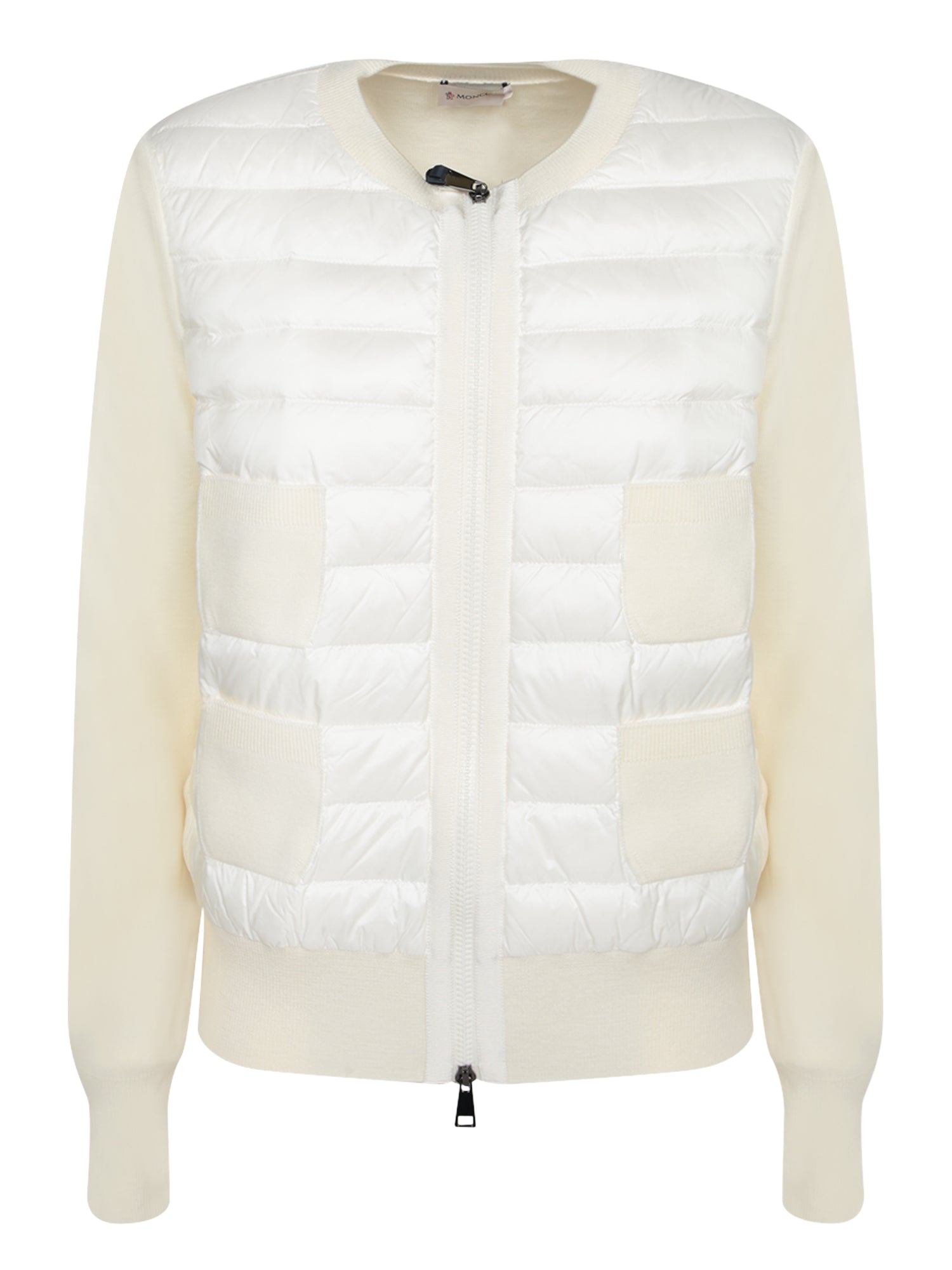 Cotton cardigan with padded inserts. Front zip closure. Patch pockets.