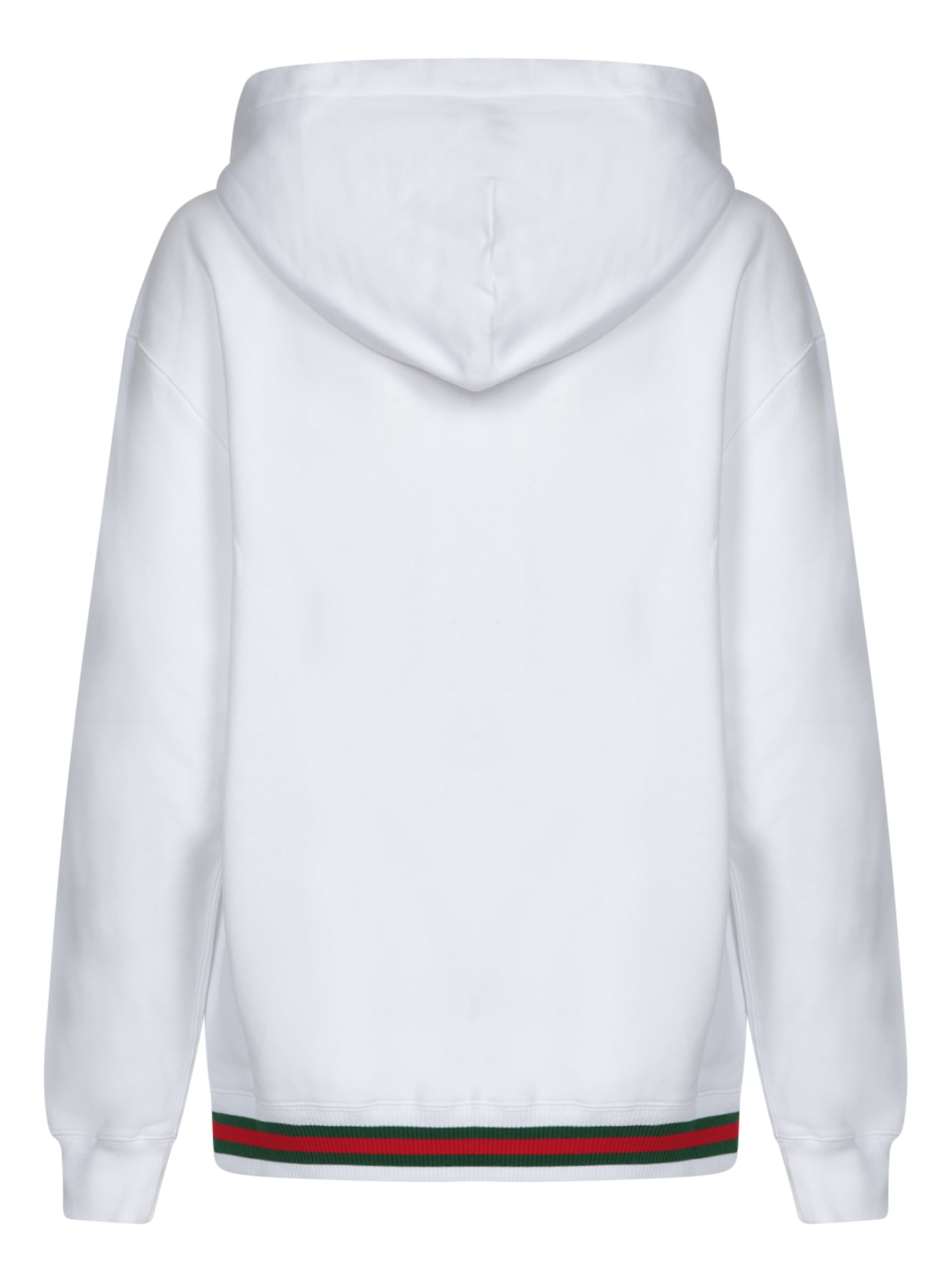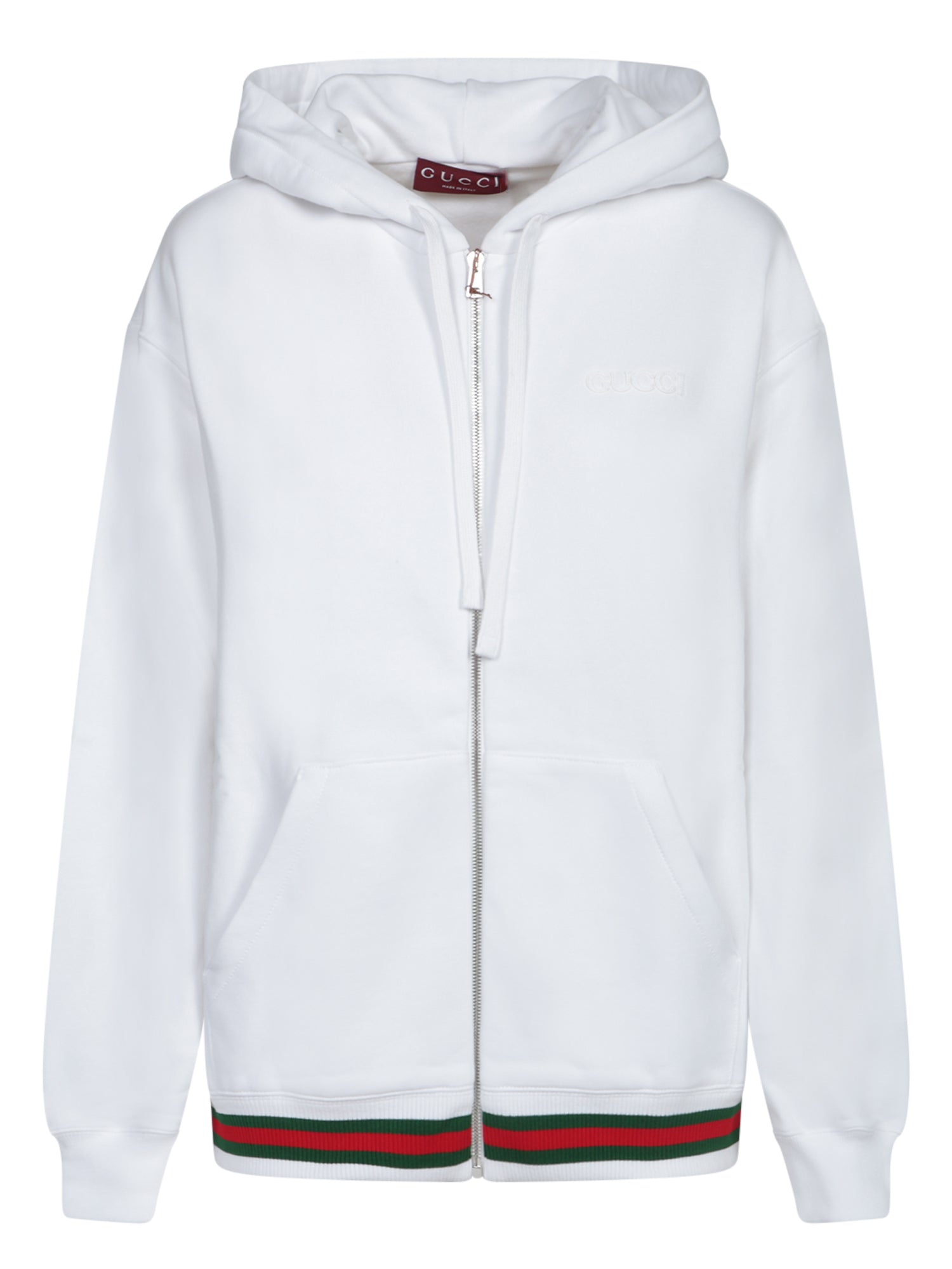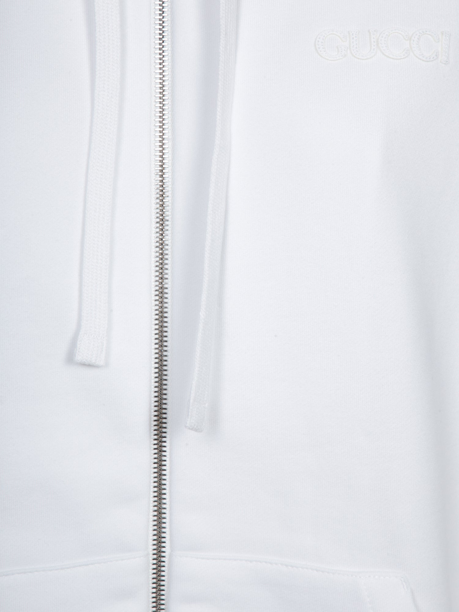 Hooded sweatshirt, front zip closure, kangaroo pockets. Tonal Gucci logo on the chest.