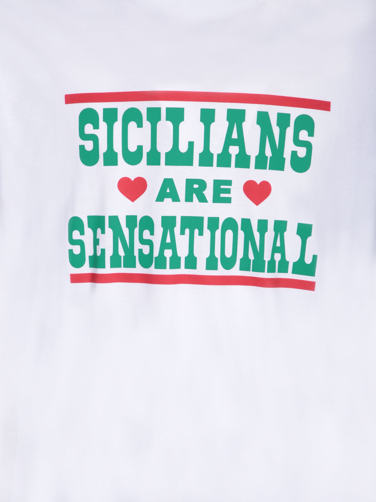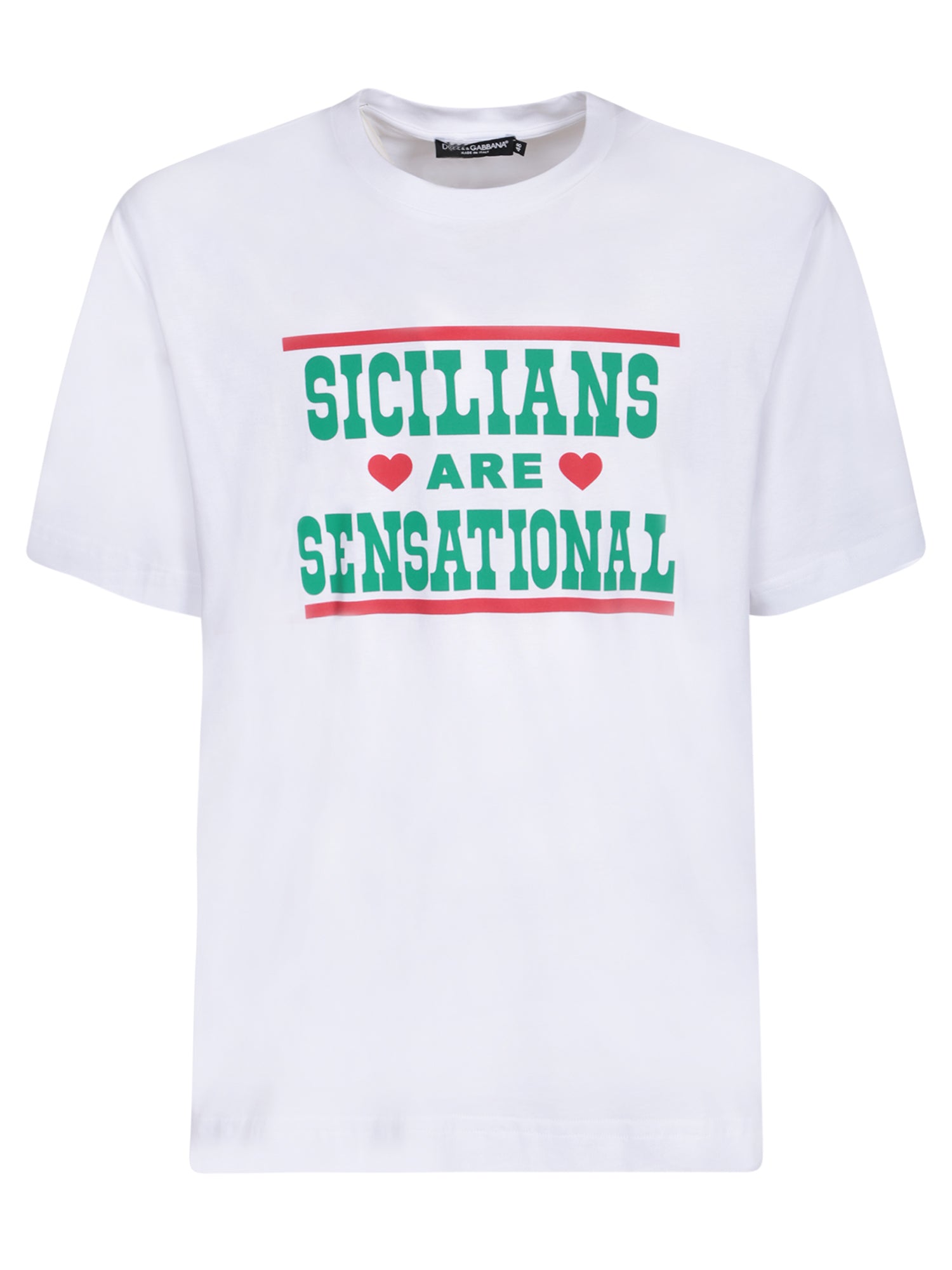 "White "Sicilians are Sensational" T-shirt by Dolce&Gabbana; through this garment the designers express their love and gratitude for Sicily"