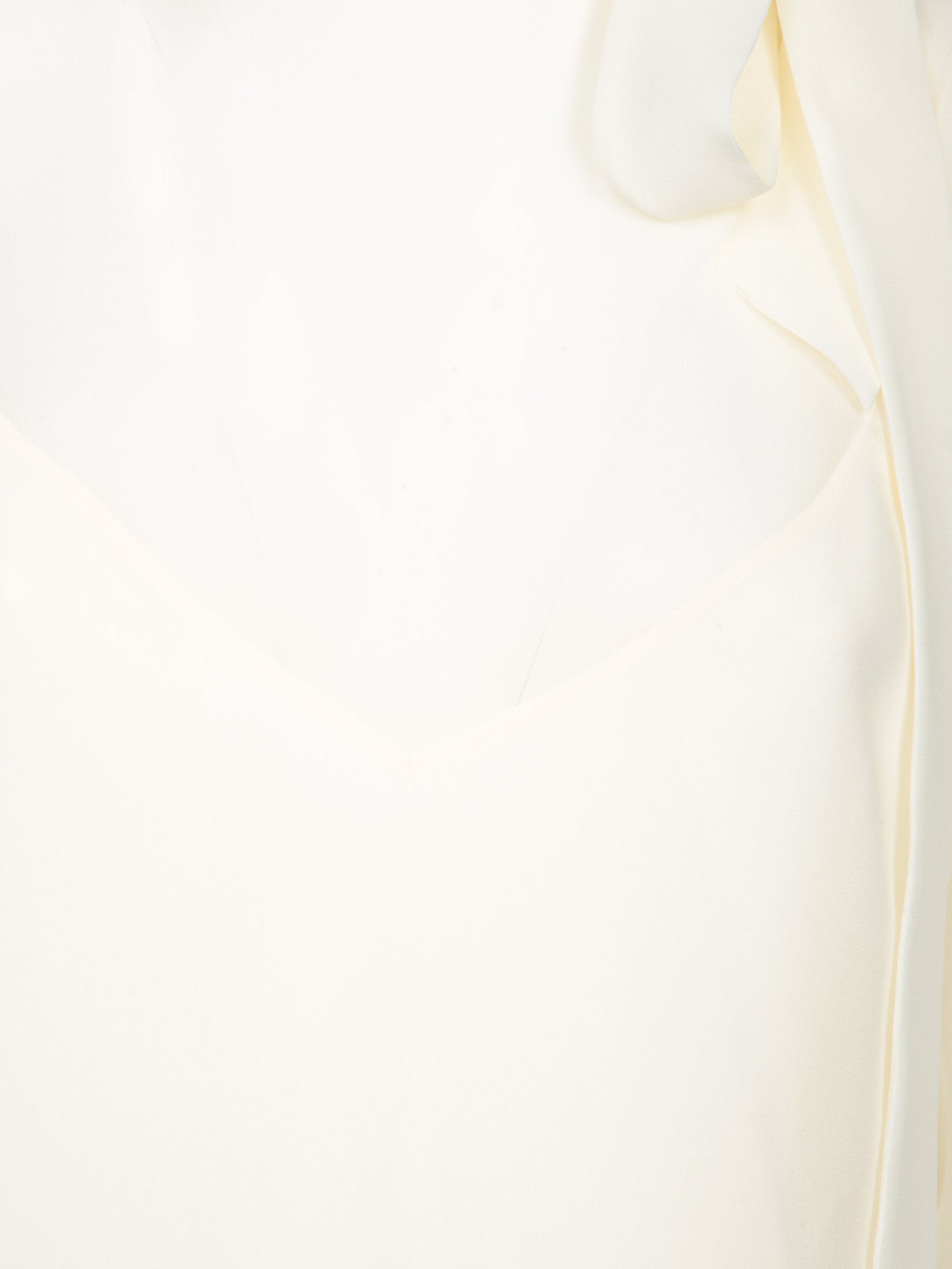 Long sleeves, side tie at the neckline, button closure on the cuffs.