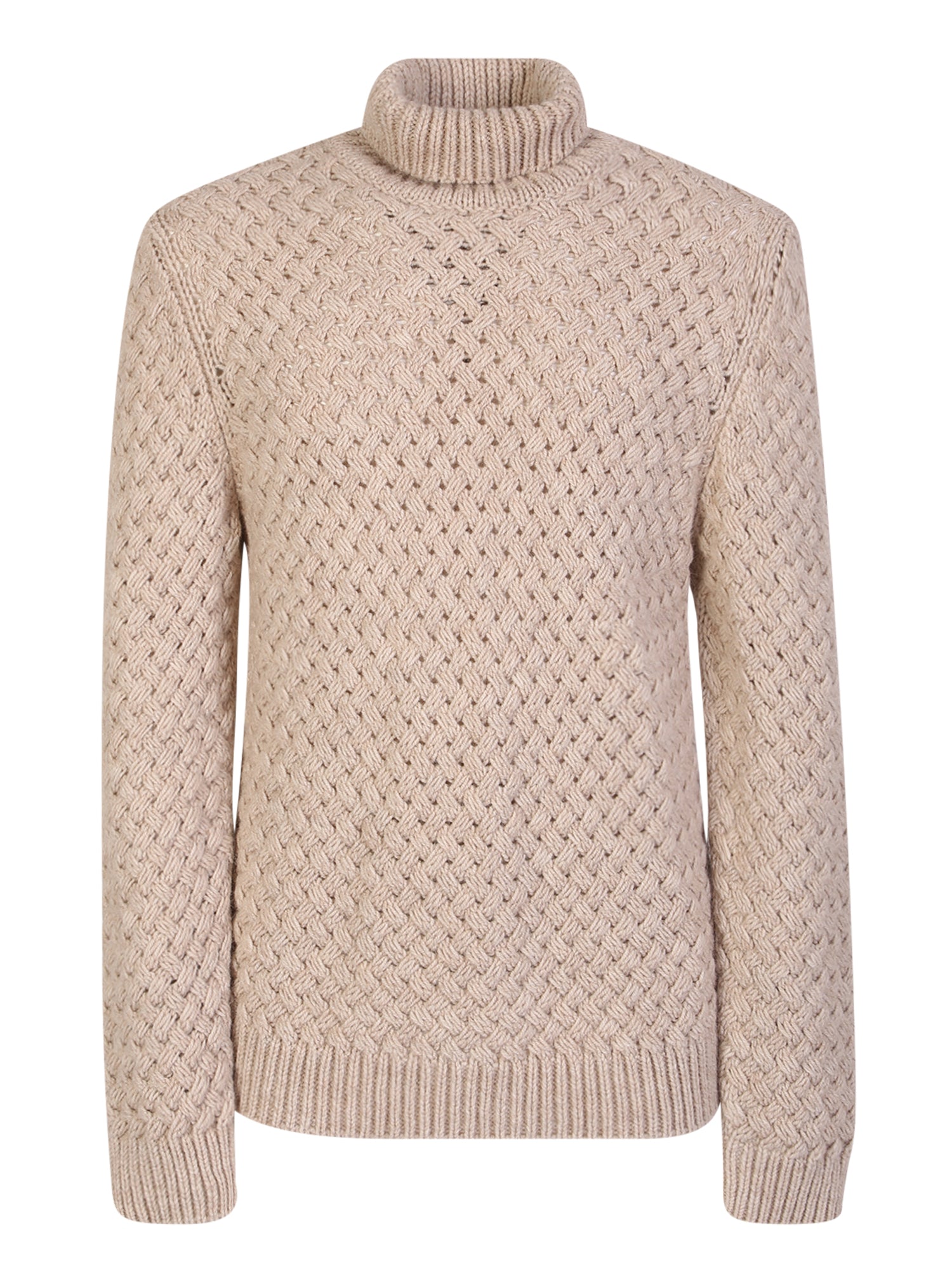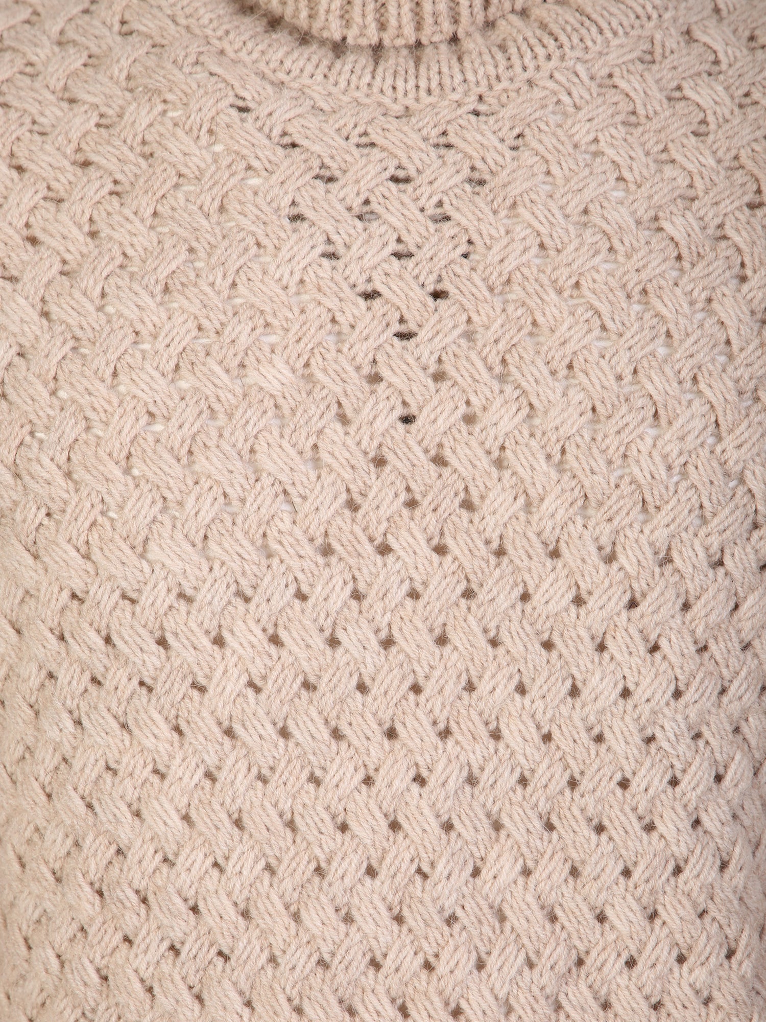 High neck. Long sleeves. Knitted construction. Ribbed cuffs and hem. Color: ivory