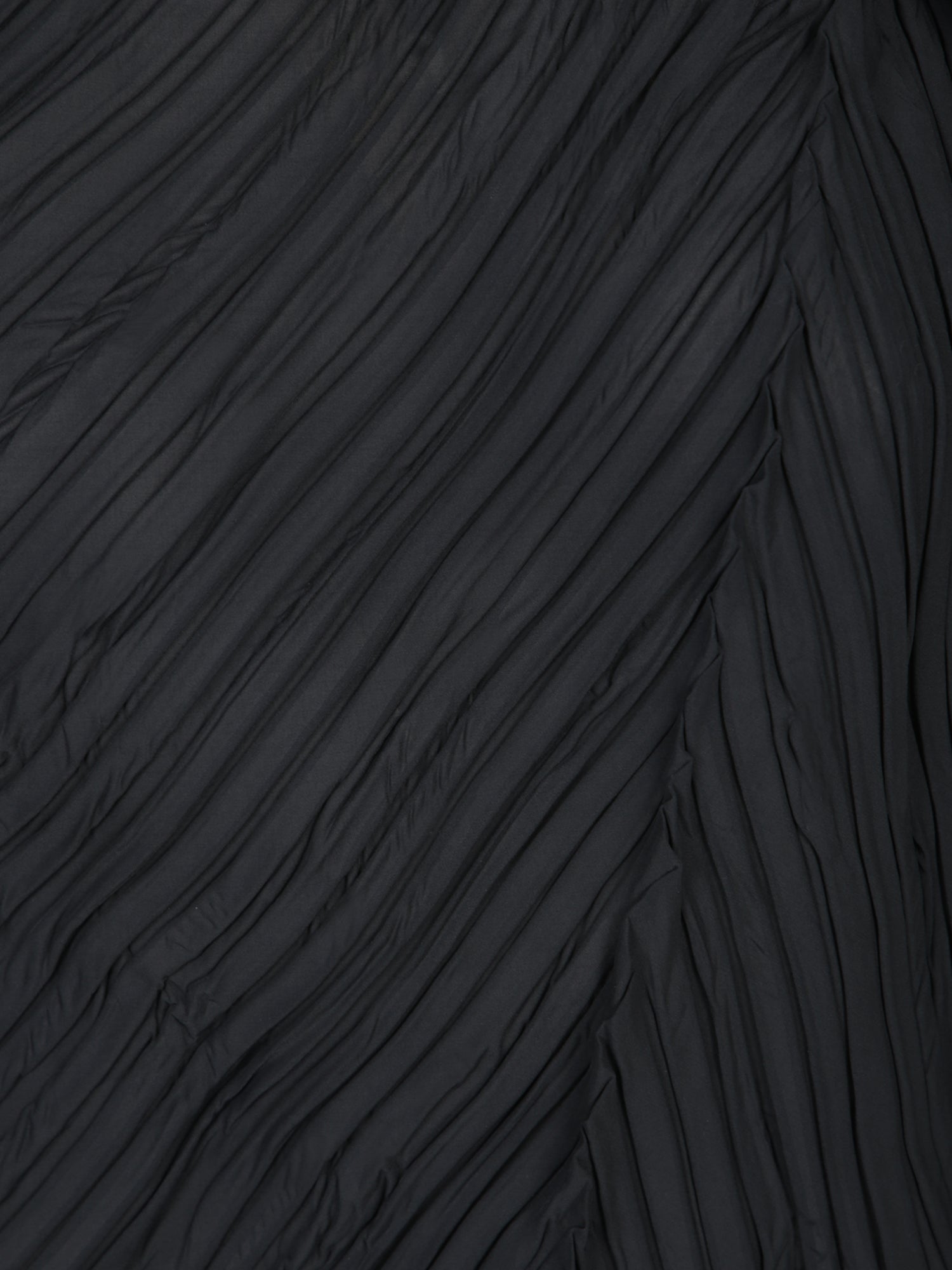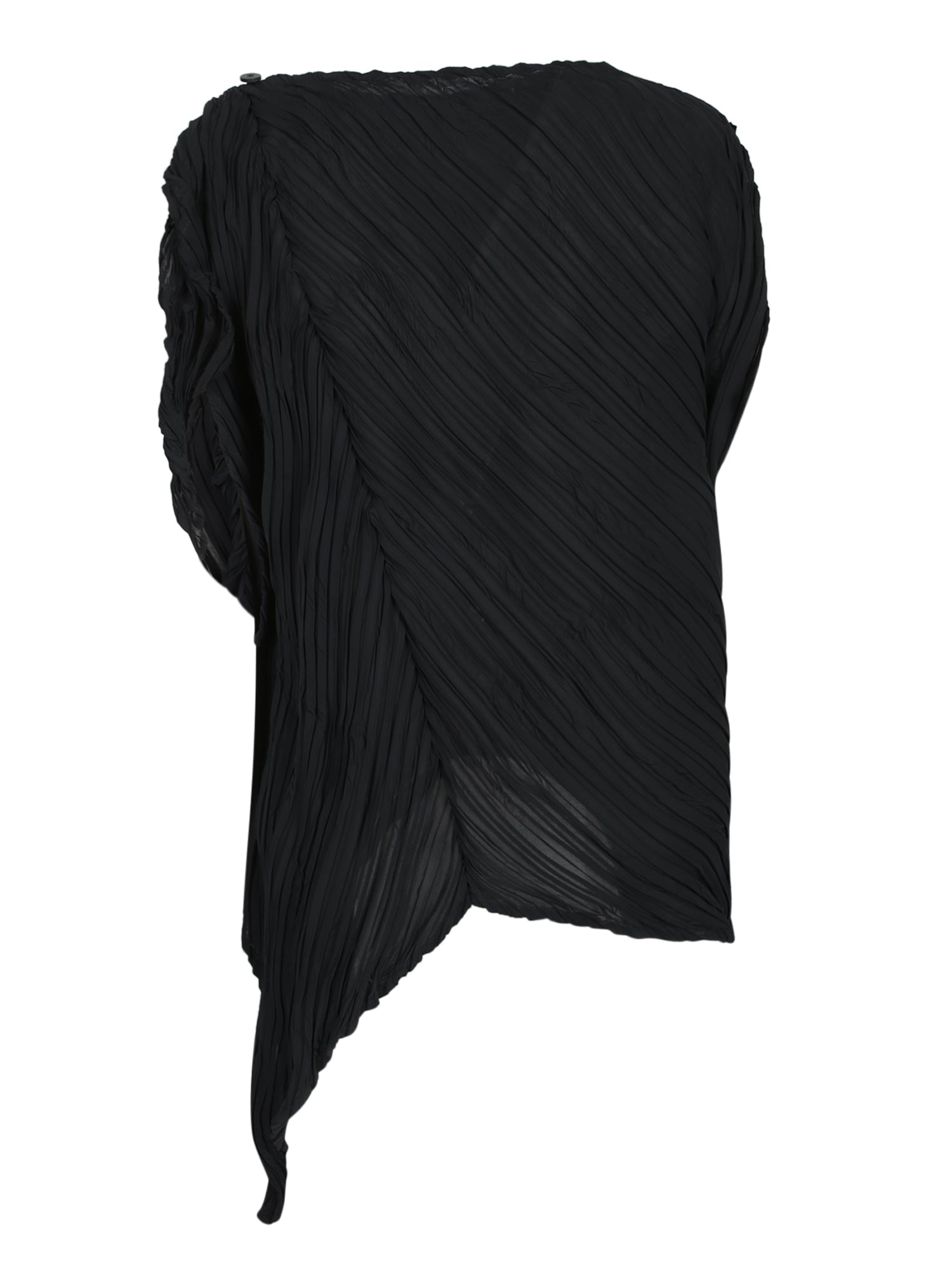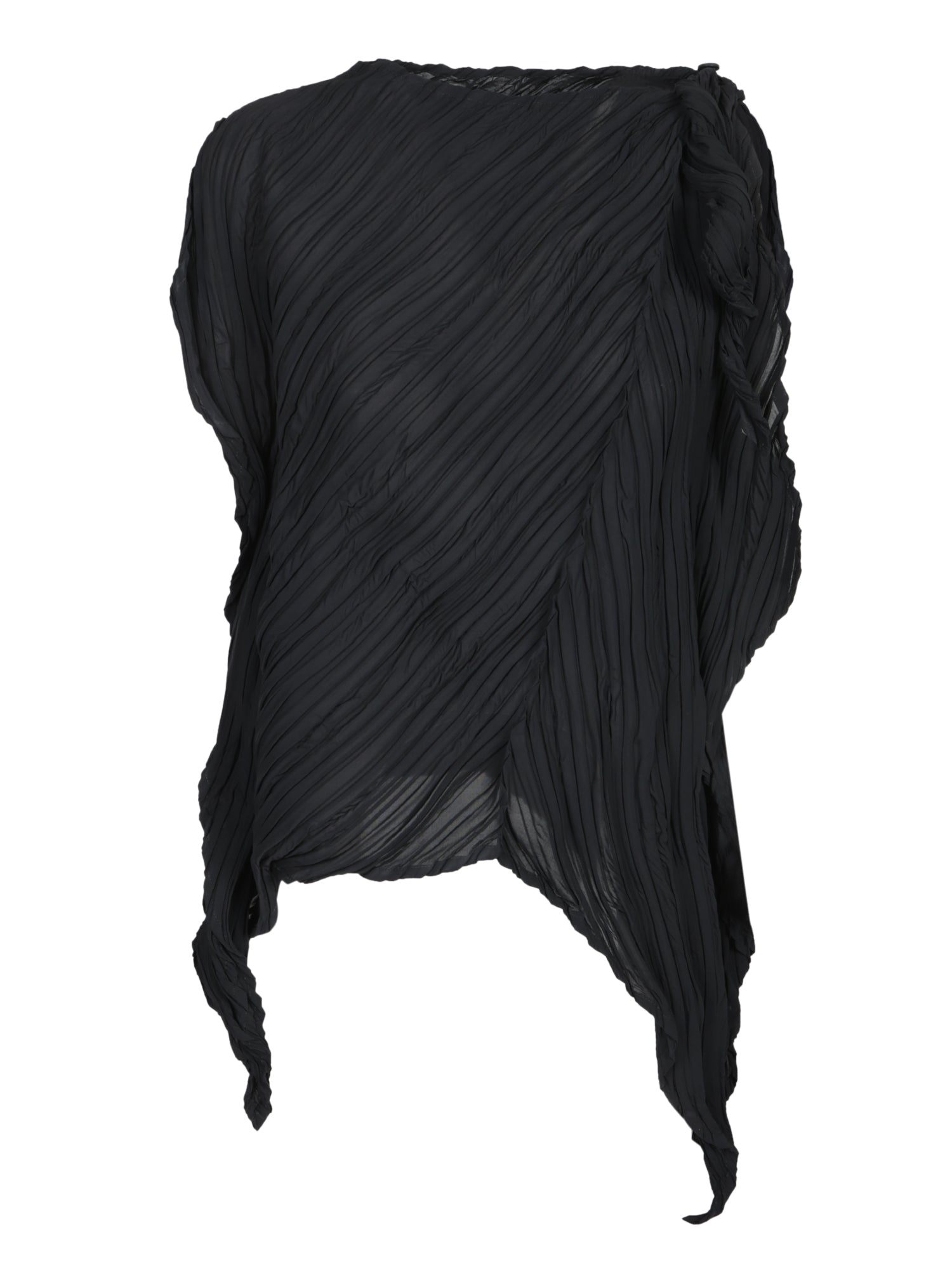Asymmetric plissé fabric blouse. Features a single long sleeve and dynamic draping. Matte finish with a textured, crinkled appearance.