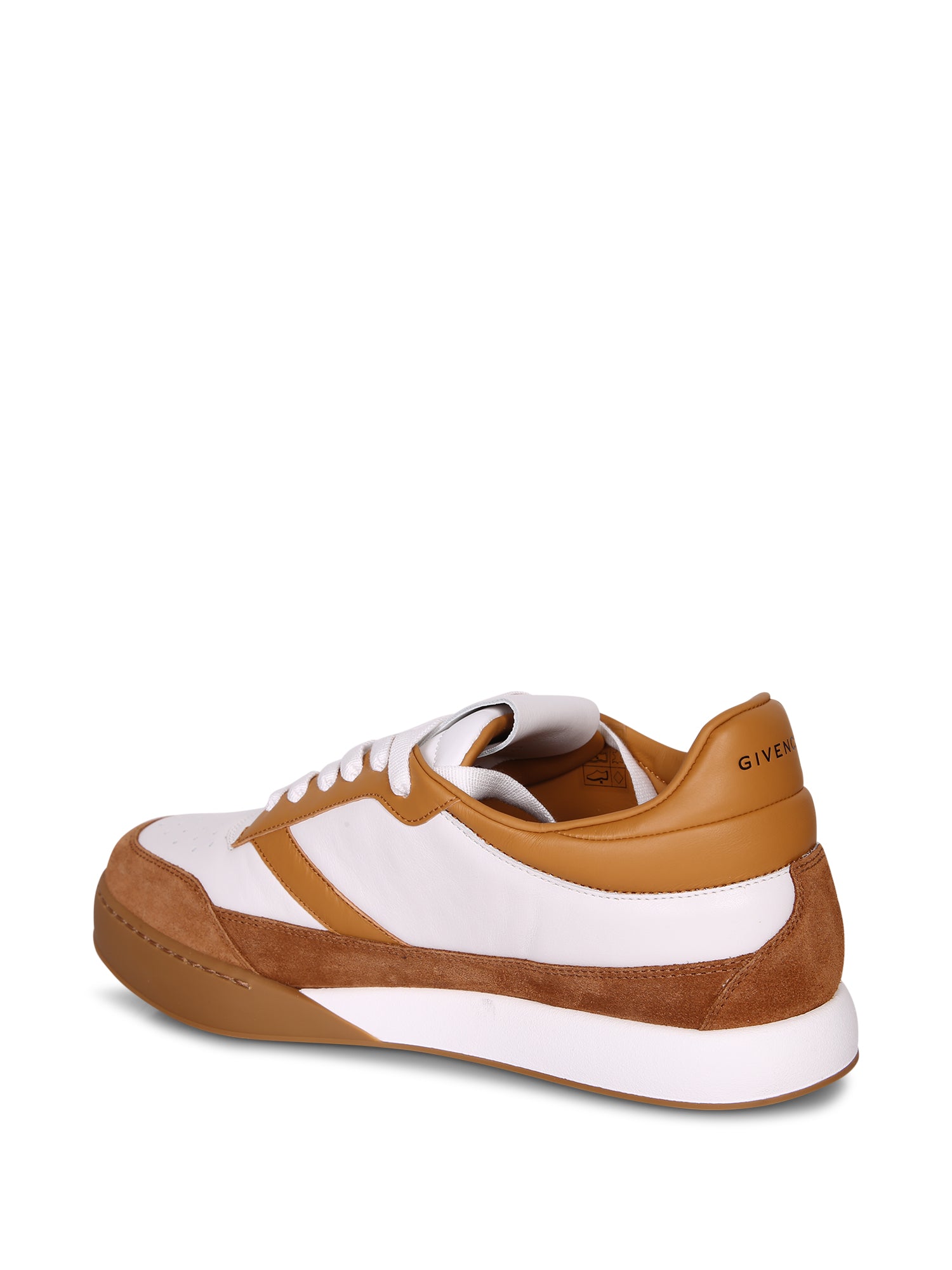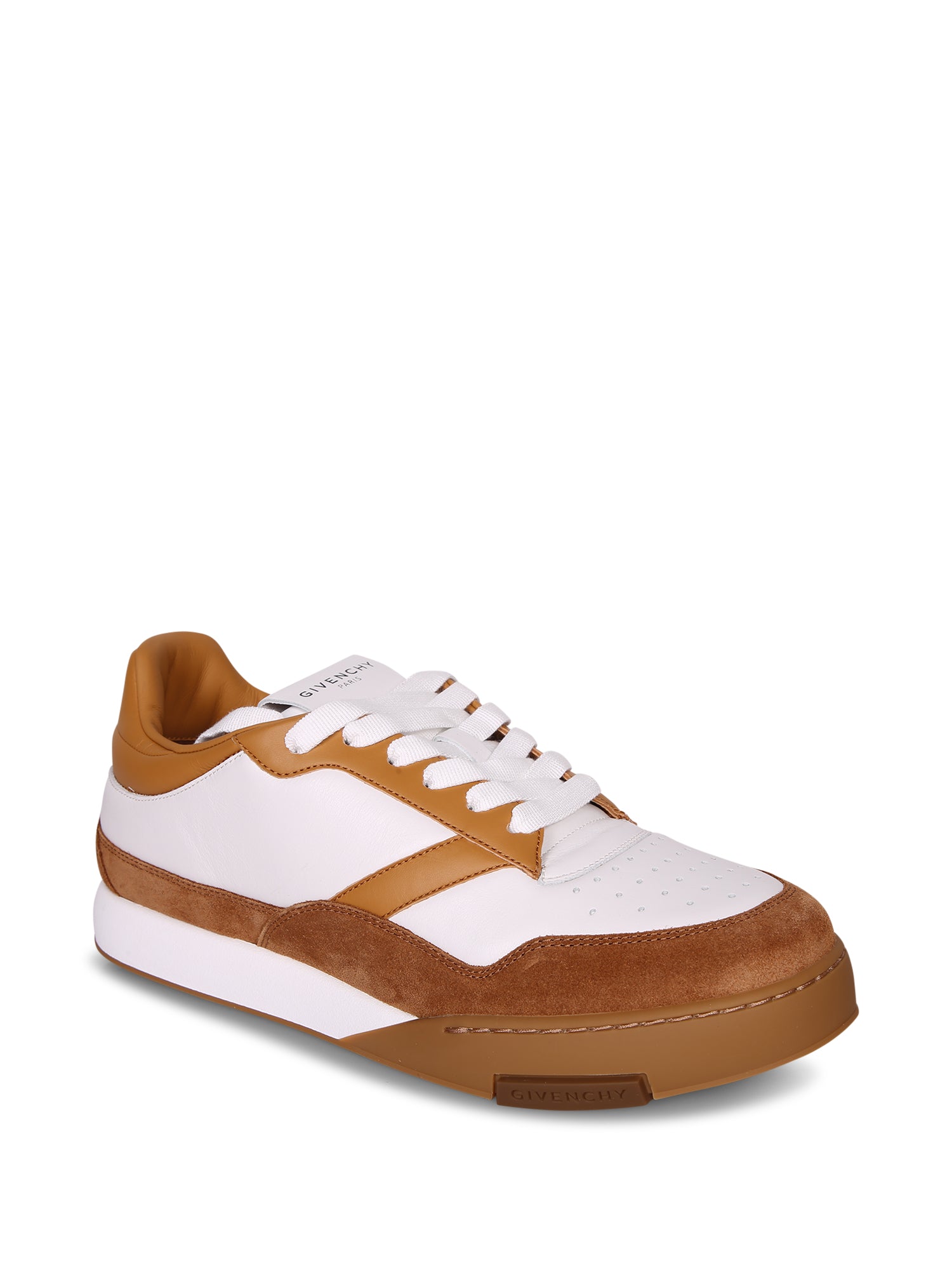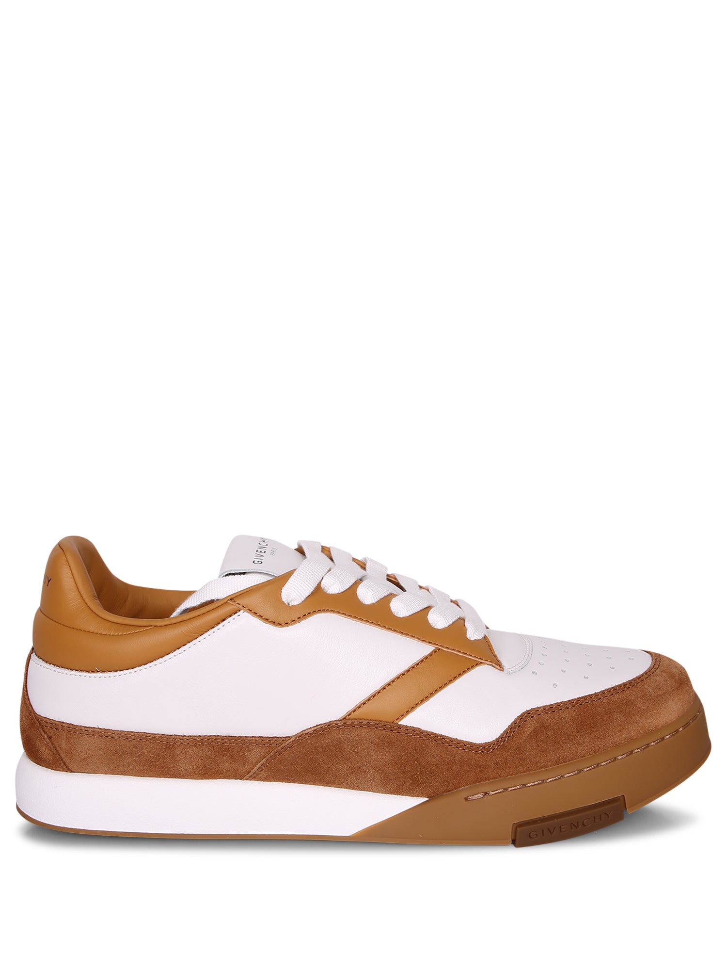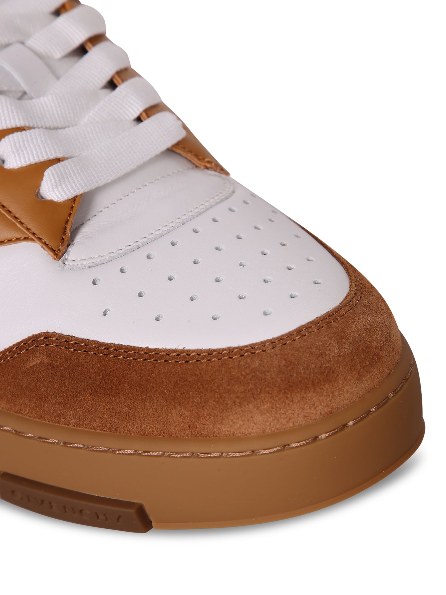 White leather and beige suede upper. Rubber sole. White laces. Logo detail on the heel.