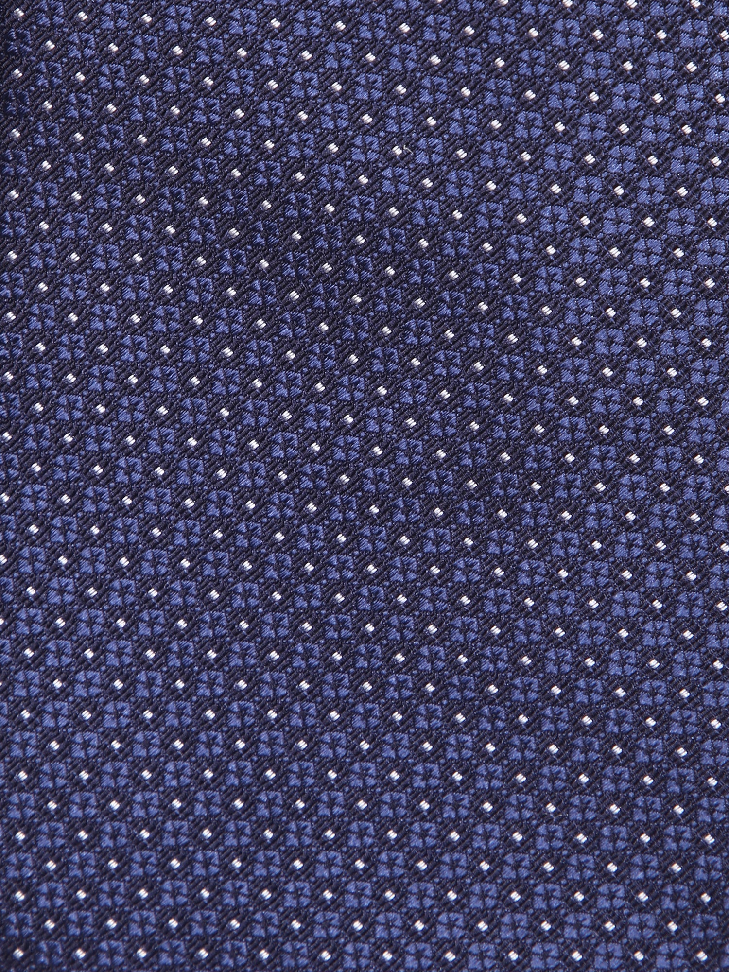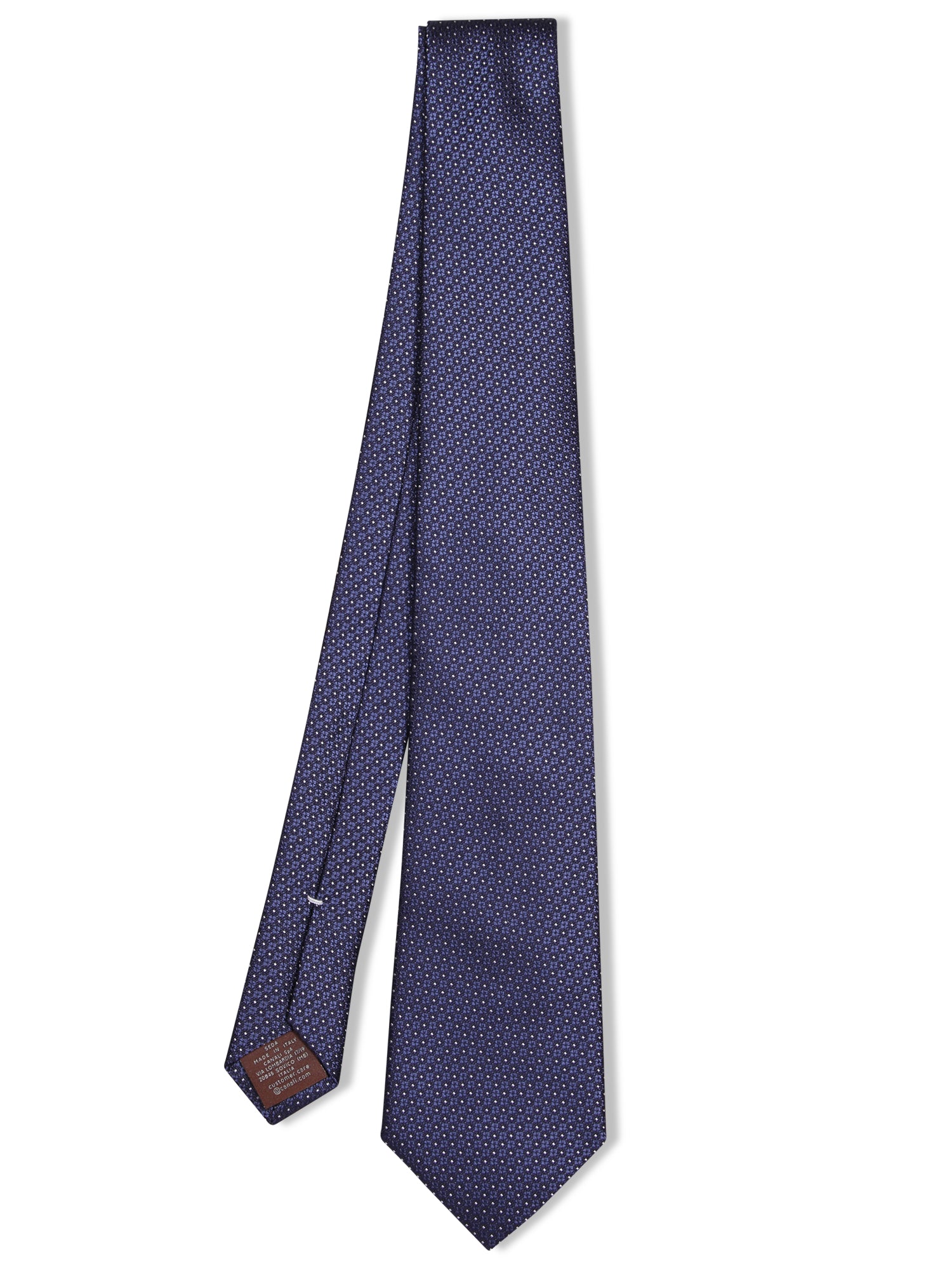 Pure silk tie. 8 cm width. White and blue polka dot pattern on a blue base.