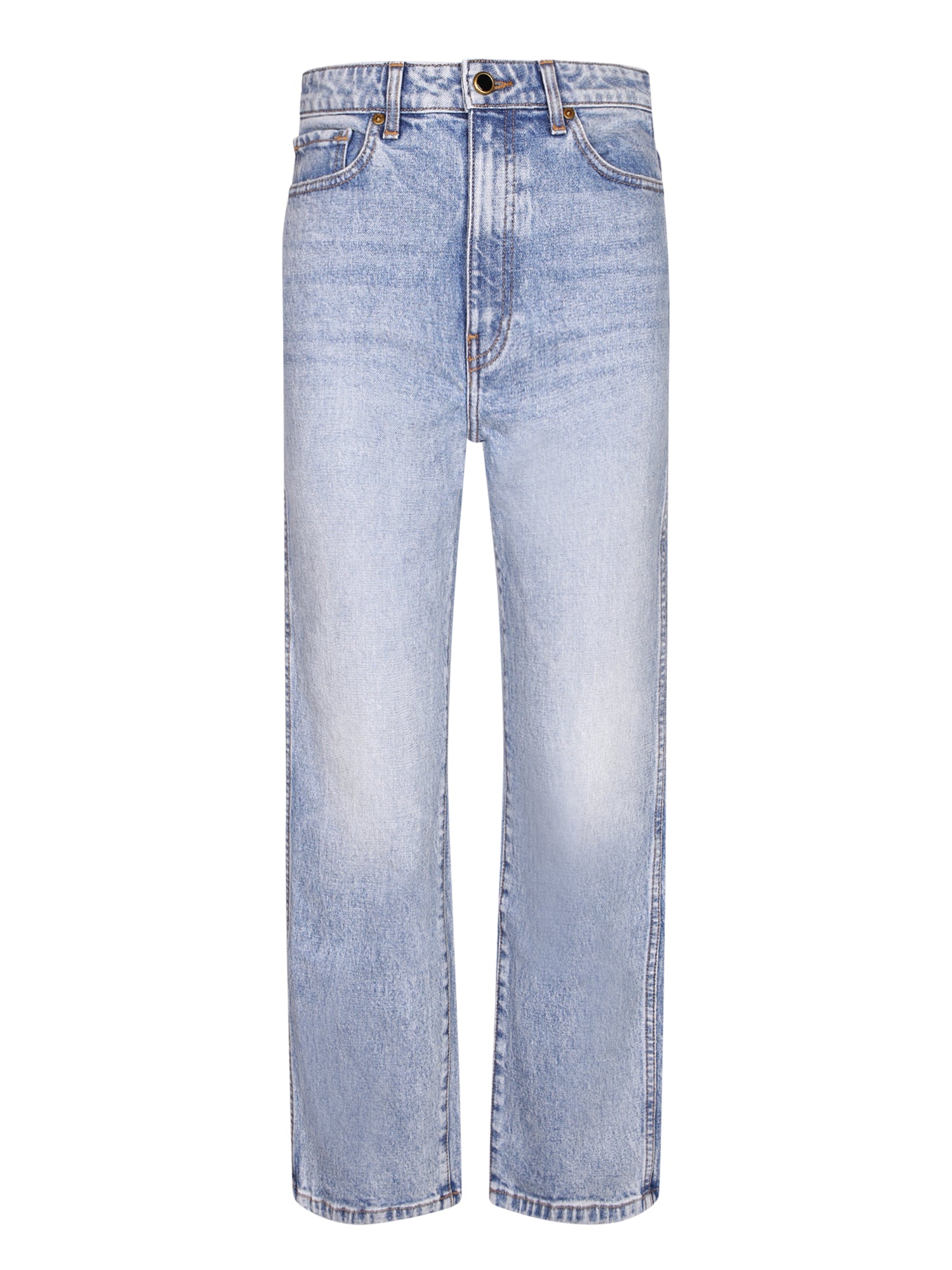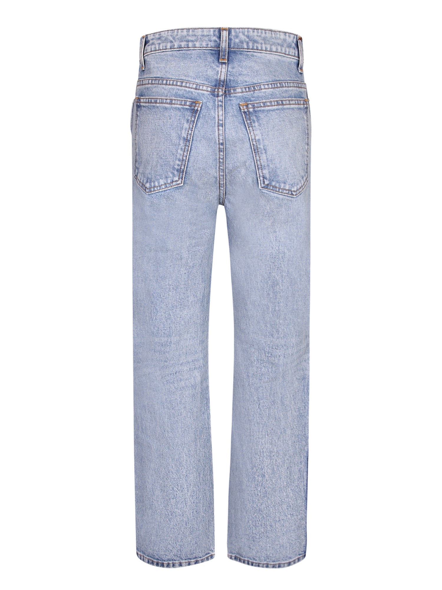 Washed denim jeans. Five-pocket style. Front zip and button closure.