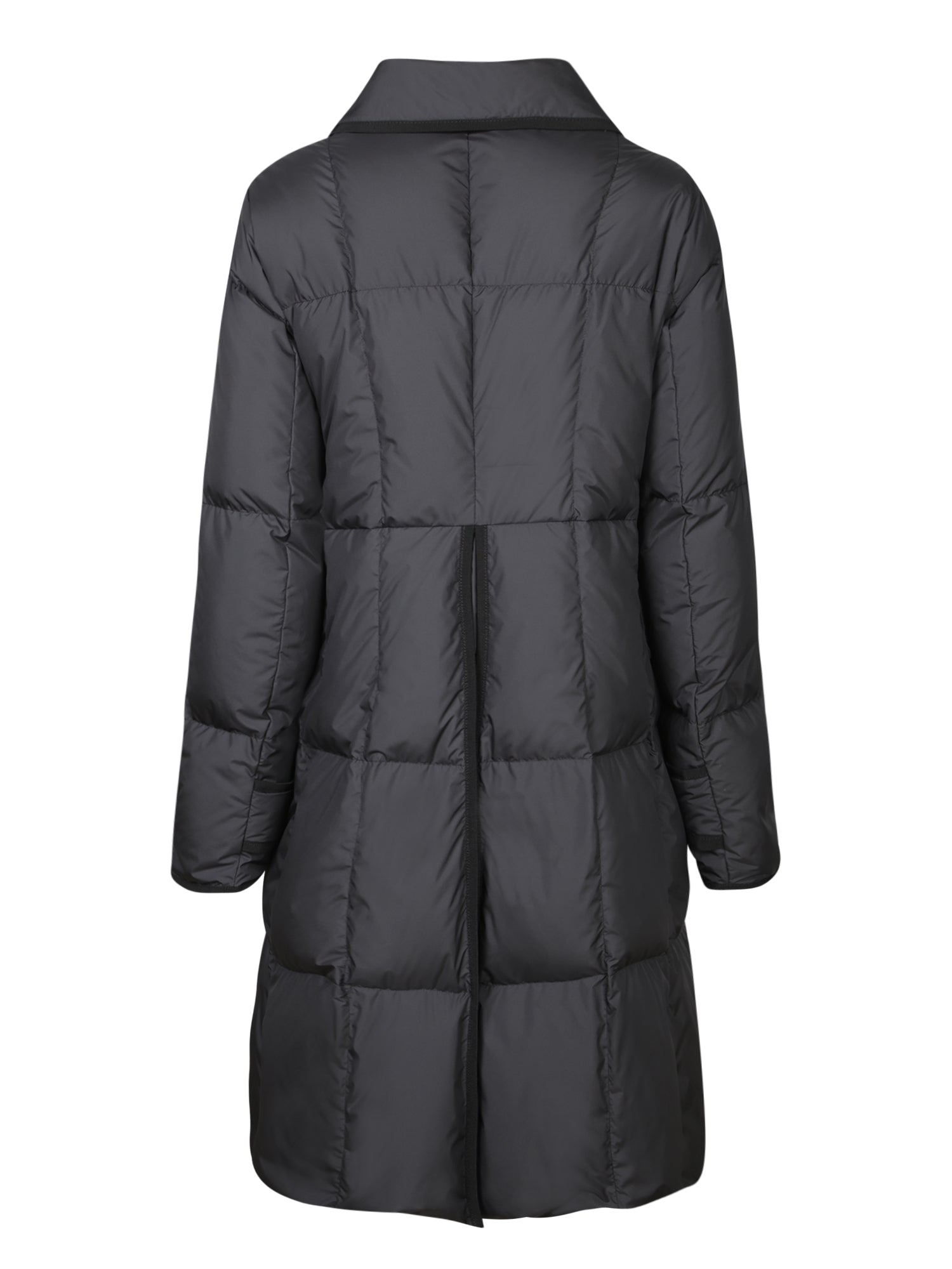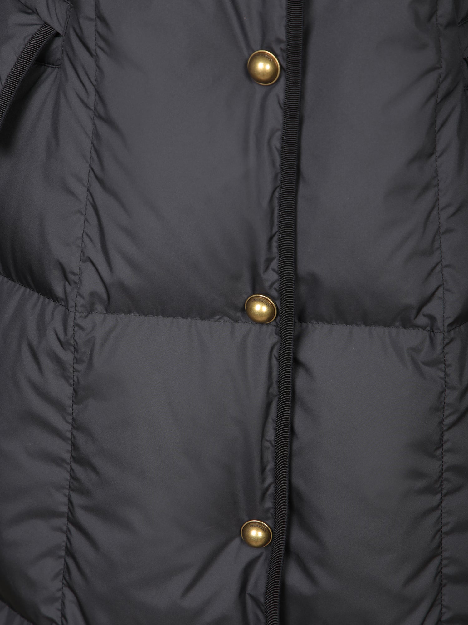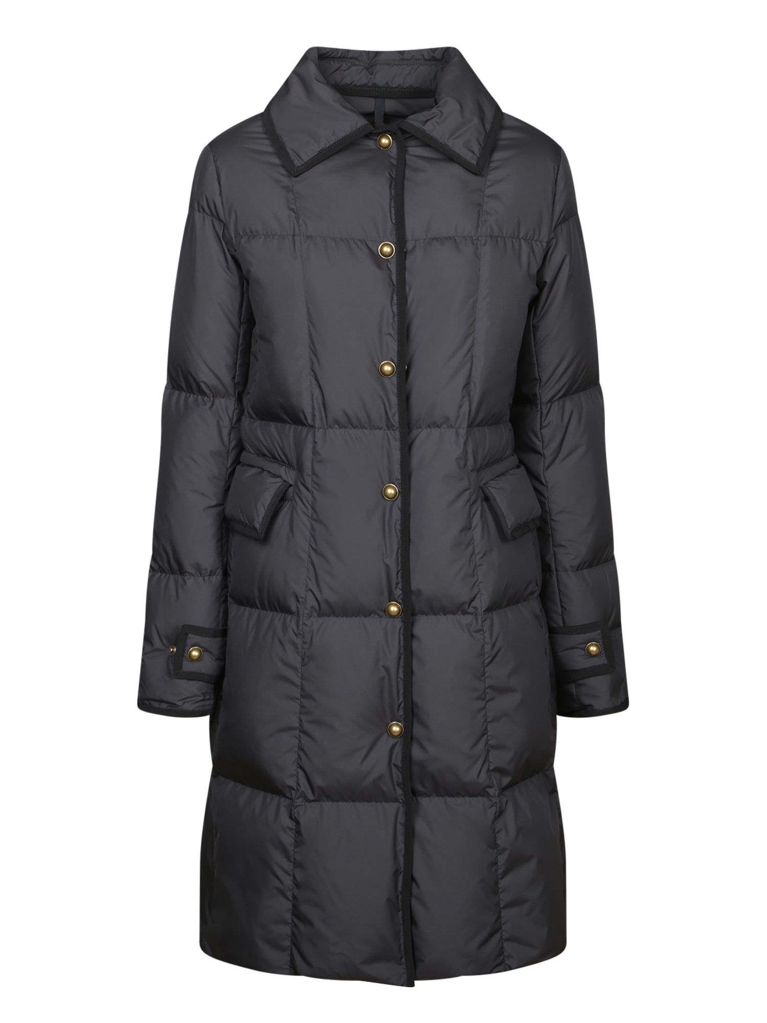 Long padded jacket. Raised collar. Golden button front closure. Flap pockets with button.