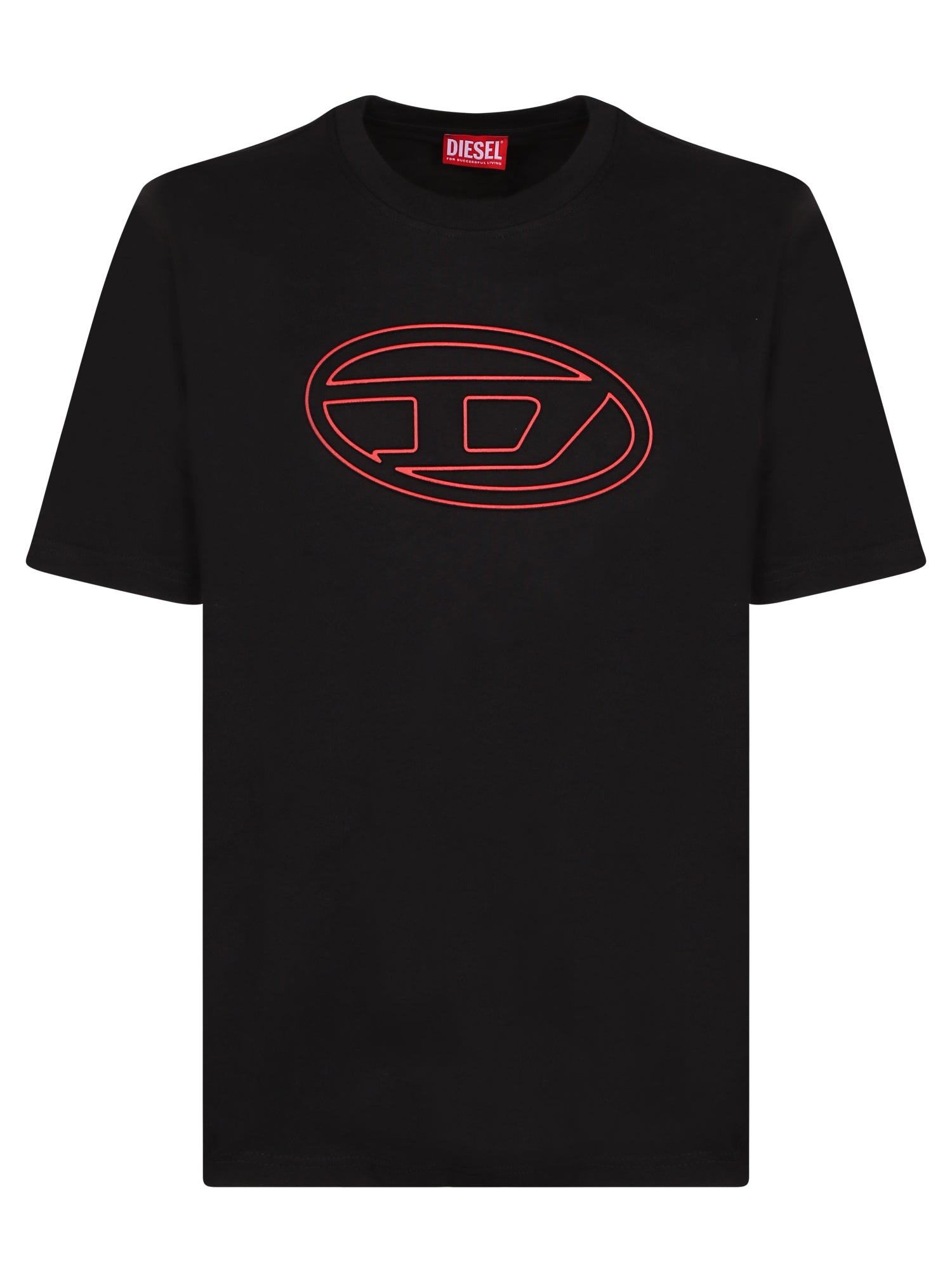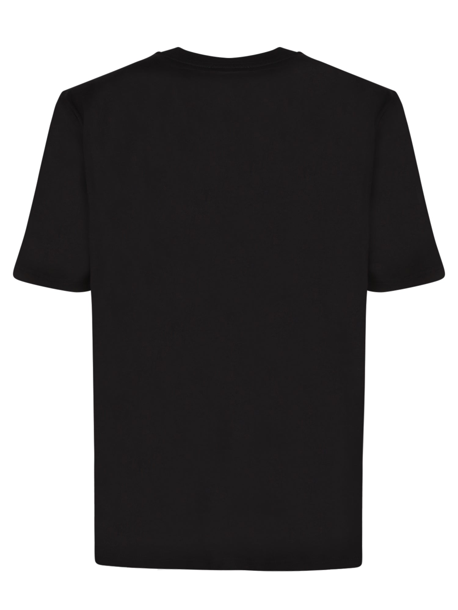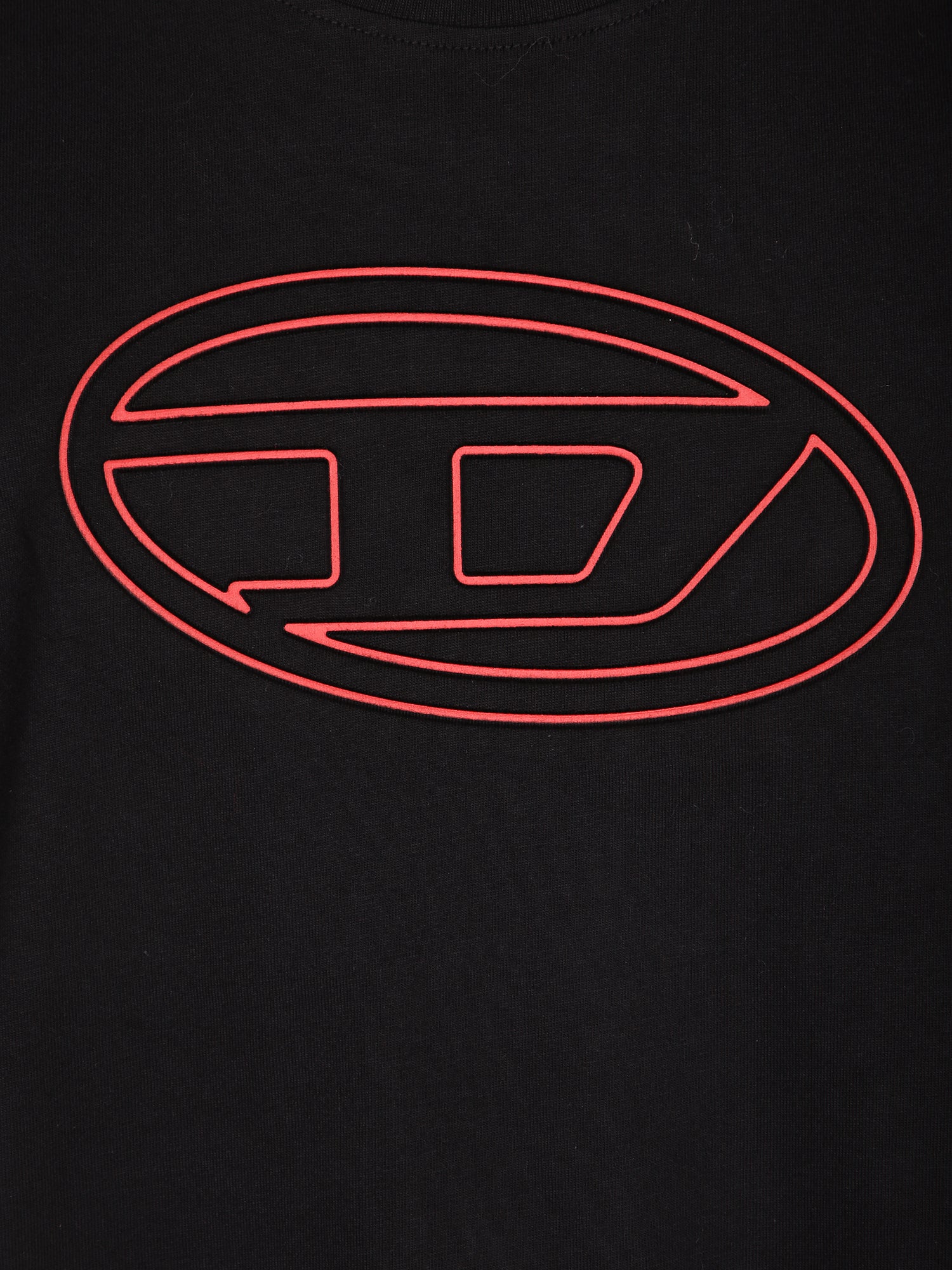 Short sleeves. Contrasting red logo on the chest. Smooth round neckline.