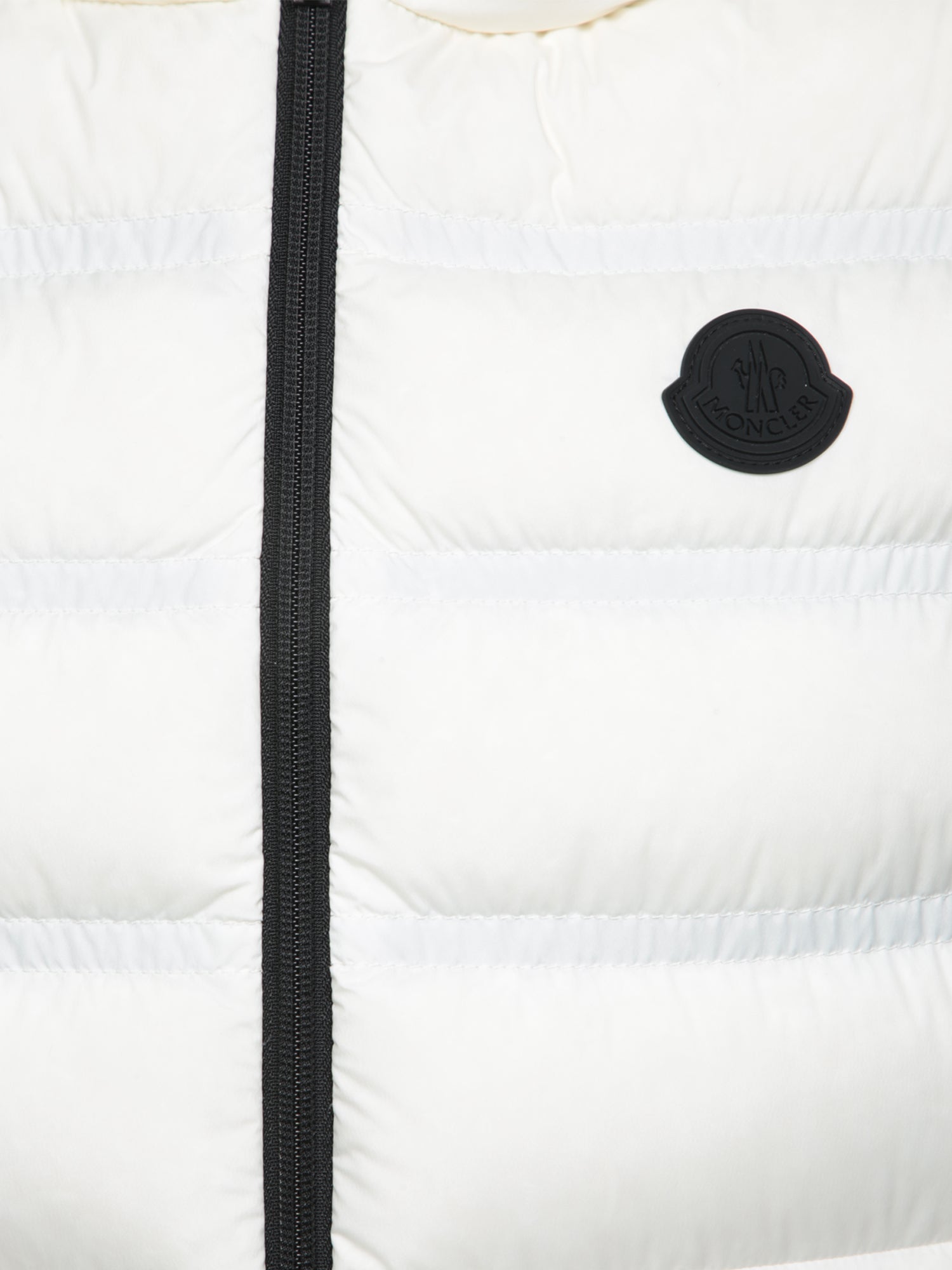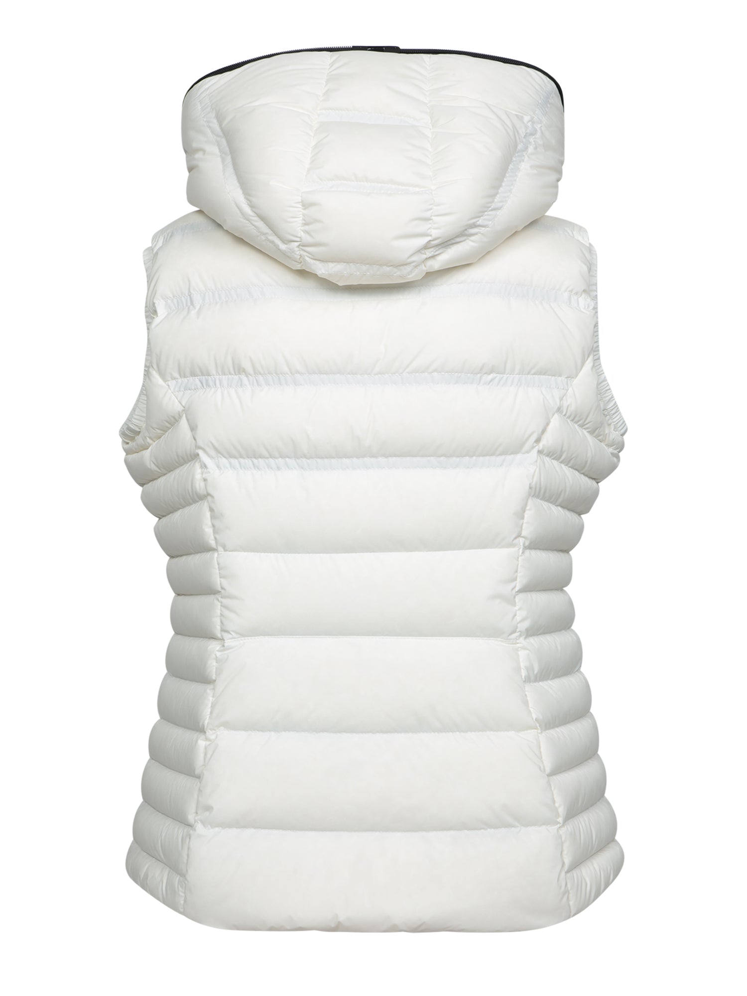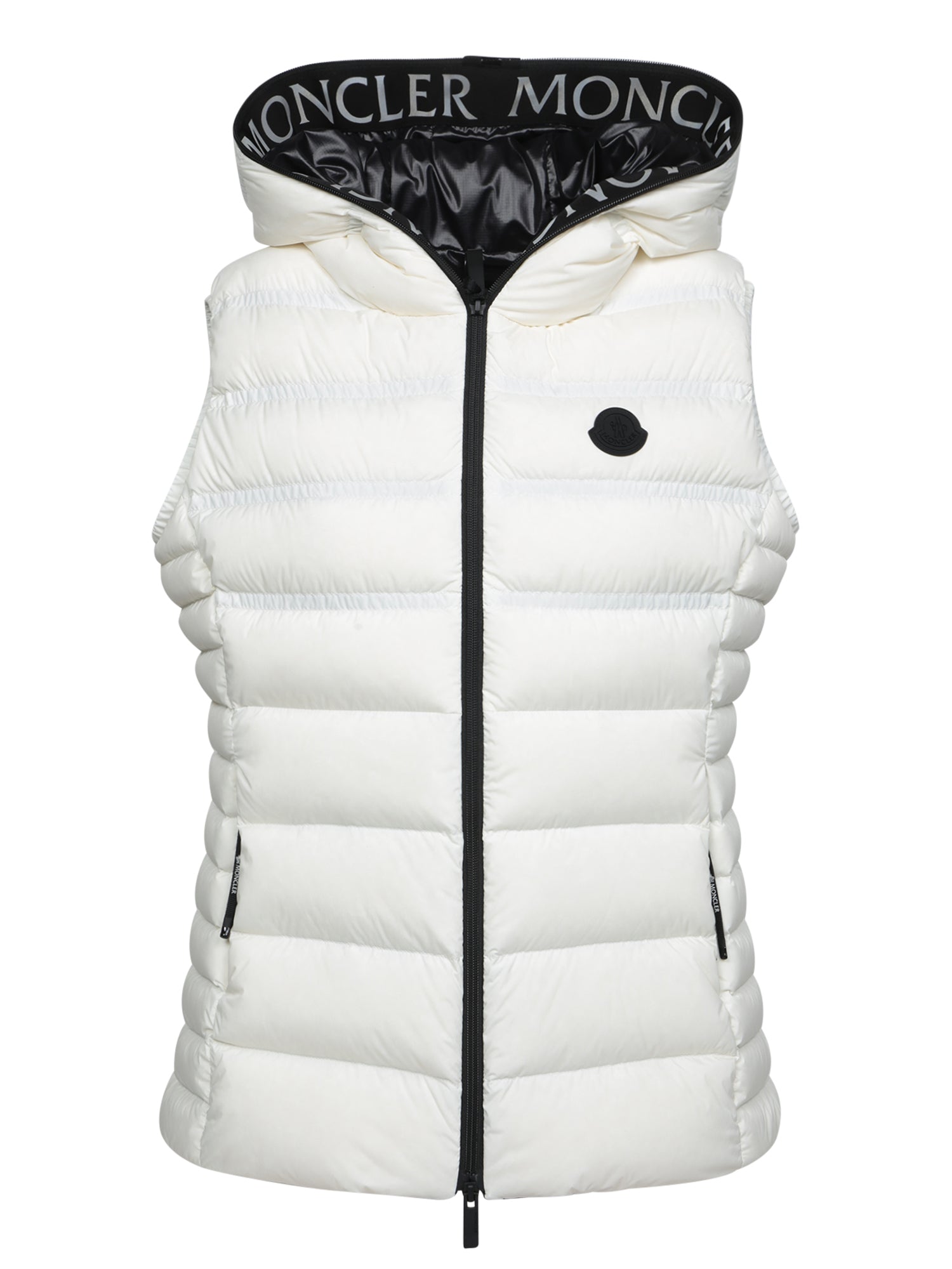 A masterpiece of functionality and style, the Moncler Aliterse Vest in white features a modern design, with a logo-decorated hood and a contrasting black zipper that emphasizes its clean and sophisticated silhouette.