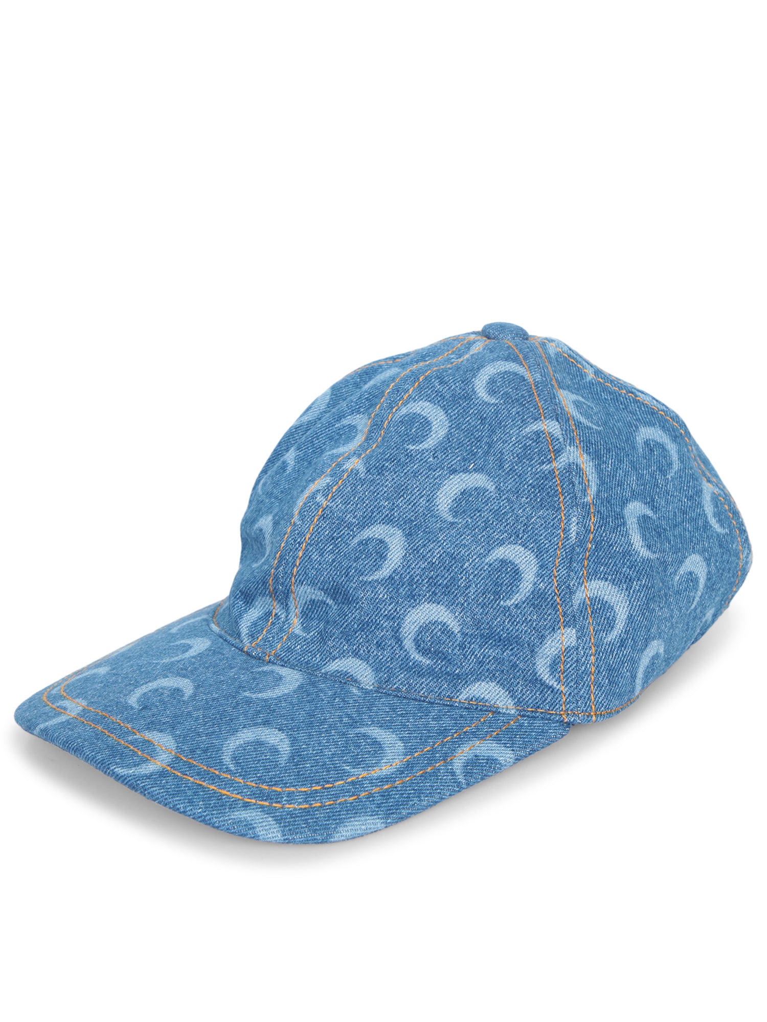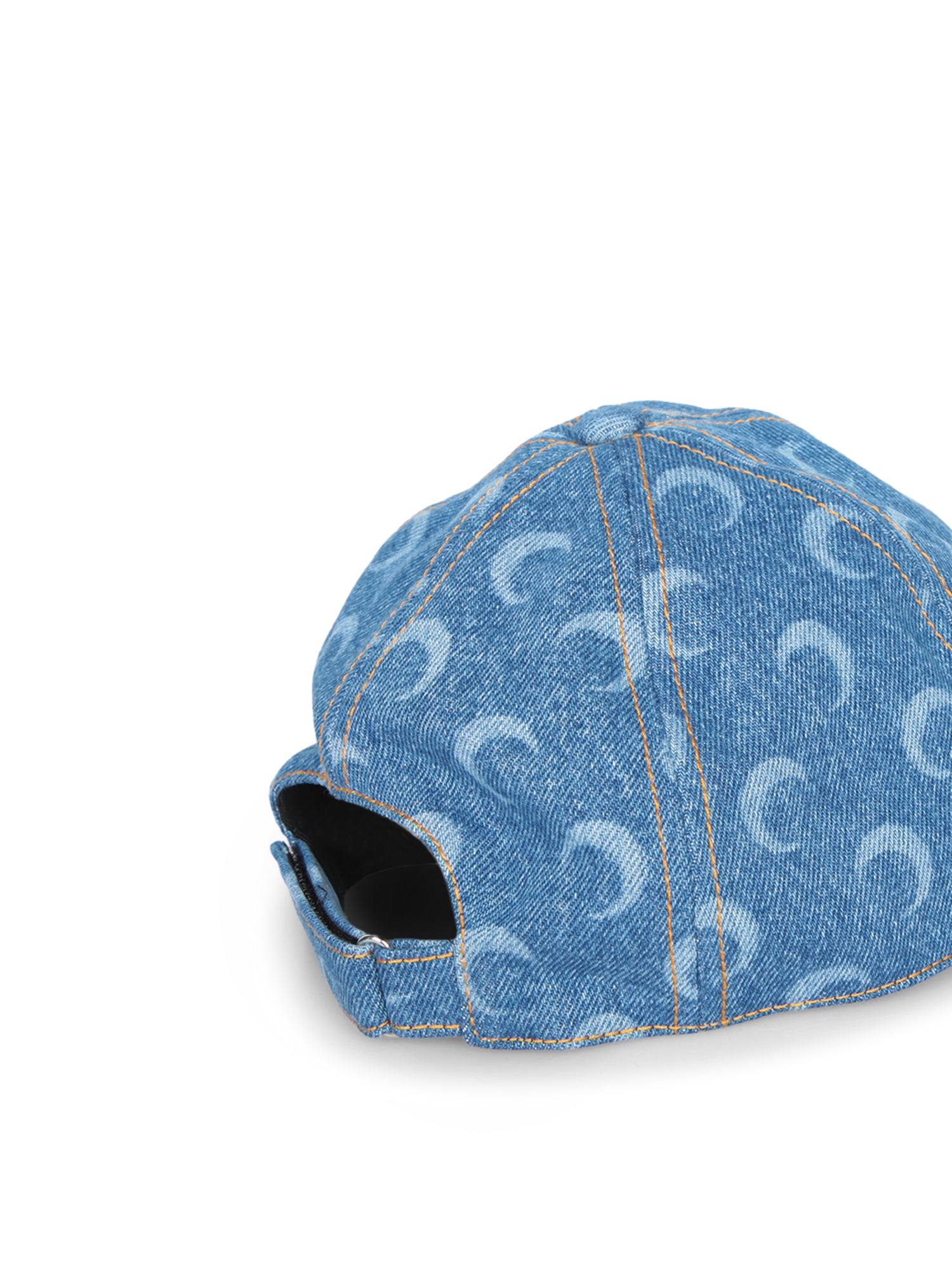 Denim cap with a curved brim. Features an iconic crescent moon print. Finished with contrasting stitching.