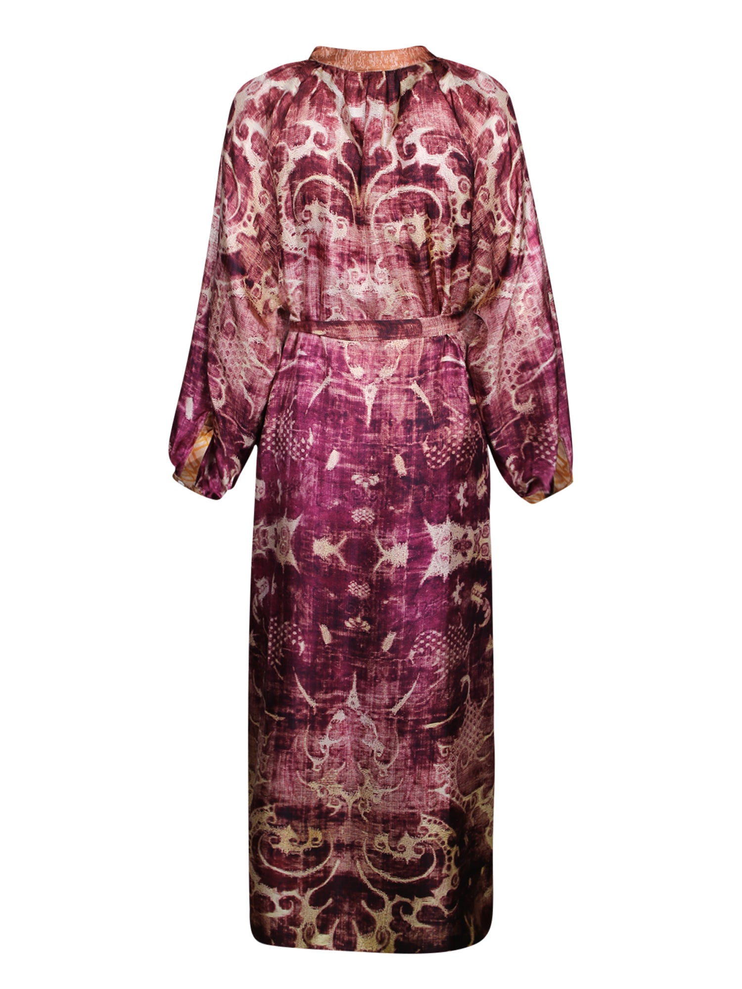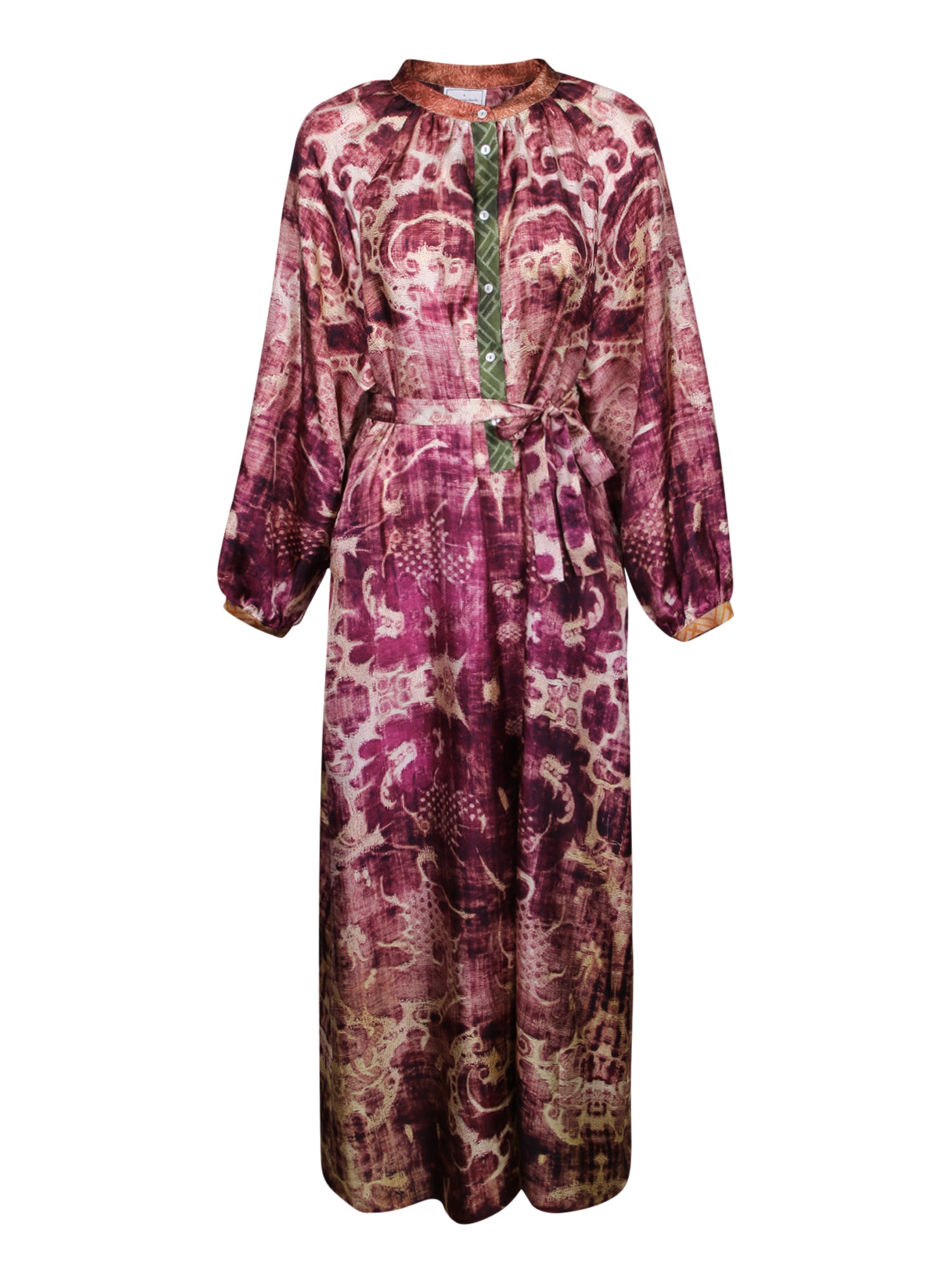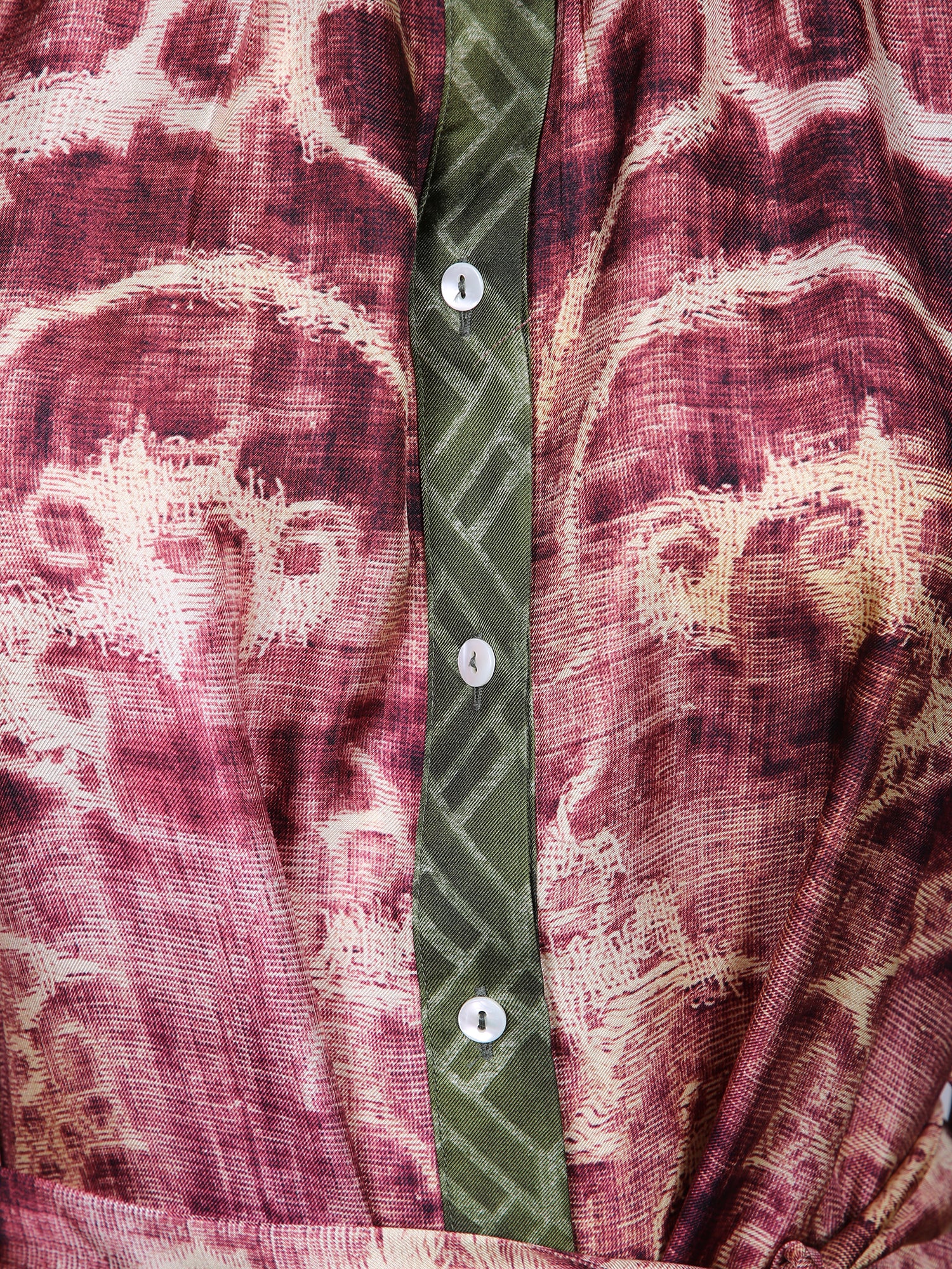 Printed silk chemisier dress. Long sleeves, front button closure, matching fabric belt.