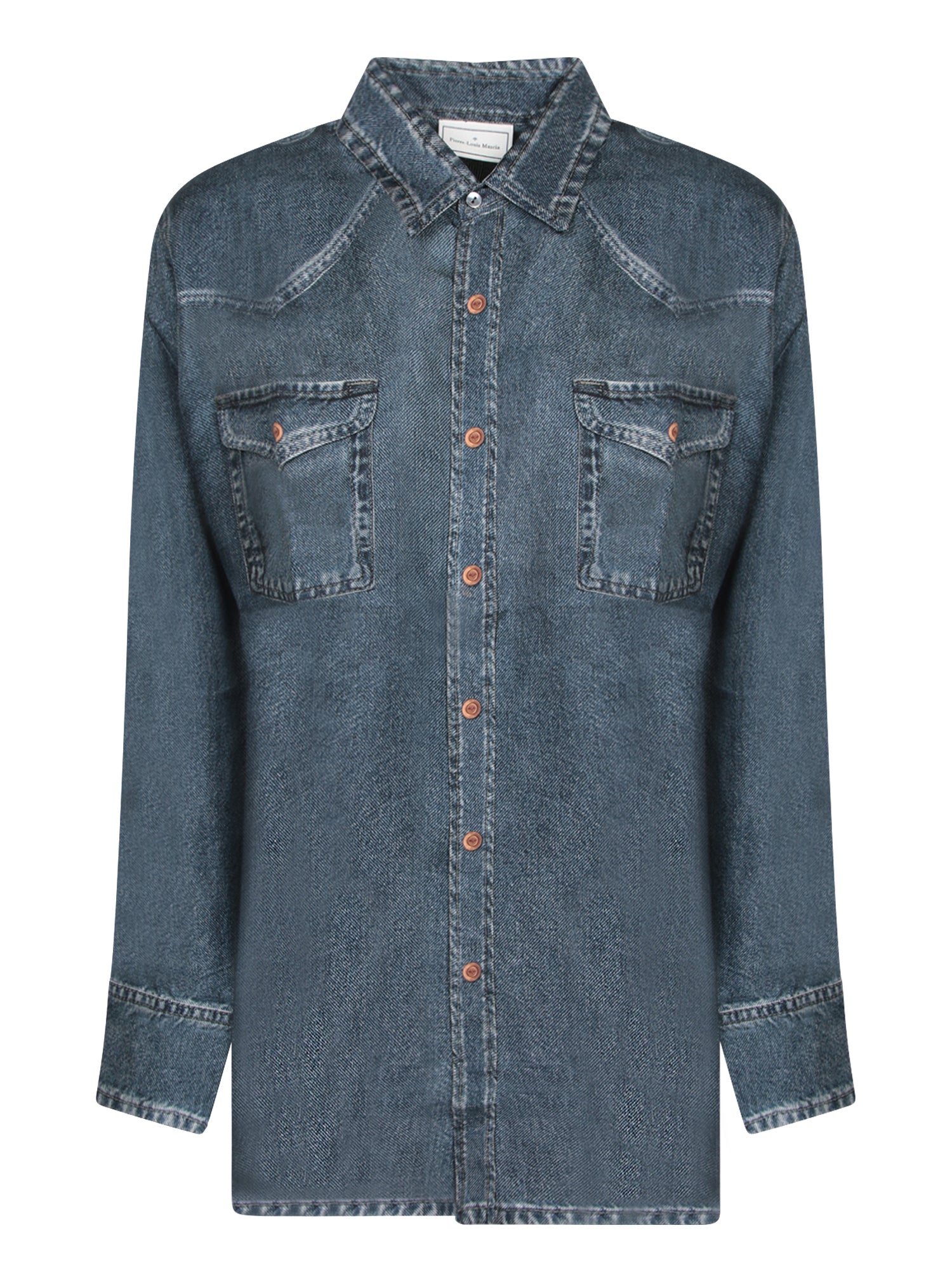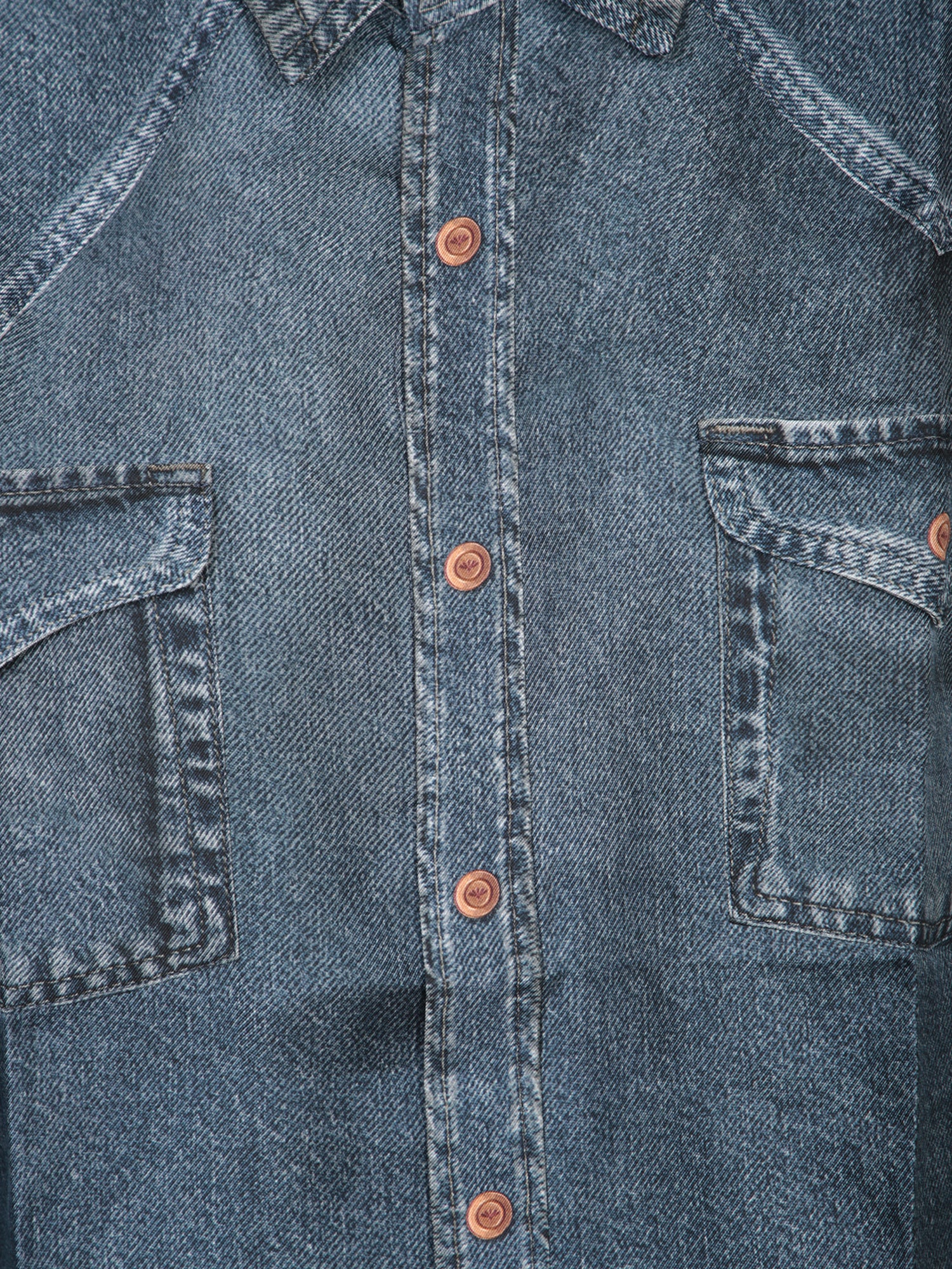 Long sleeve denim shirt. Classic collar. Button front closure. Two chest flap pockets with buttons.