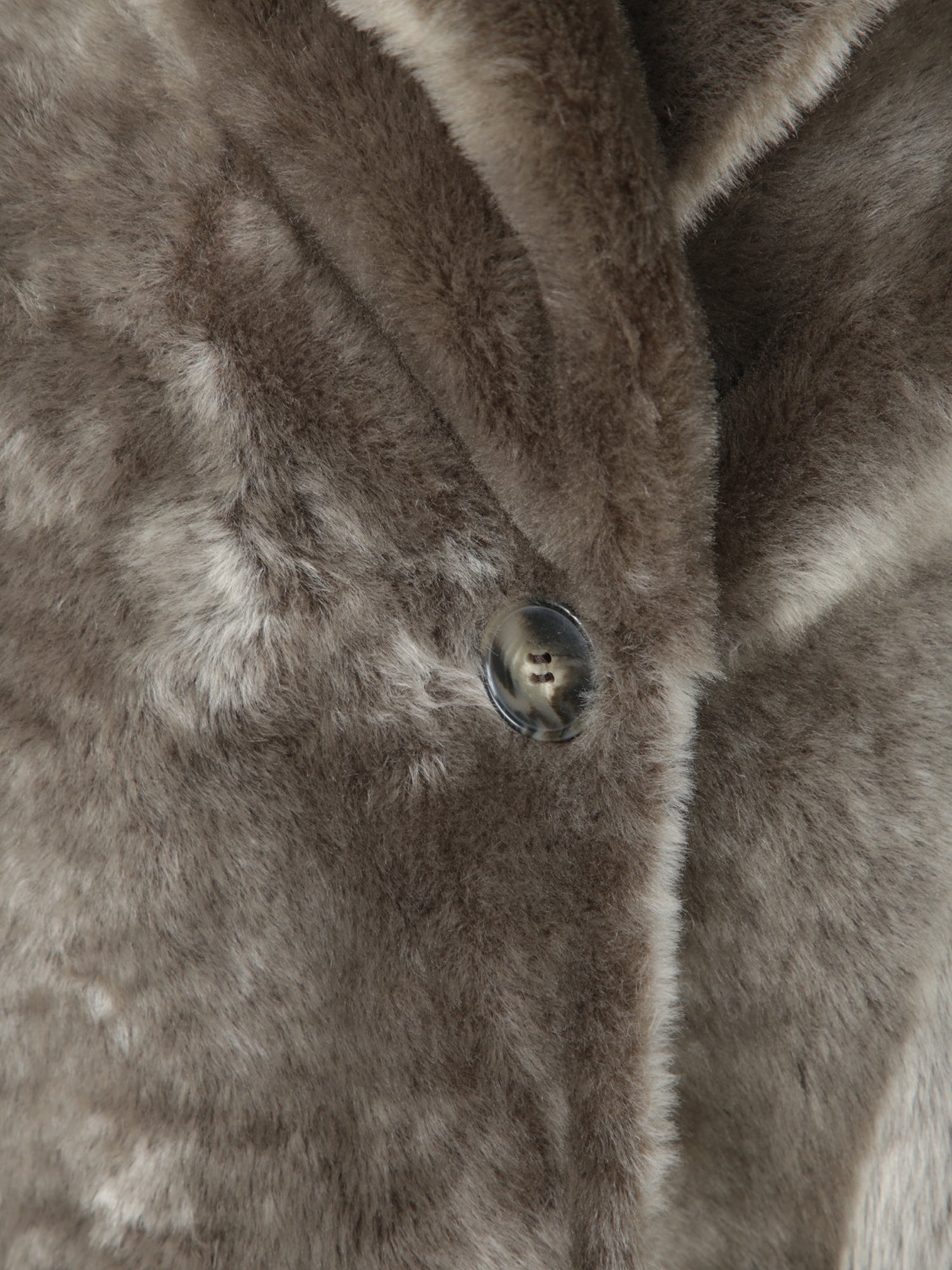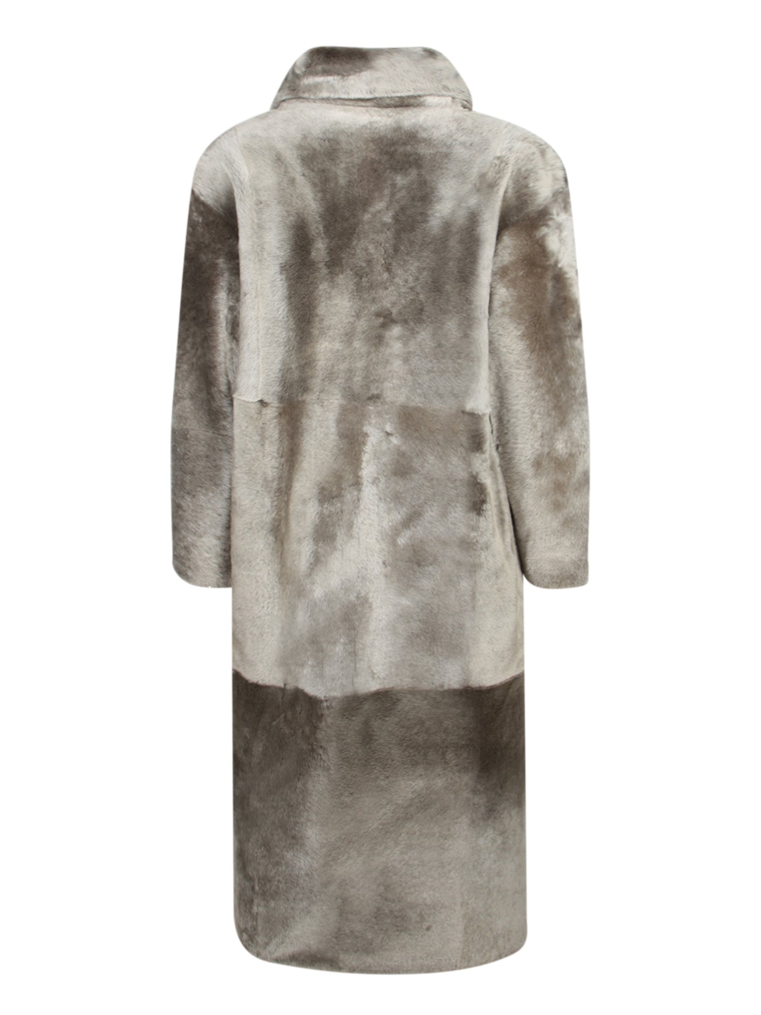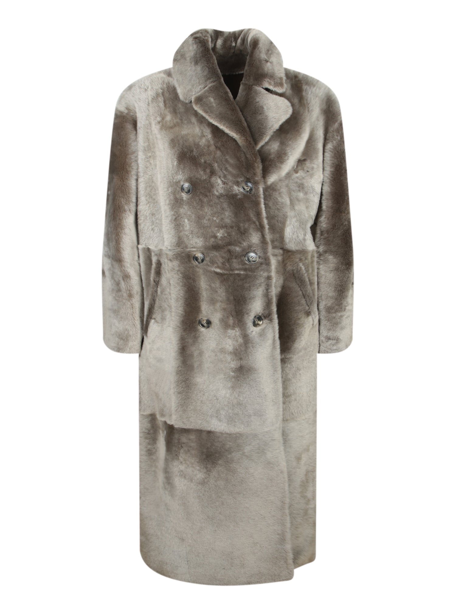 Sheepskin coat with double-breasted design. Flap pockets and broad collar.