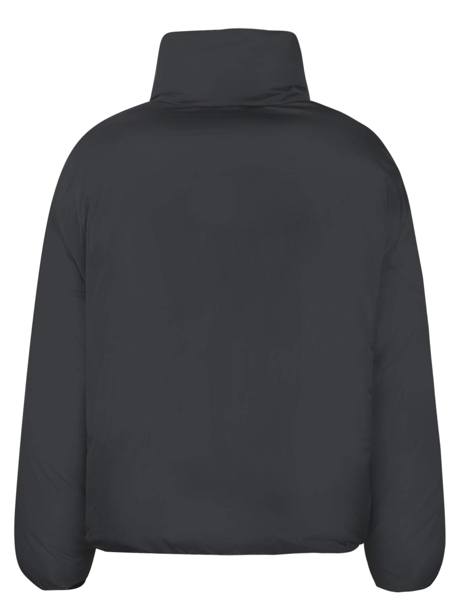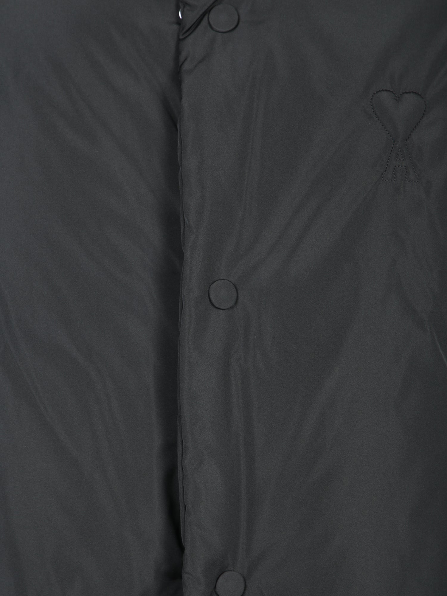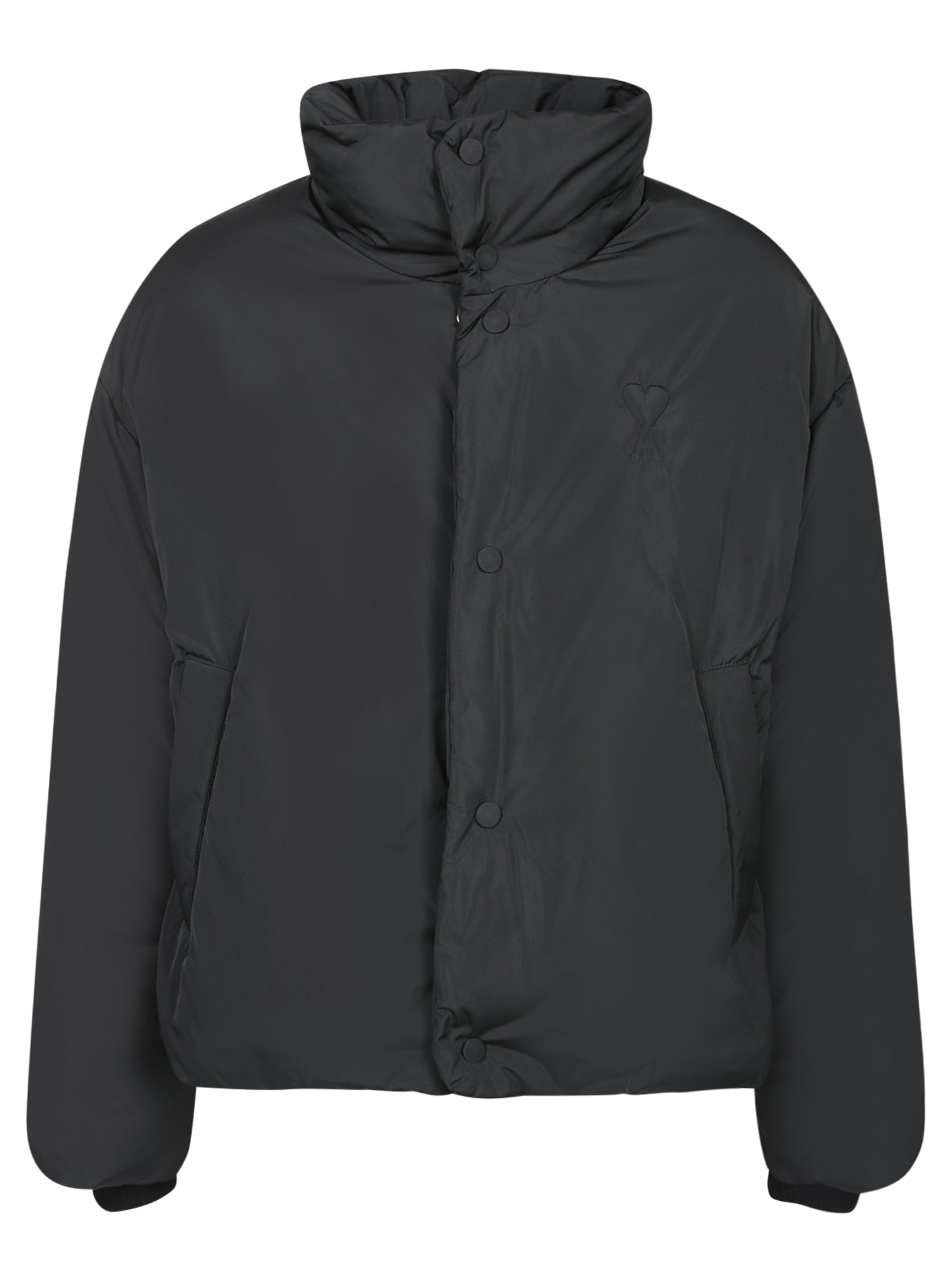 Black cropped jacket with hood and button closure. Embroidered heart-shaped logo on the chest.