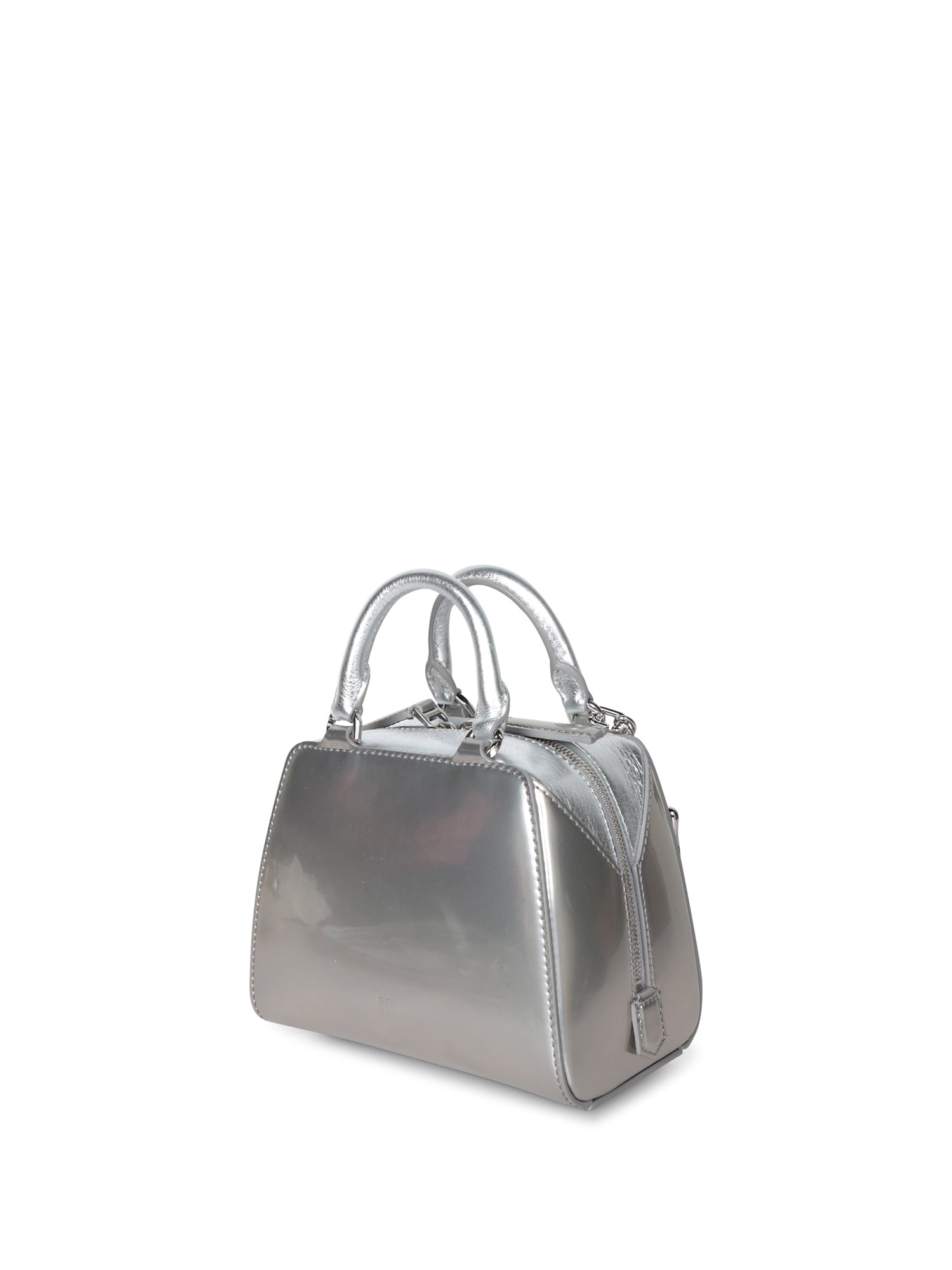 Silver laminated leather bag with strass details. Top handles and removable shoulder strap. Zip closure.