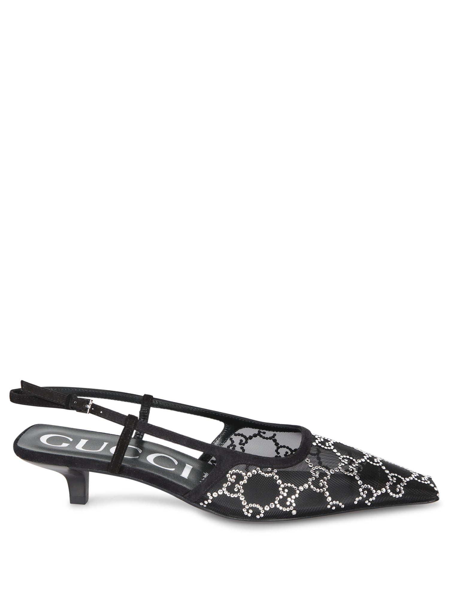 Crystal GG black mesh. Suede leather details. Leather sole. Buckle fastening to the rear. Heel height: 3.5 cm