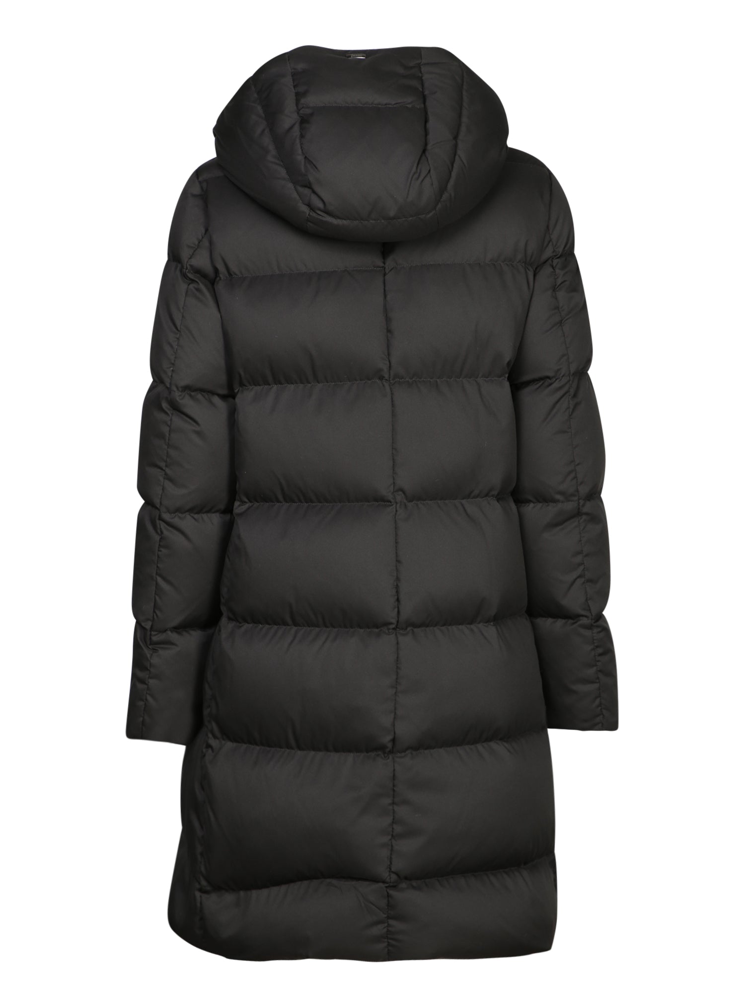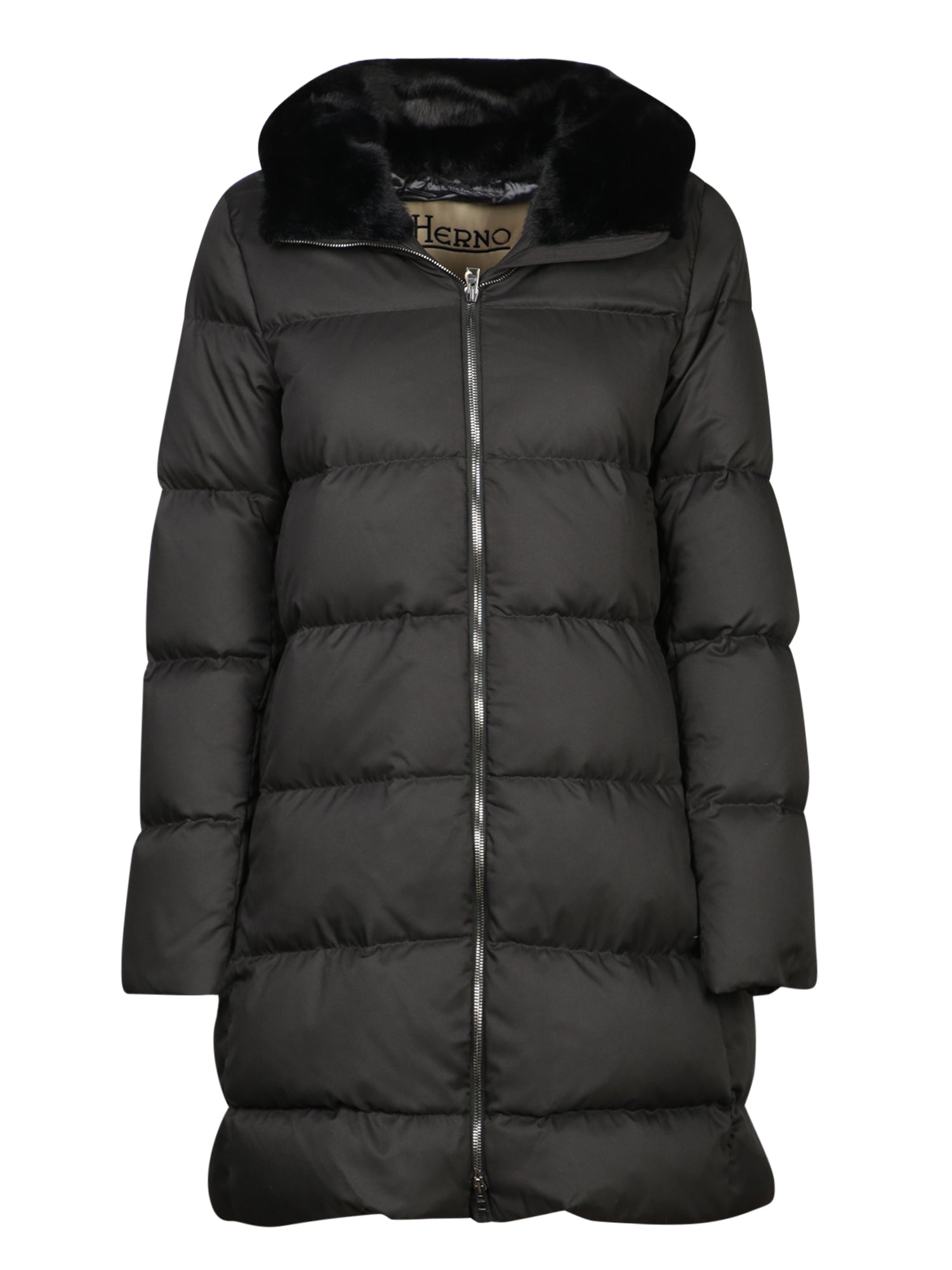 Luxury and practicality merge in this padded coat by Herno. The subdued sheen of black and synthetic fur detail on the hood add a touch of urban elegance.