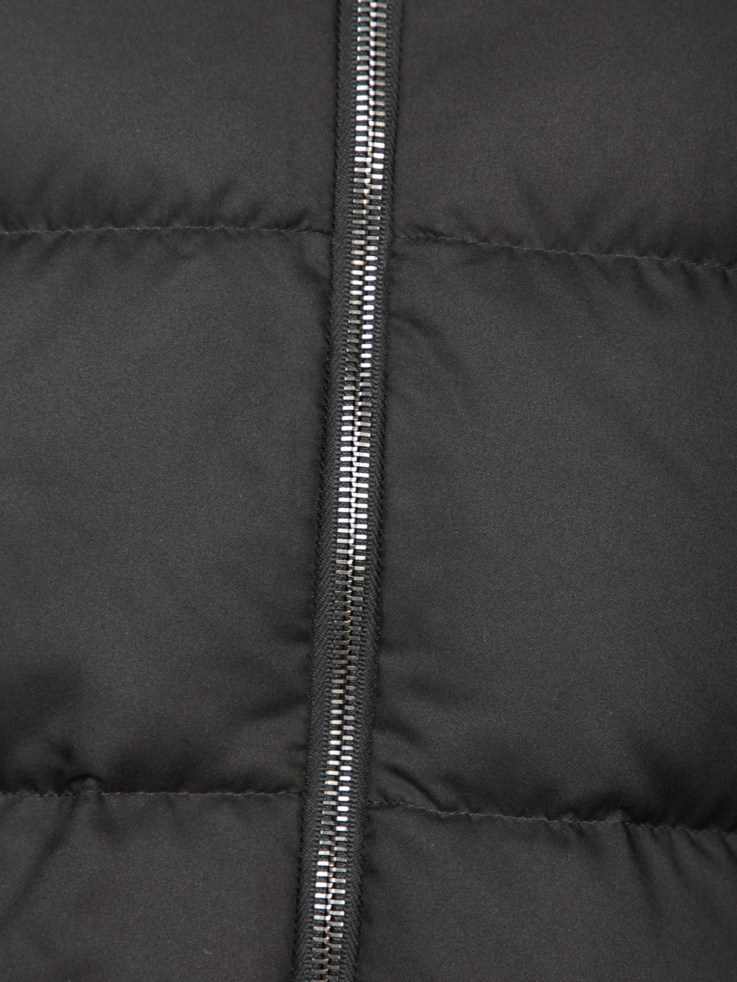 Padded coat with hood. Synthetic fur on the hood and along the central zipper. Side zip pockets.