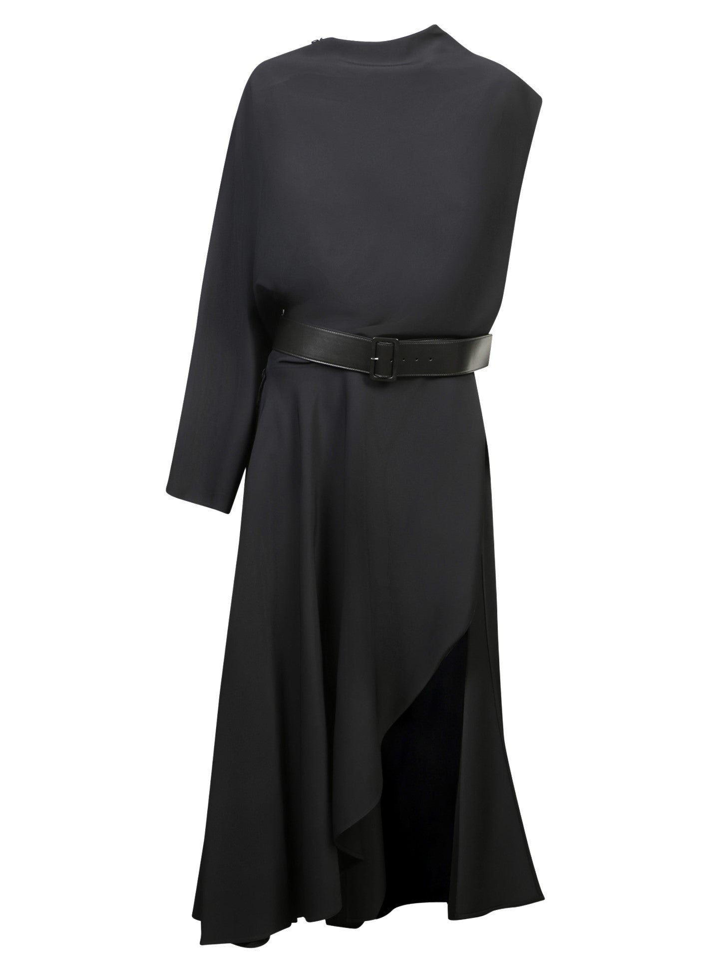 Long sleeves. Integrated adjustable belt. Asymmetric design.