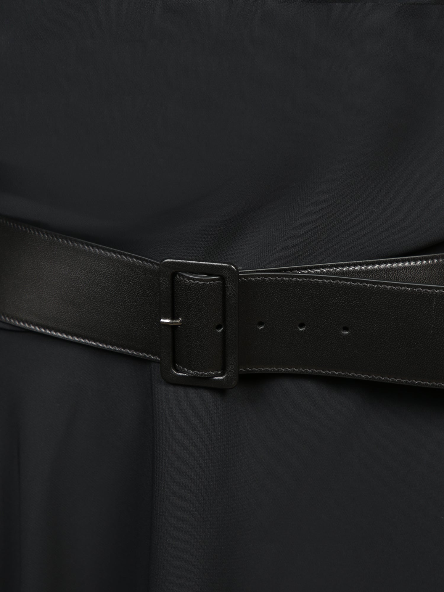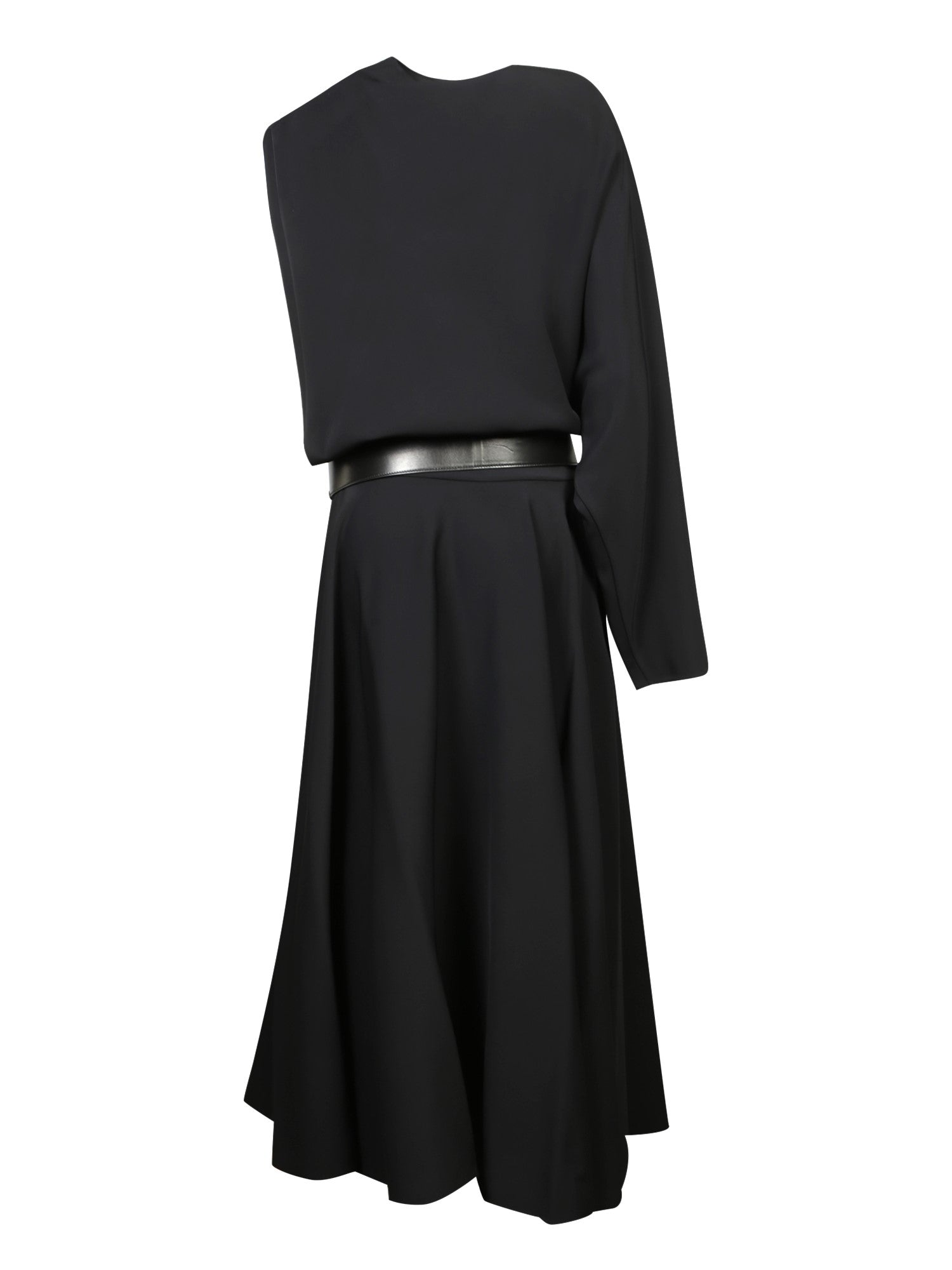 Elegant Alaïa black dress featuring an asymmetric cut and an adjustable leather belt that accentuates the silhouette. Sophisticated and versatile, ideal for formal occasions.