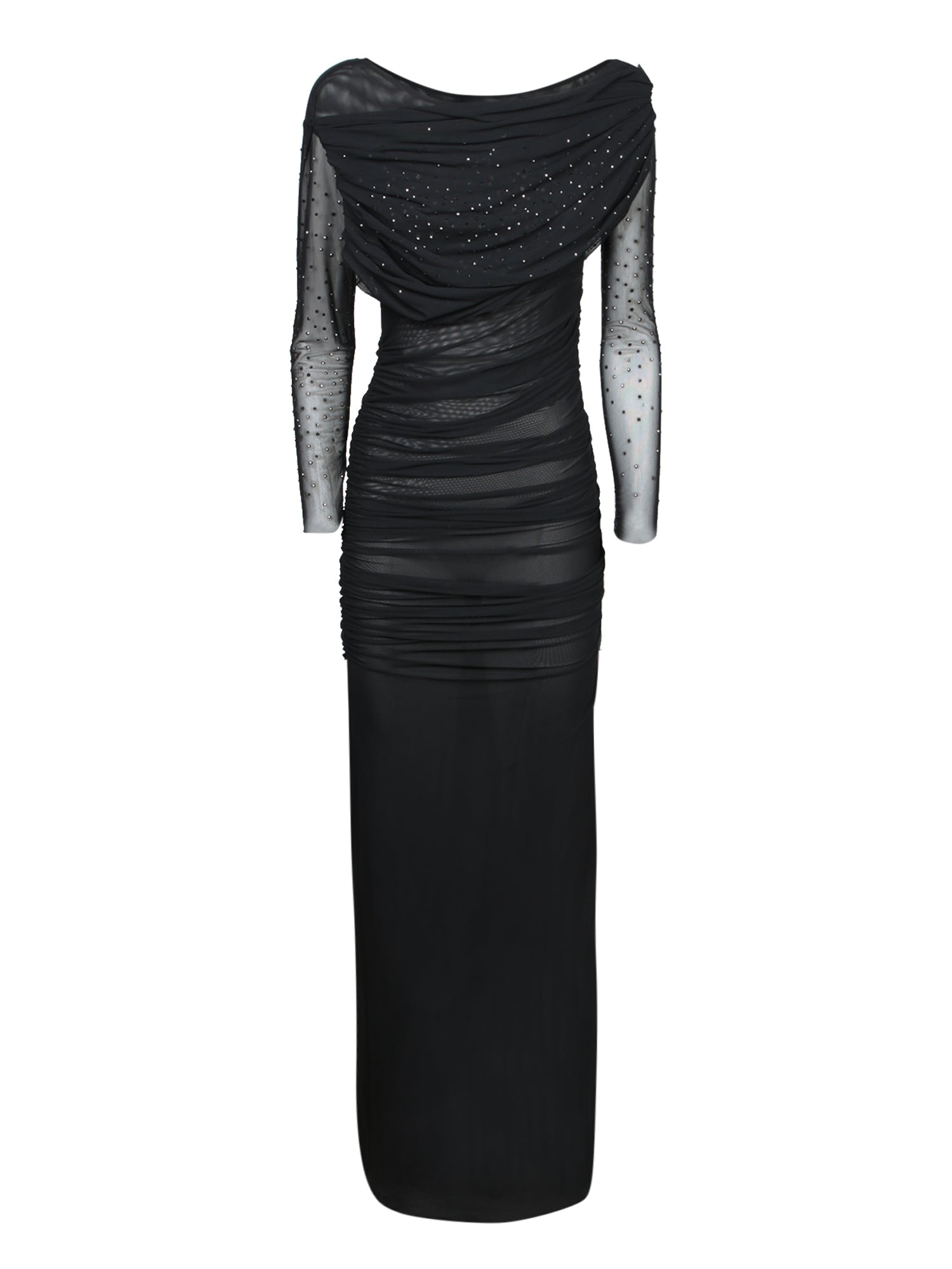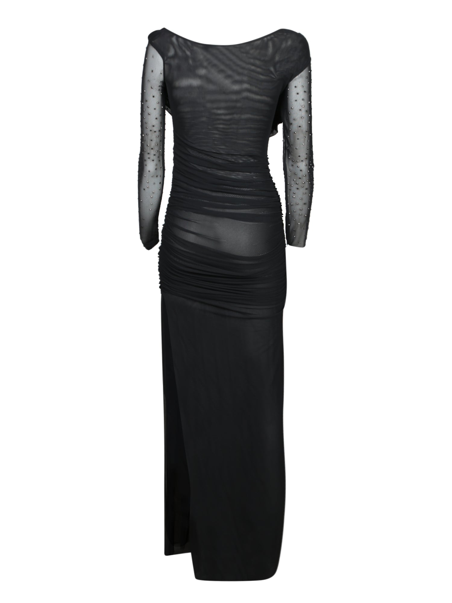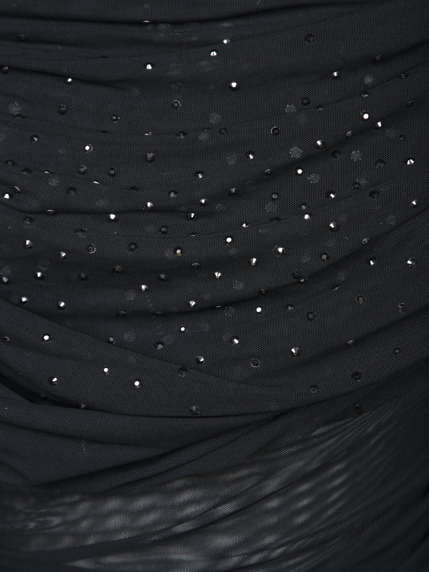 Long transparent tulle sleeves with rhinestone appliques. Draped boat neckline. Asymmetric cut.