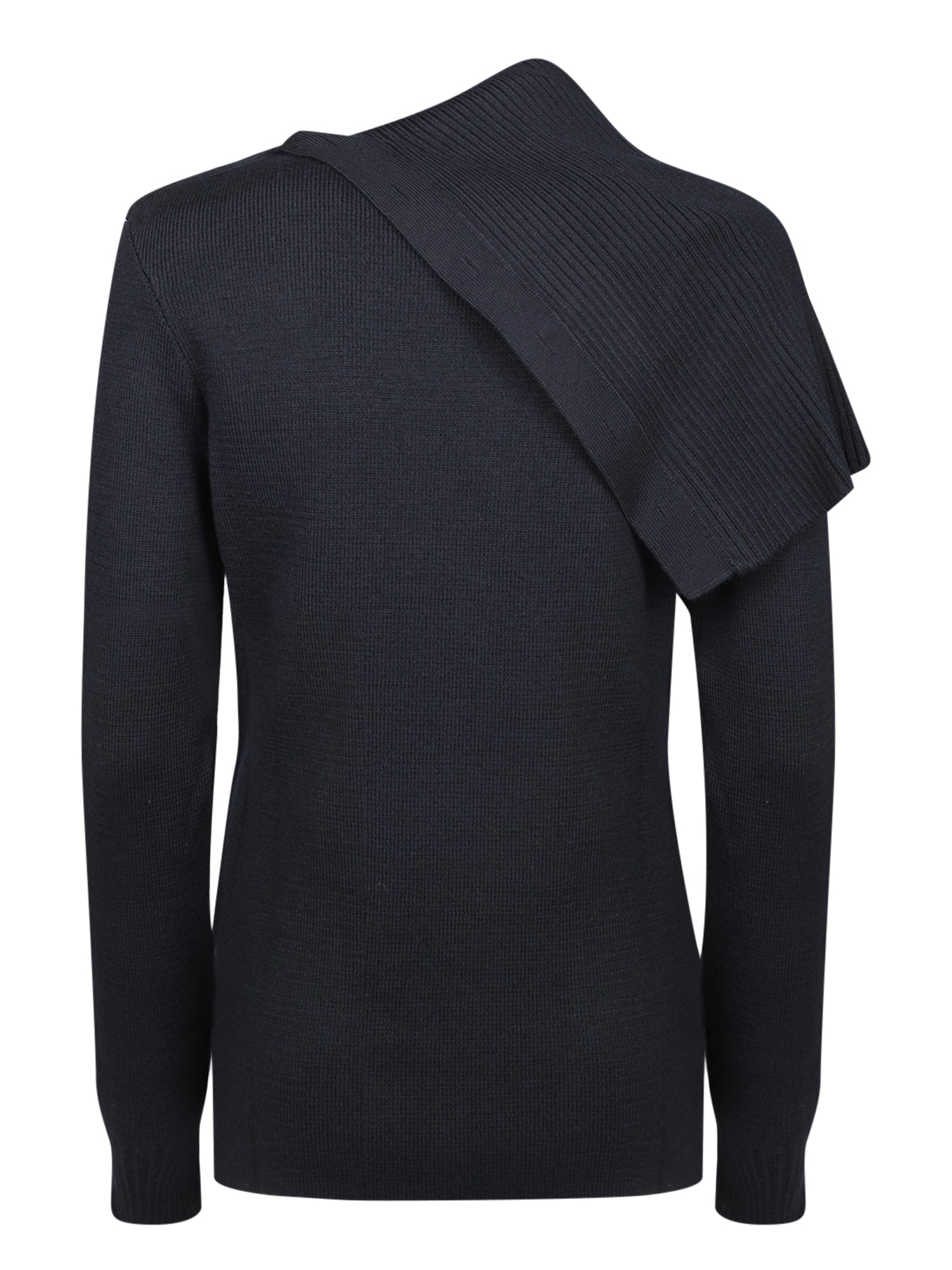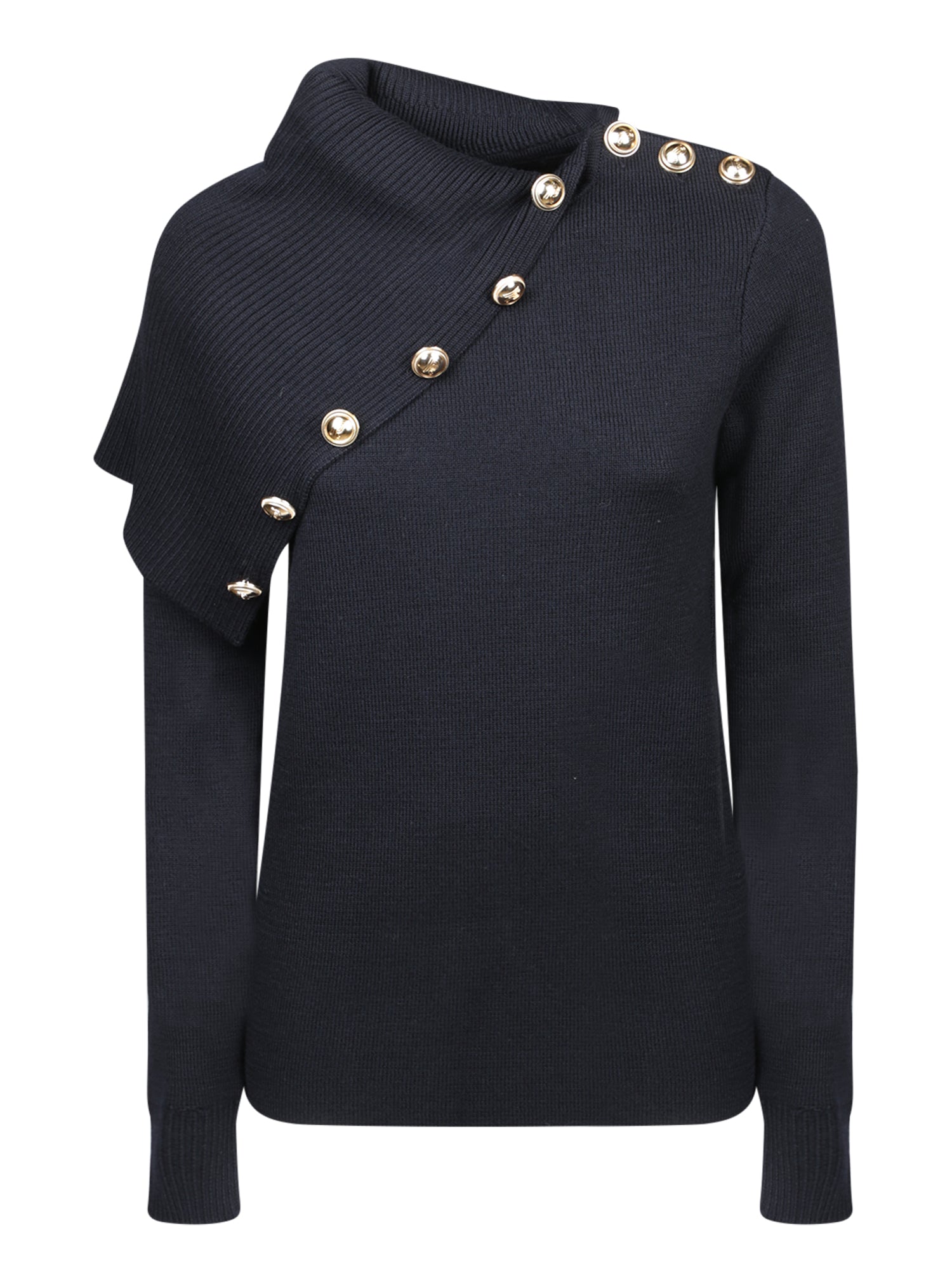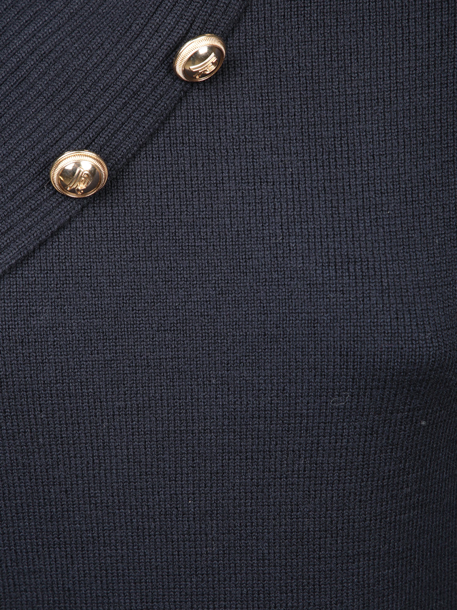 Folded high collar. Asymmetric closure with golden buttons. Long sleeves. Ribbed cuffs.