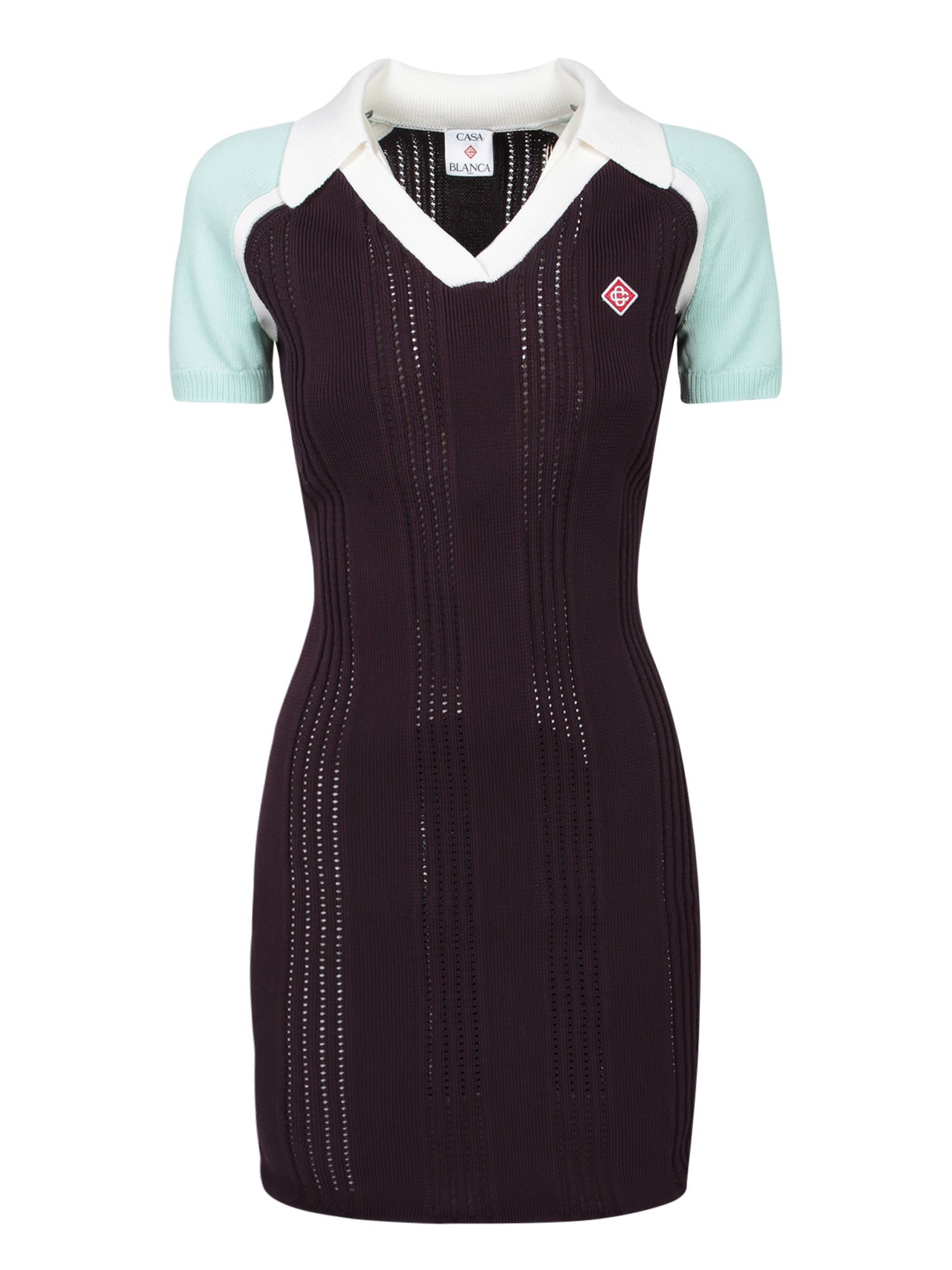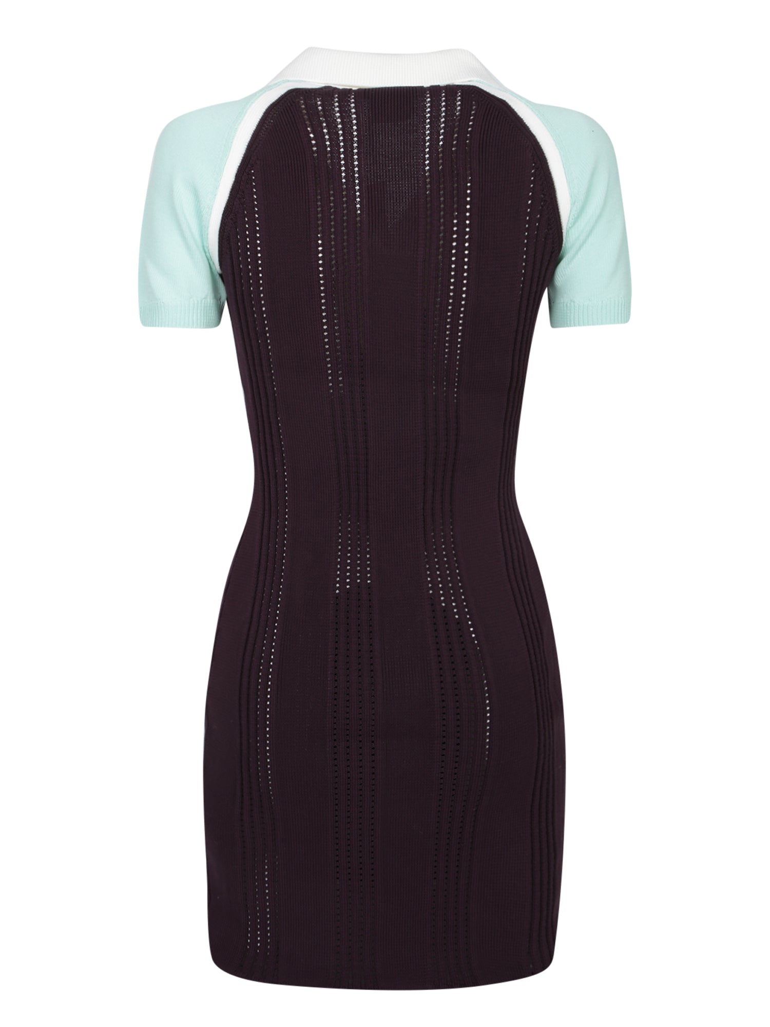 Short sleeves, contrast collar, vertical ribbed pattern.