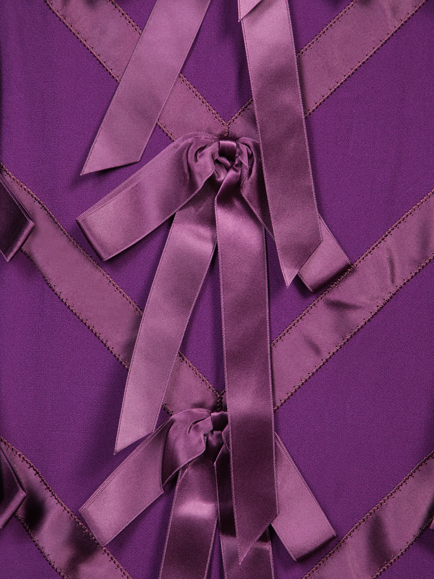 This Prada dress, crafted from fine sable fabric, is adorned with intricate bow embroidery, offering a vibrant and festive appearance. The hidden back closure ensures a clean and elegant silhouette.