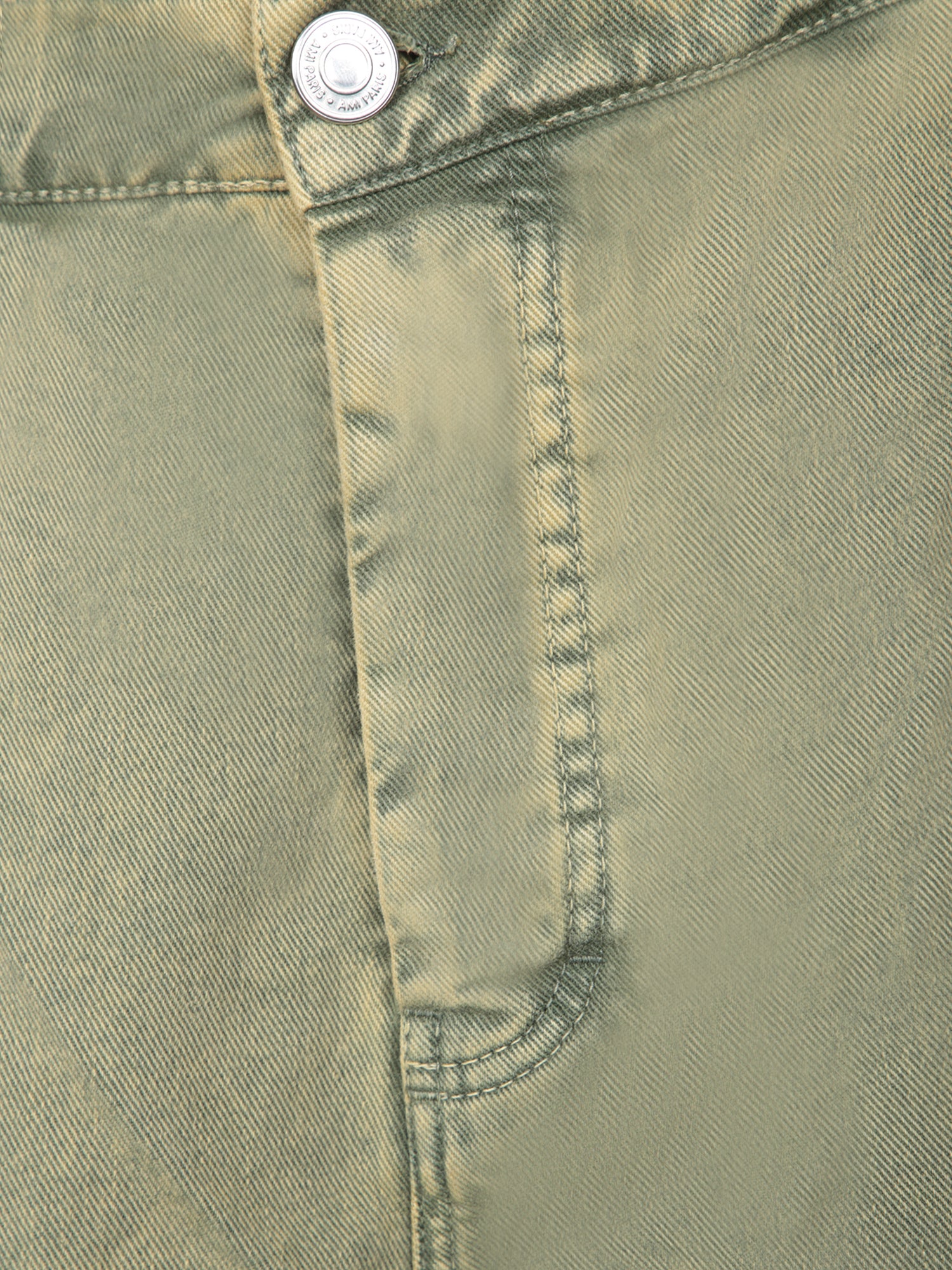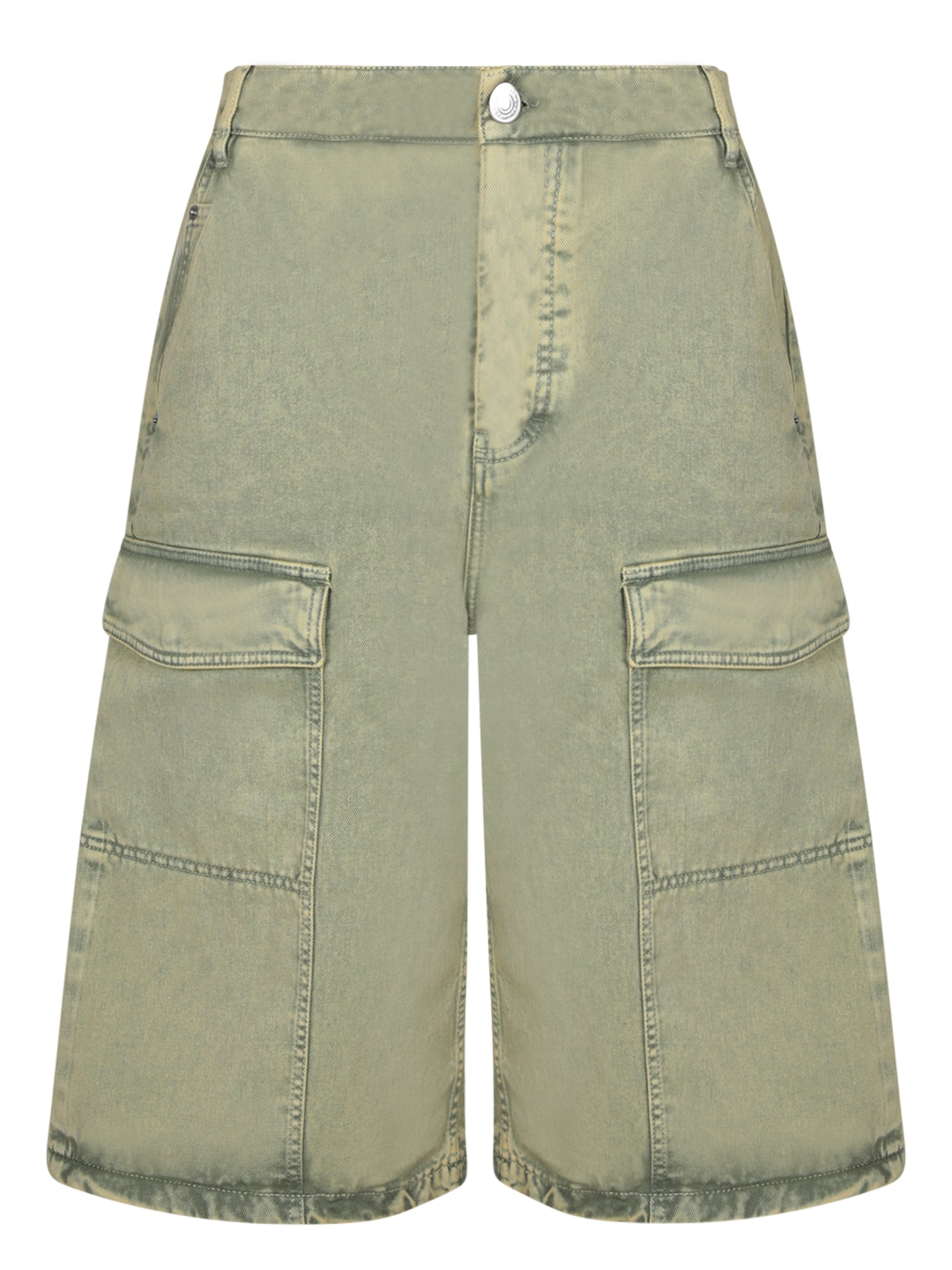 Wide fit cargo shorts. Flap side pockets. Front zip and button closure.