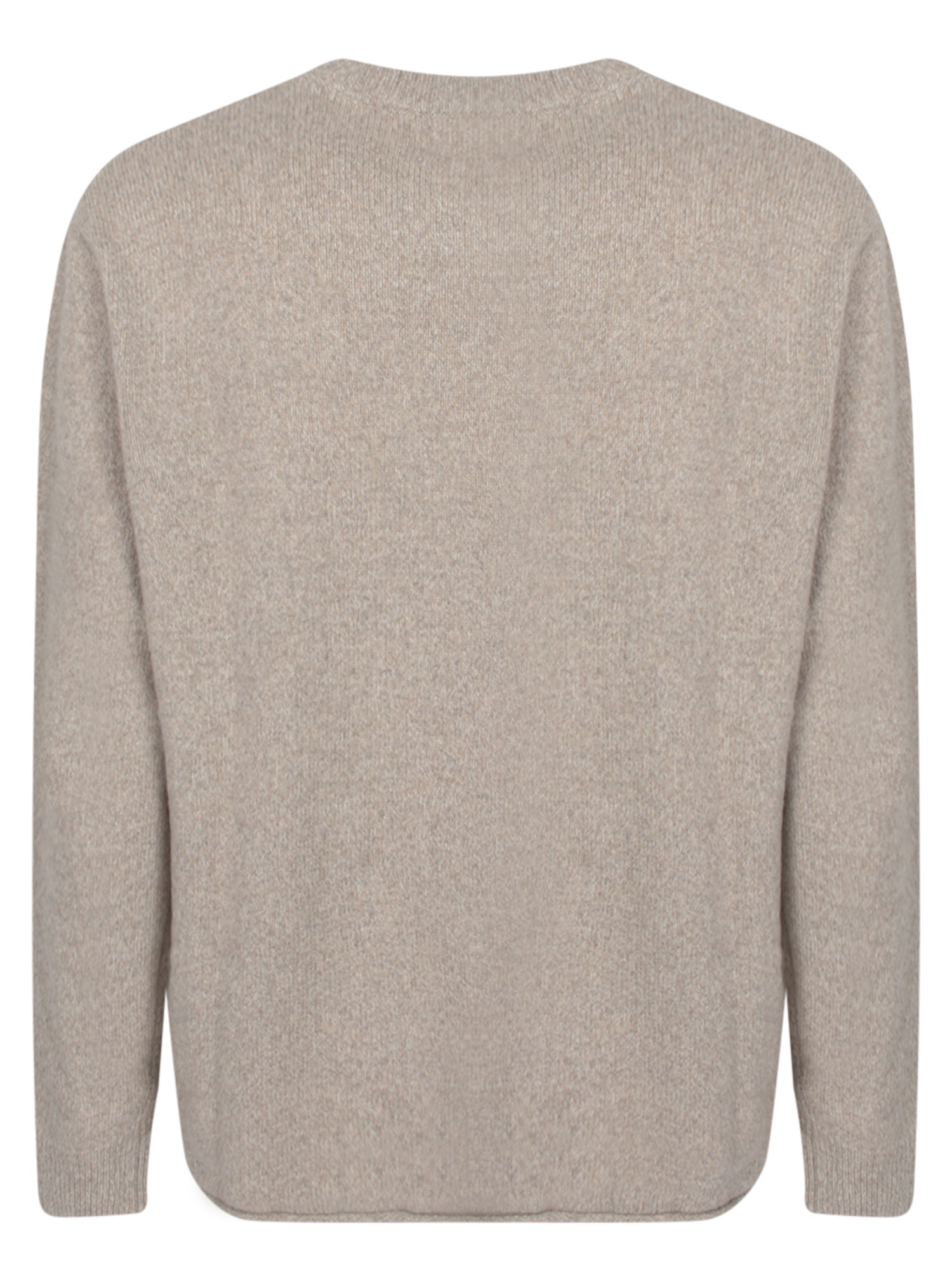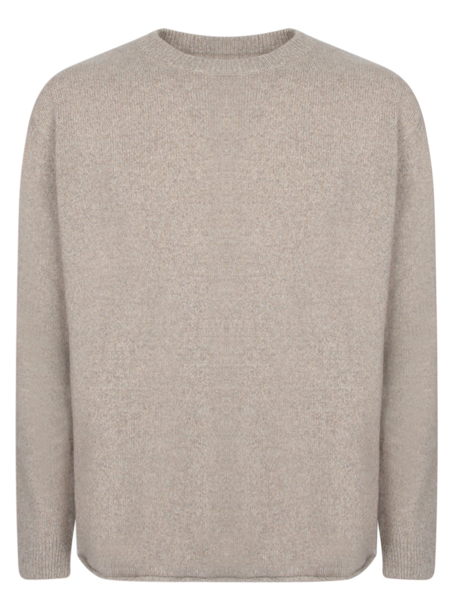 Long-sleeve cashmere sweater. Ribbed finishes on collar, cuffs, and hem.