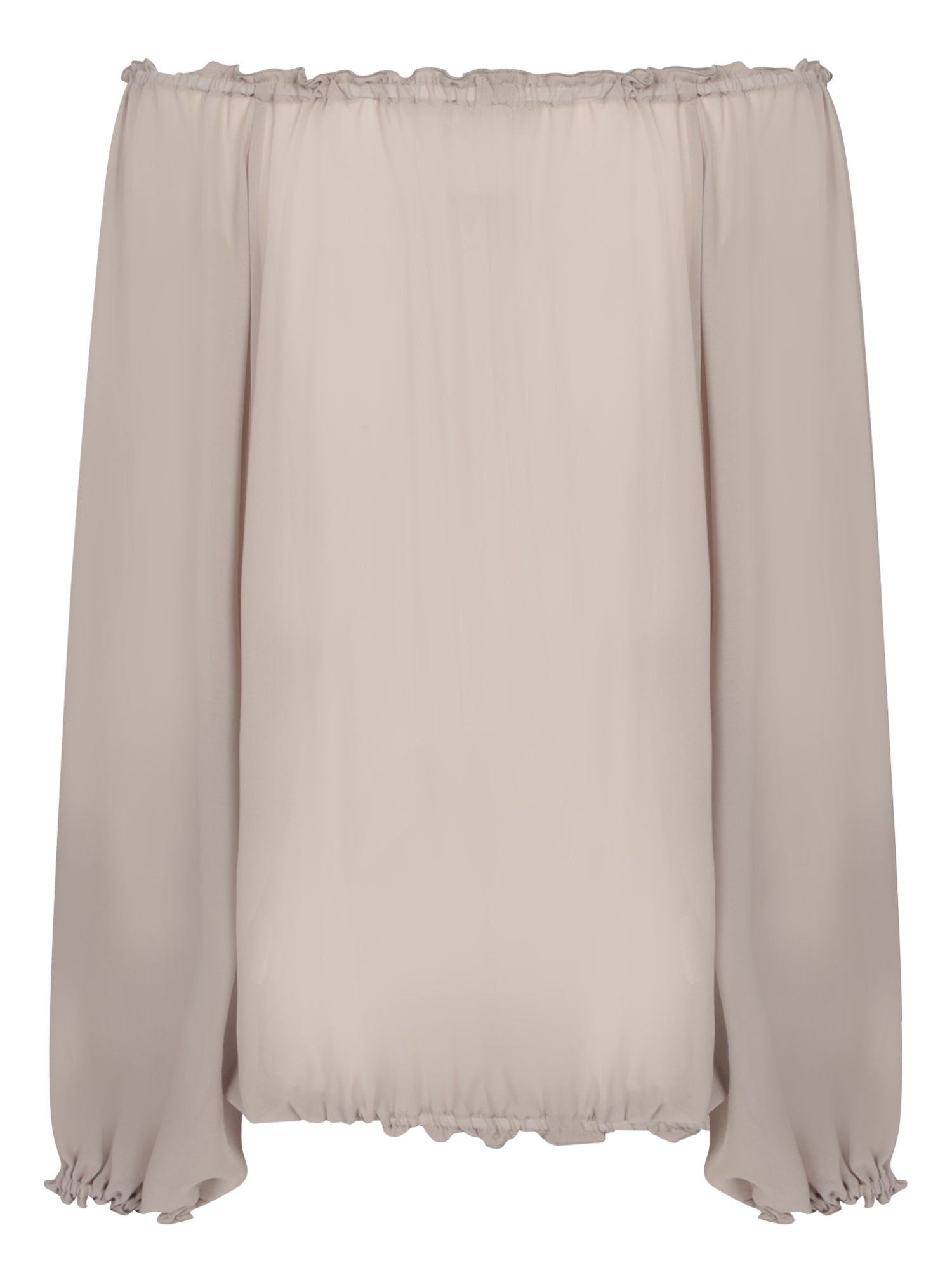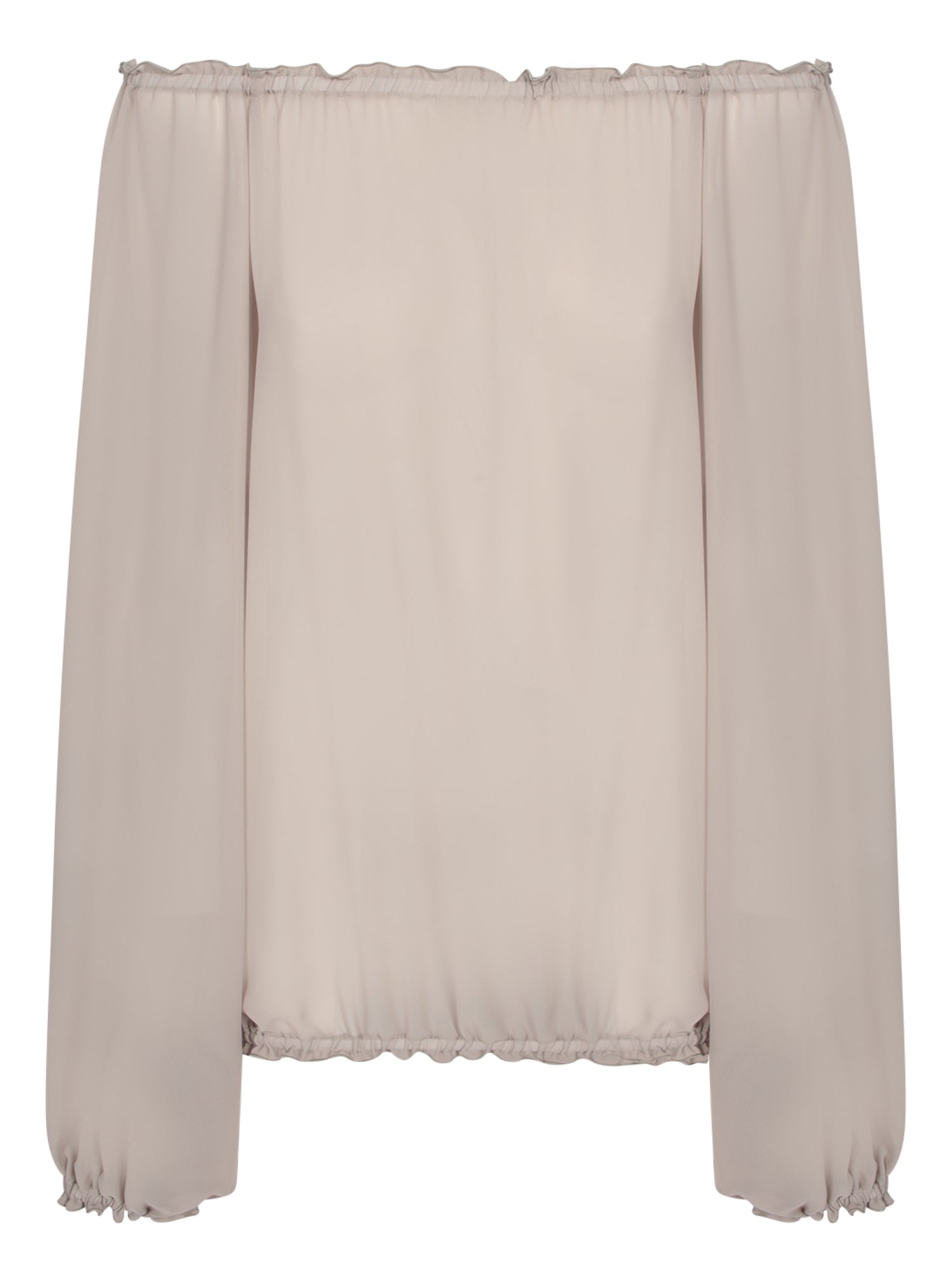 Elegant Blanca Vita blouse, featuring delicate beige georgette fabric with gathered long sleeves adding a feminine touch. Perfect for formal occasions and chic evenings.
